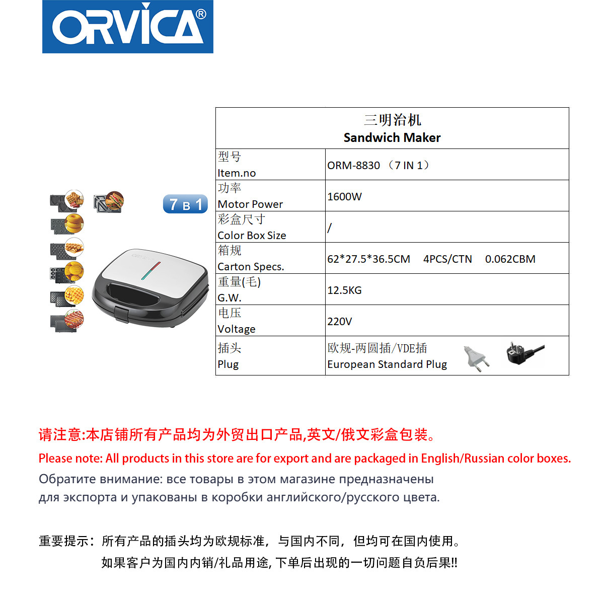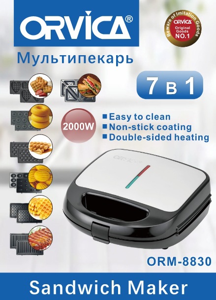 ORVICA 국경 7-in -1 샌드위치 기계 아침 기계 양면 난방 다기능 빵 와플 메이커