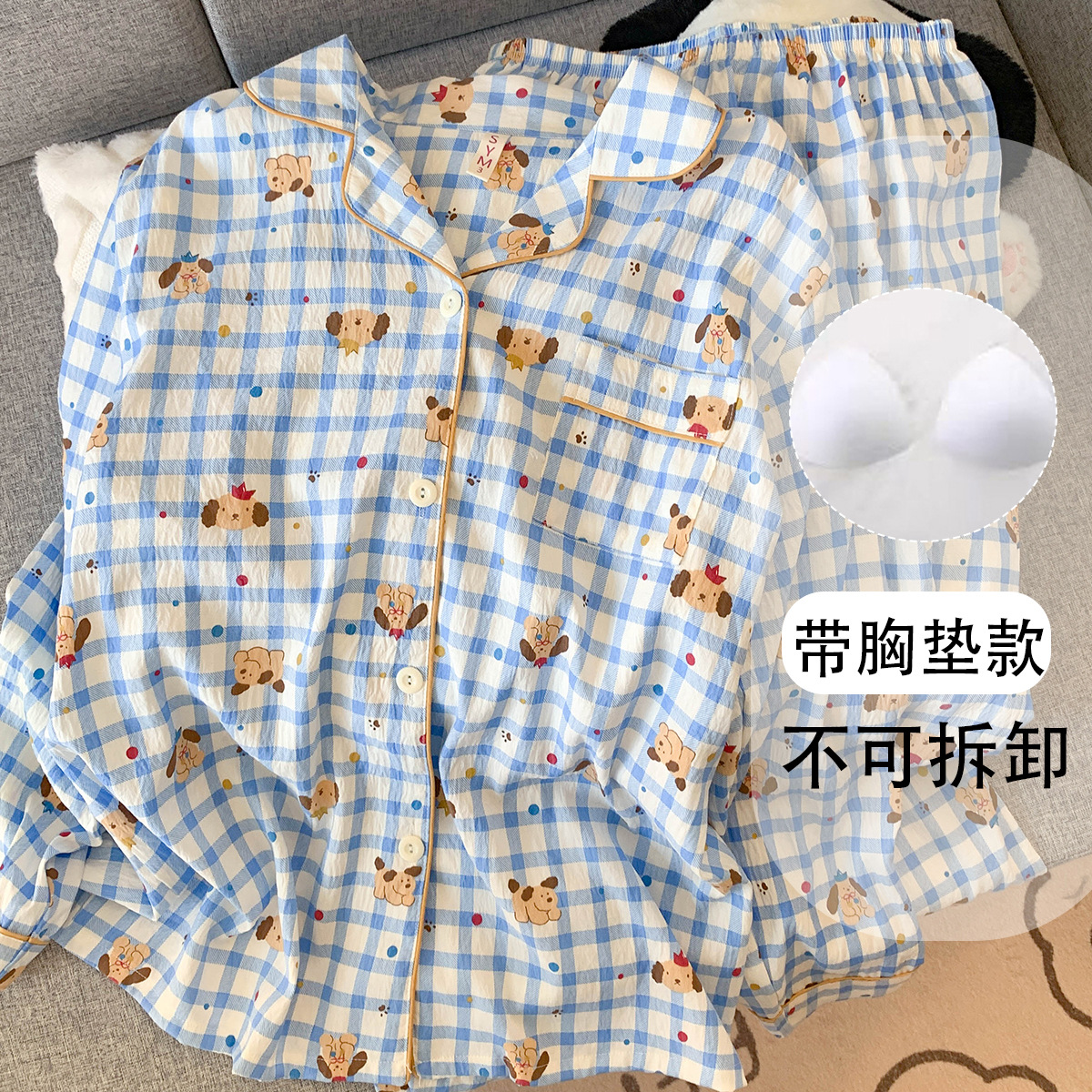• (가슴패드 없음) [Yunduo Cotton] 작은 파란색 체크무늬 (긴팔+긴바지)
