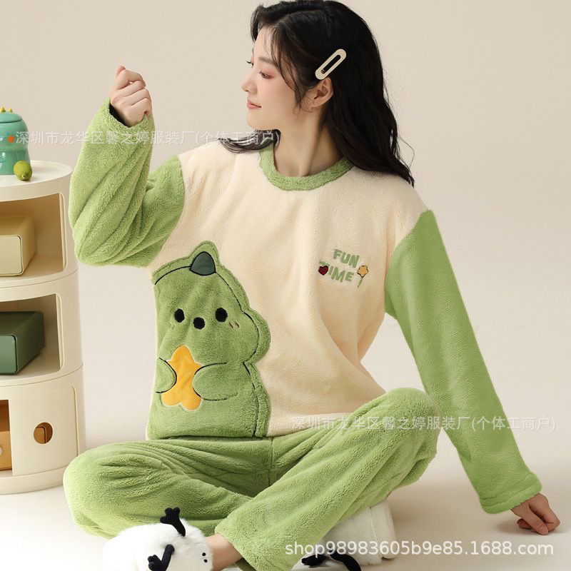 만화 달콤한 비뚤어진 곰 잠옷 여성의 가을과 겨울 산호 양털 두꺼운 느슨한 플러스 사이즈 대외 무역 국경 세트스토어 가기