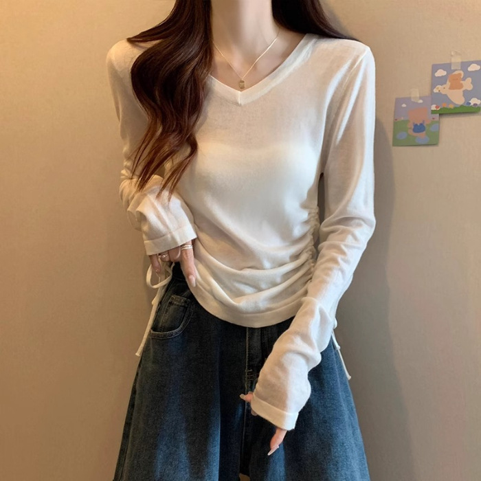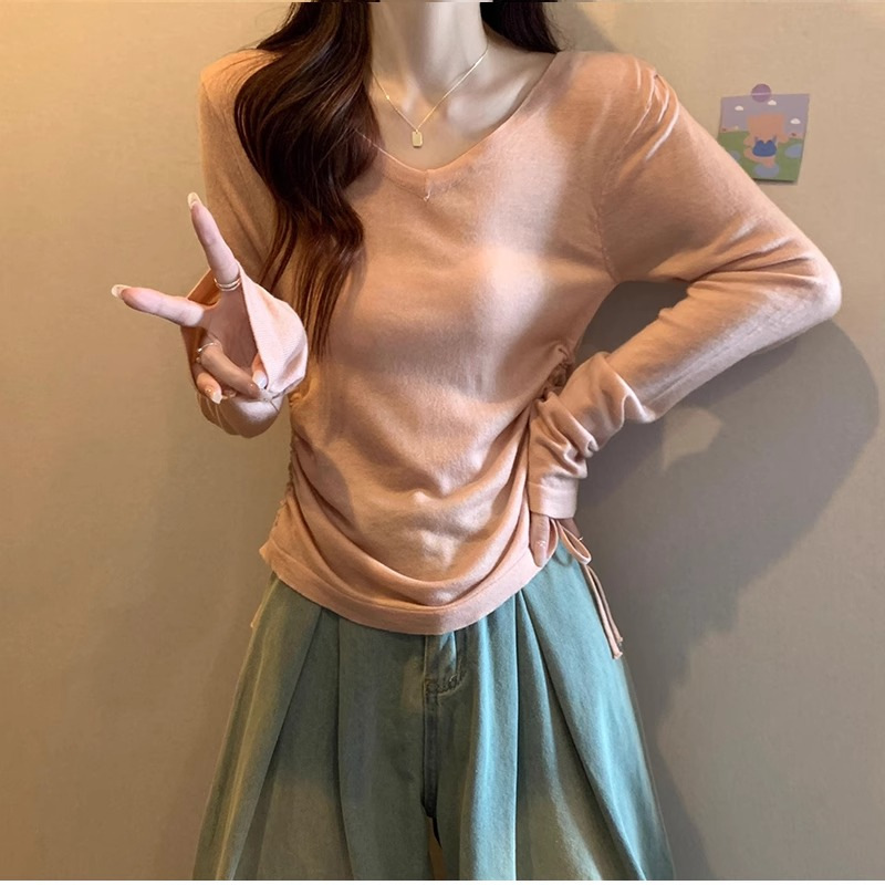[오리지널 솜씨] 긴팔 티셔츠 여성 2024 년 초가을 서양식 탑 플러스 사이즈 통통녀 허리 슬리밍베이스스토어 가기