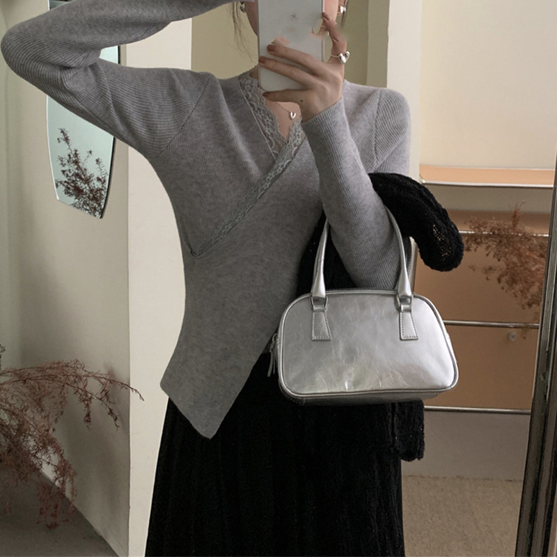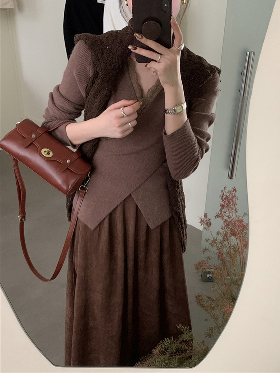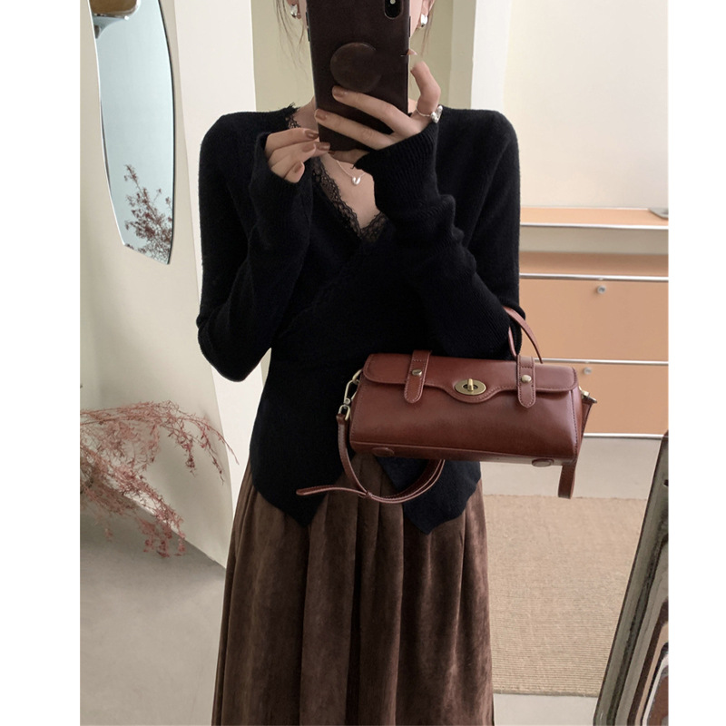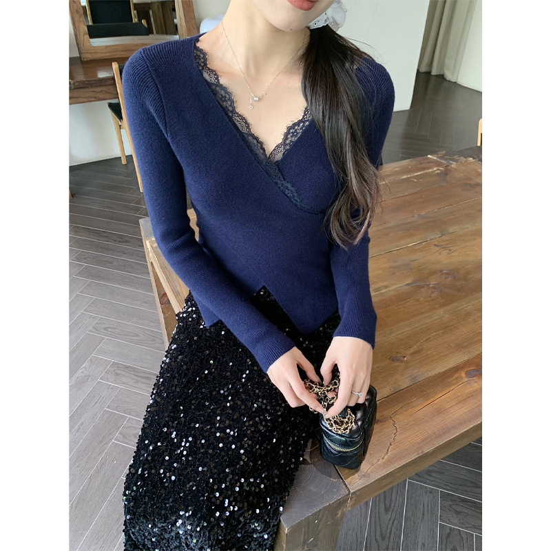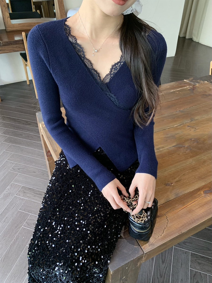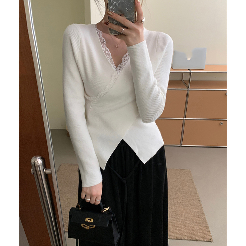올해의 인기있는 아름다운 크로스 니트 셔츠 여성의 가을과 겨울 새로운 탑 레이스 스티칭 v-neck 스웨터스토어 가기