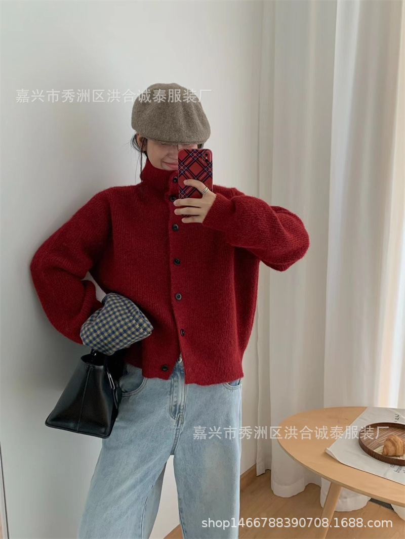 프렌치 레트로 그레이 하이넥 스웨터 재킷 여성용 2025 가을 겨울 신상 한국 스타일 루즈핏 레이지 스타일 니트 가디건