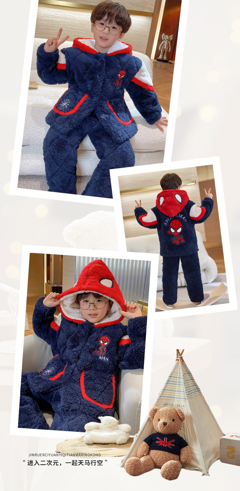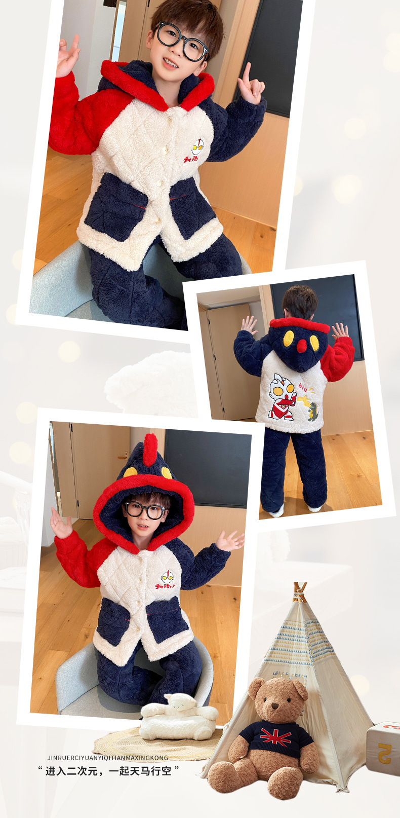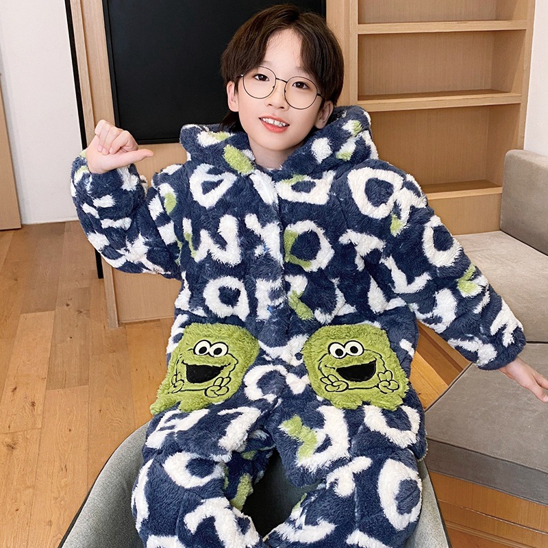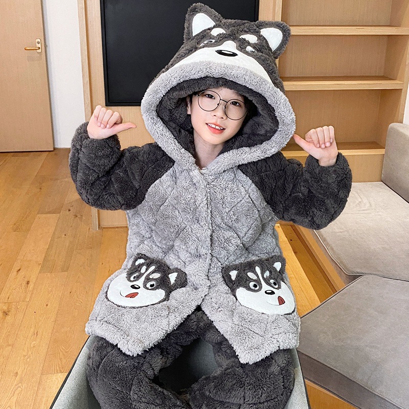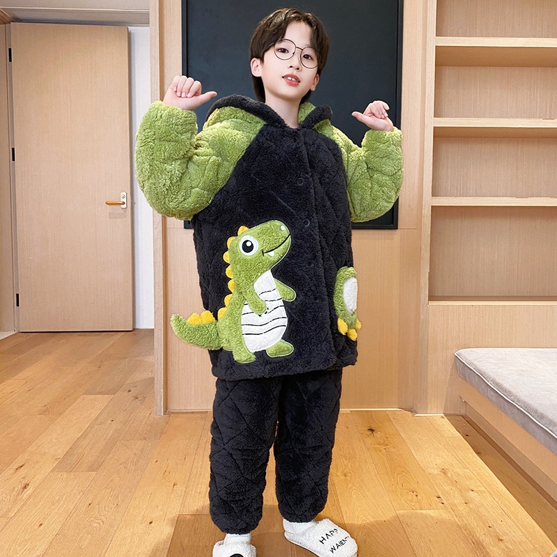 겨울 어린이 플란넬 파자마 소년의 3 층 두꺼운 퀼트 산호 양털 홈 옷 소년의 따뜻한 세트