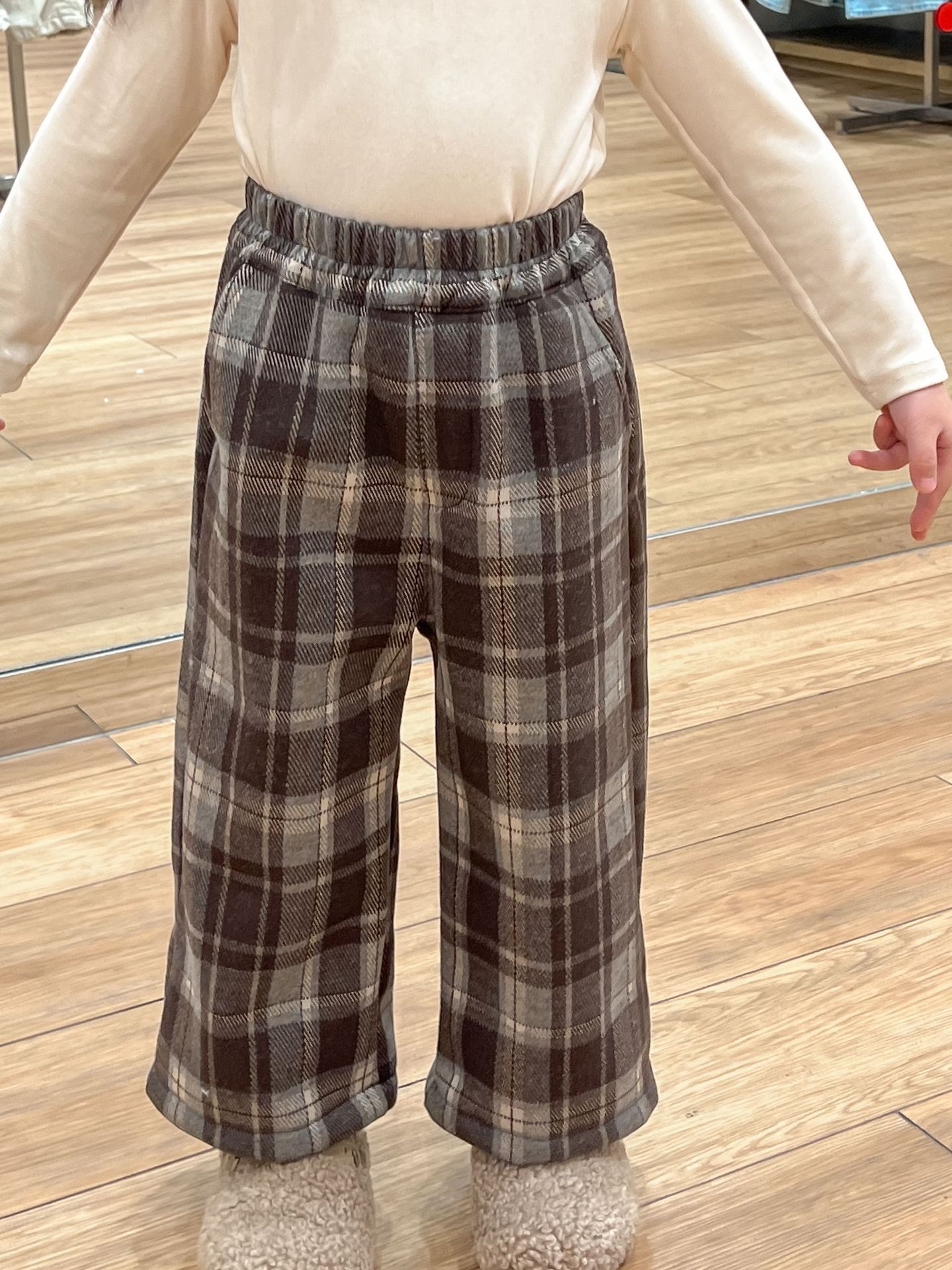• 브라운 체크 무늬 플리스 팬츠