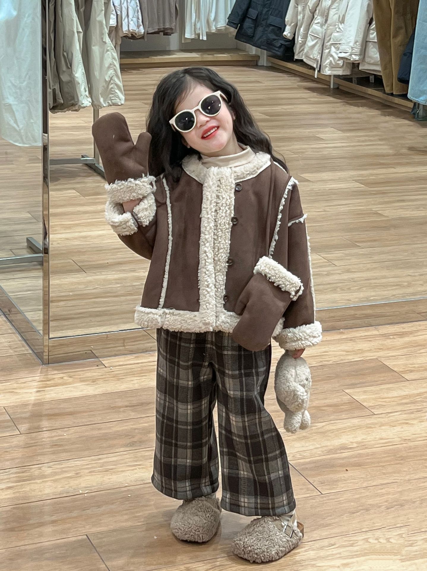 2024 겨울 새로운 한국 아동복 소녀 둥근 목 스티칭 스웨이드 코트 빈티지 체크 무늬 벨벳 바지스토어 가기
