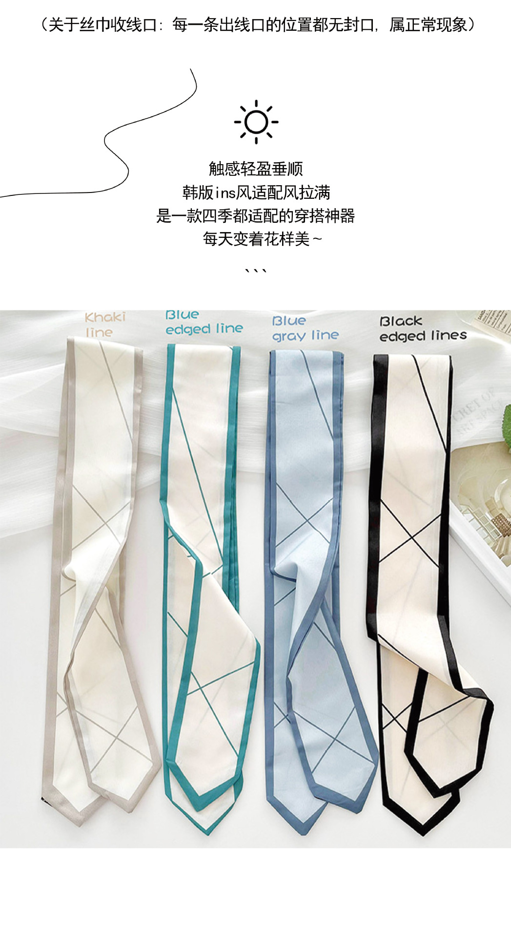 한국식 올매치 실크 스카프 좁은 긴 작은 실크 스카프 간단한 라인 타이 헤어 타이 백 동반 행사 장식 리본 스카프스토어 가기