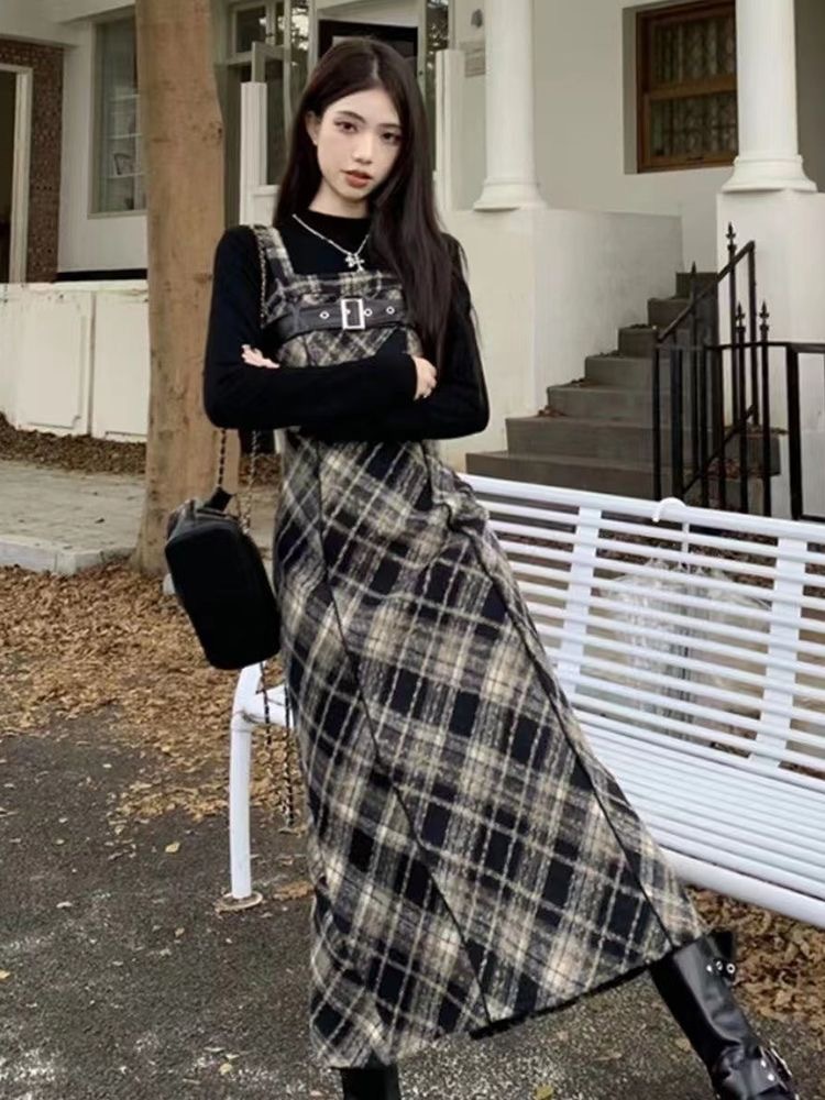 검은 부자 가족 딸 원피스 멋진 내부 스트랩 원피스 여성의 봄과 가을 원피스 세트 투피스 롱 원피스스토어 가기
