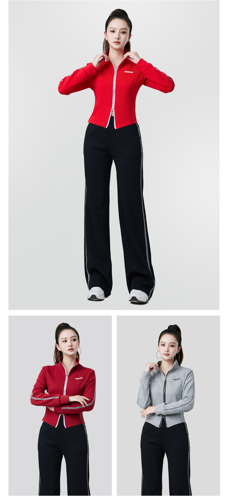 • 회색 재킷 + 빨간색 바지