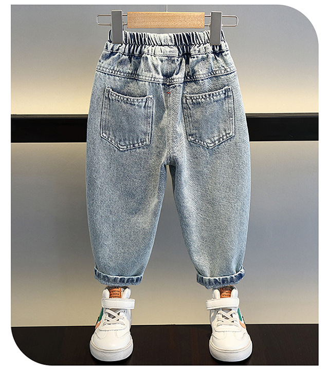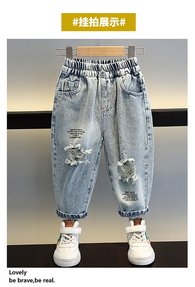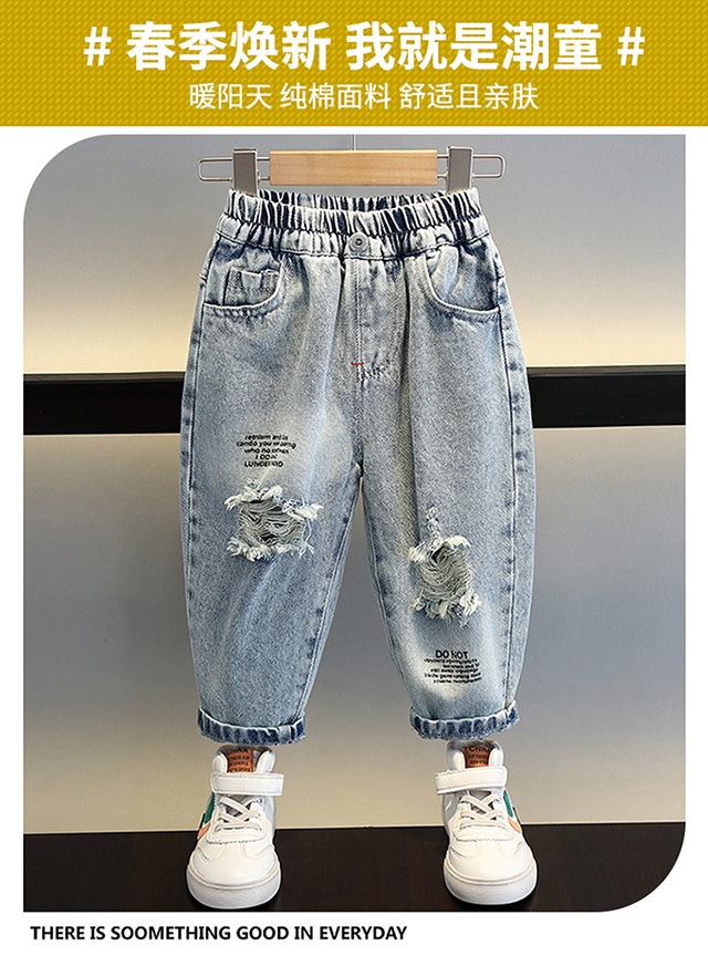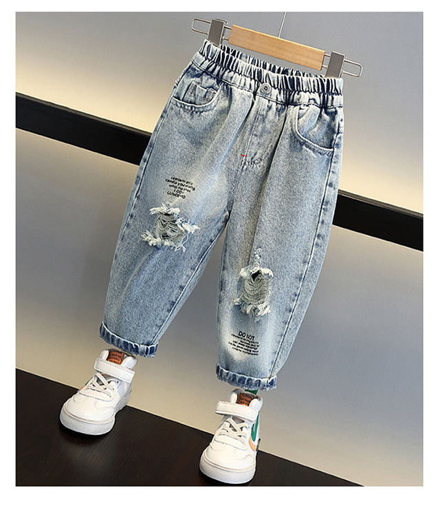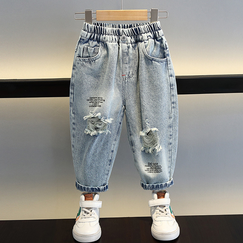 소년의 씻은 찢어진 청바지 2024 새로운 멋진 잘 생긴 아이들의 아기 봄과 가을 서양 스타일 어린 소년 트렌디 바지스토어 가기