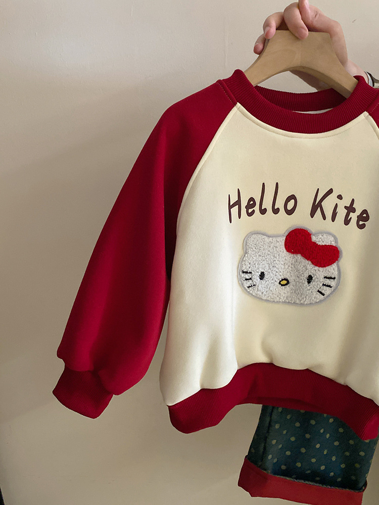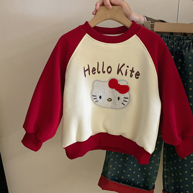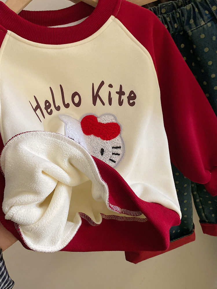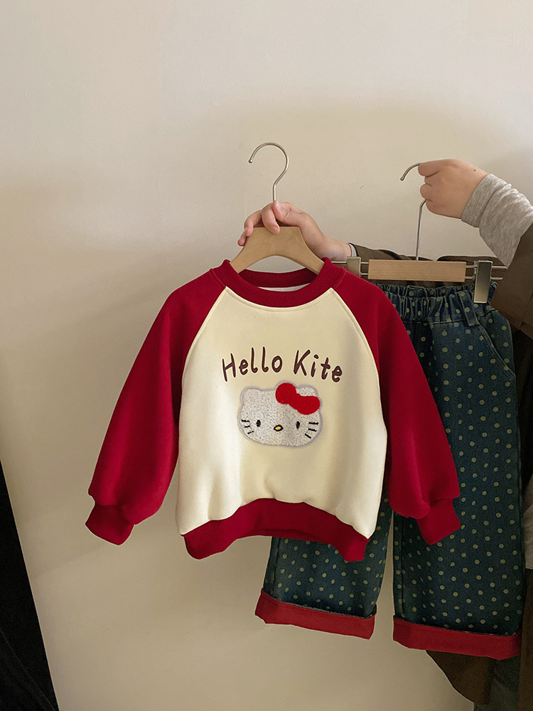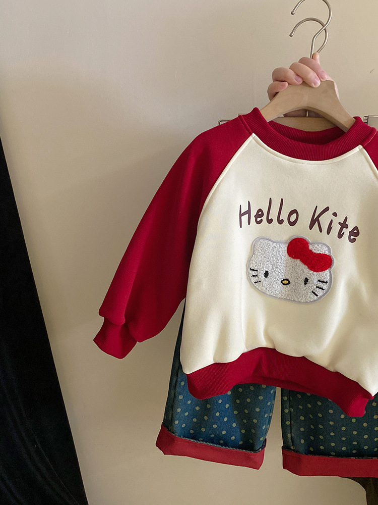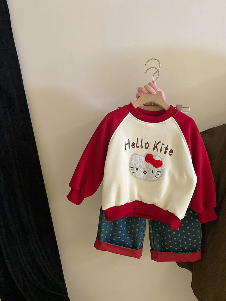 여자 한국 귀여운 KT 고양이 컬러 매칭 기모 스웨터 2024 가을과 겨울 뉴 웨이브 도트 기모 청바지 세트 조수스토어 가기