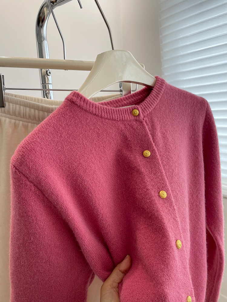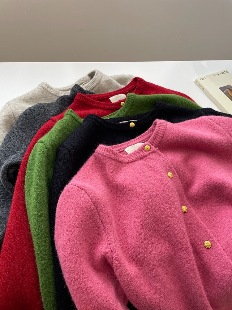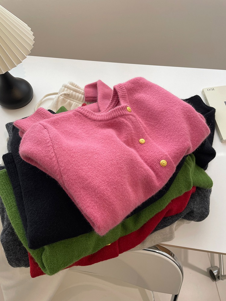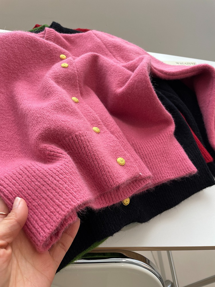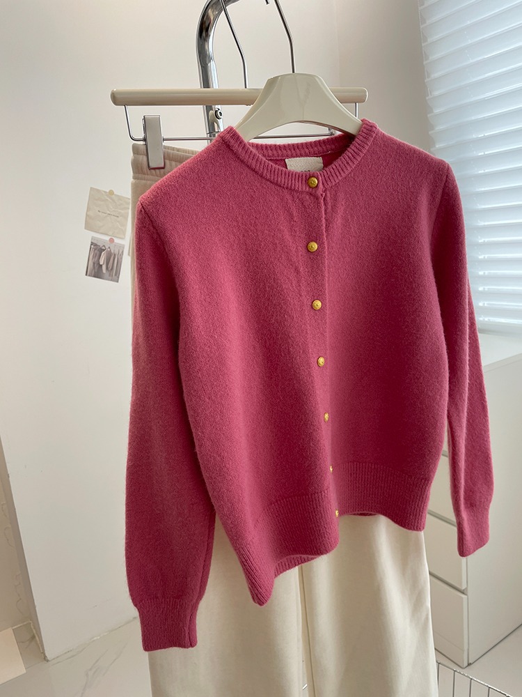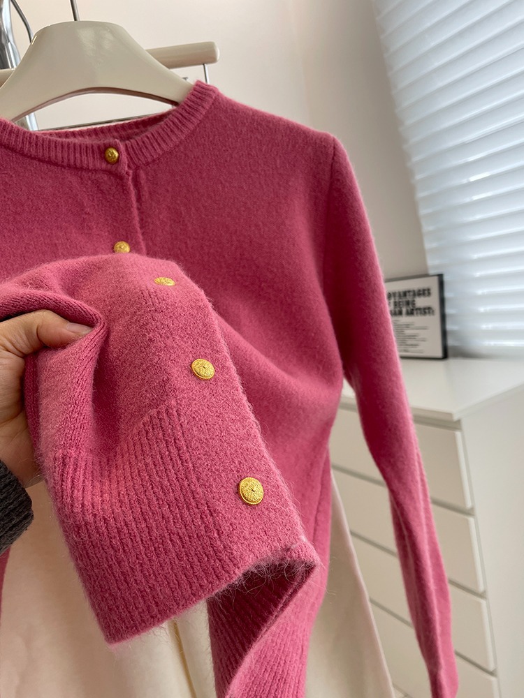 화이트 라즈베리 파우더 작은 골드 버튼 니트 카디건 여성을 보여주세요! 가을과 겨울 한국 소프트 왁스 두꺼운 따뜻한 크루 넥 스웨터 재킷