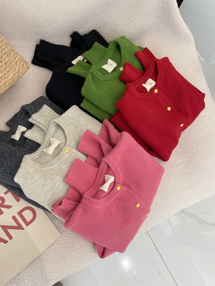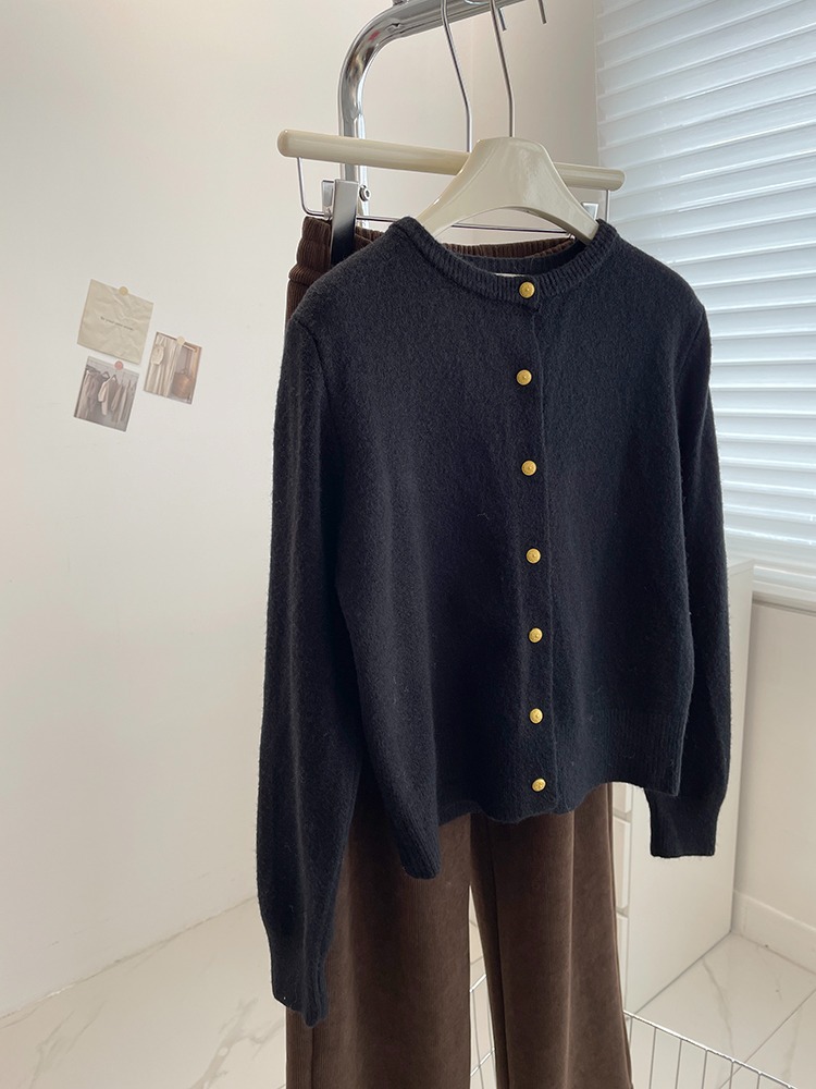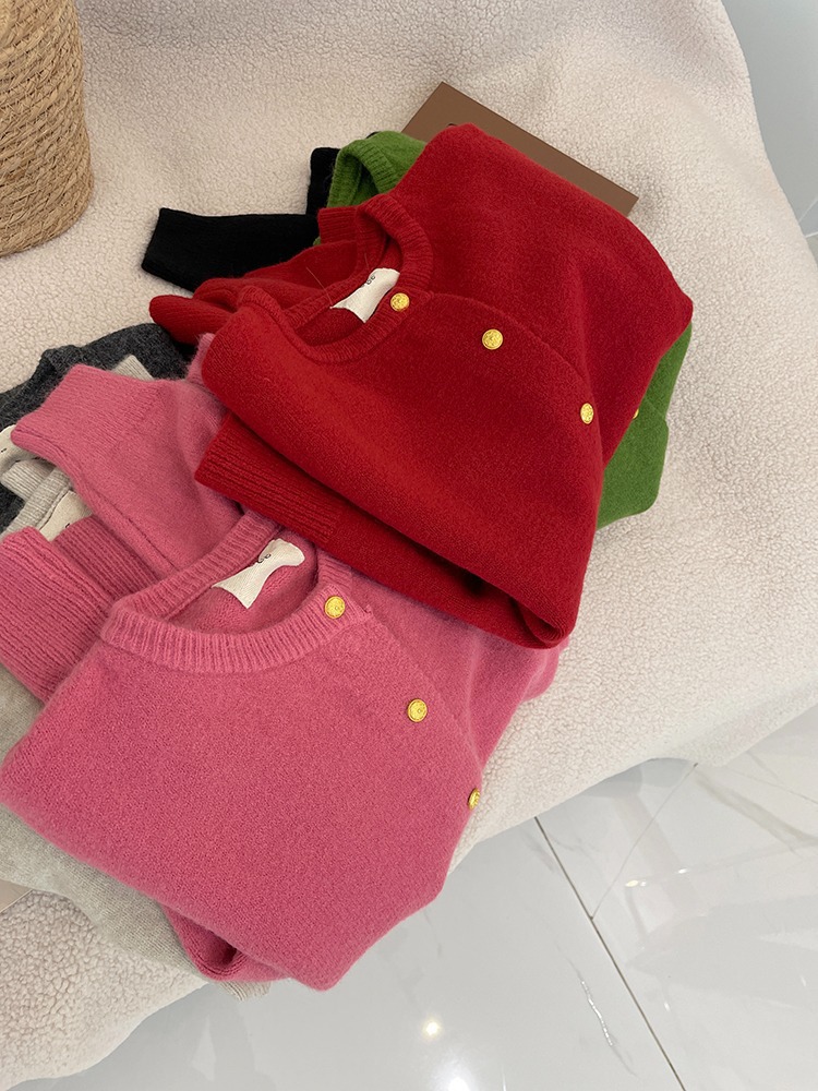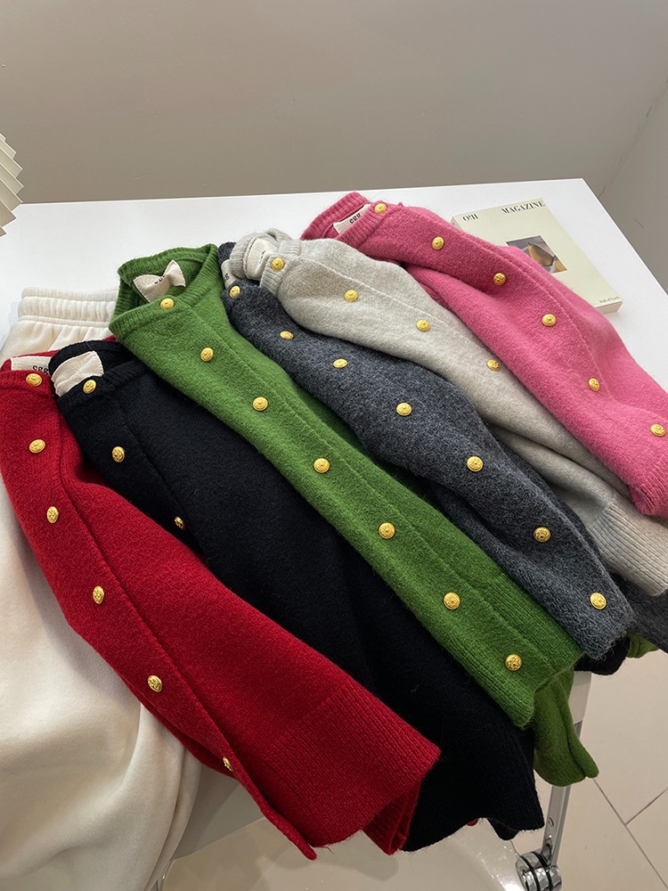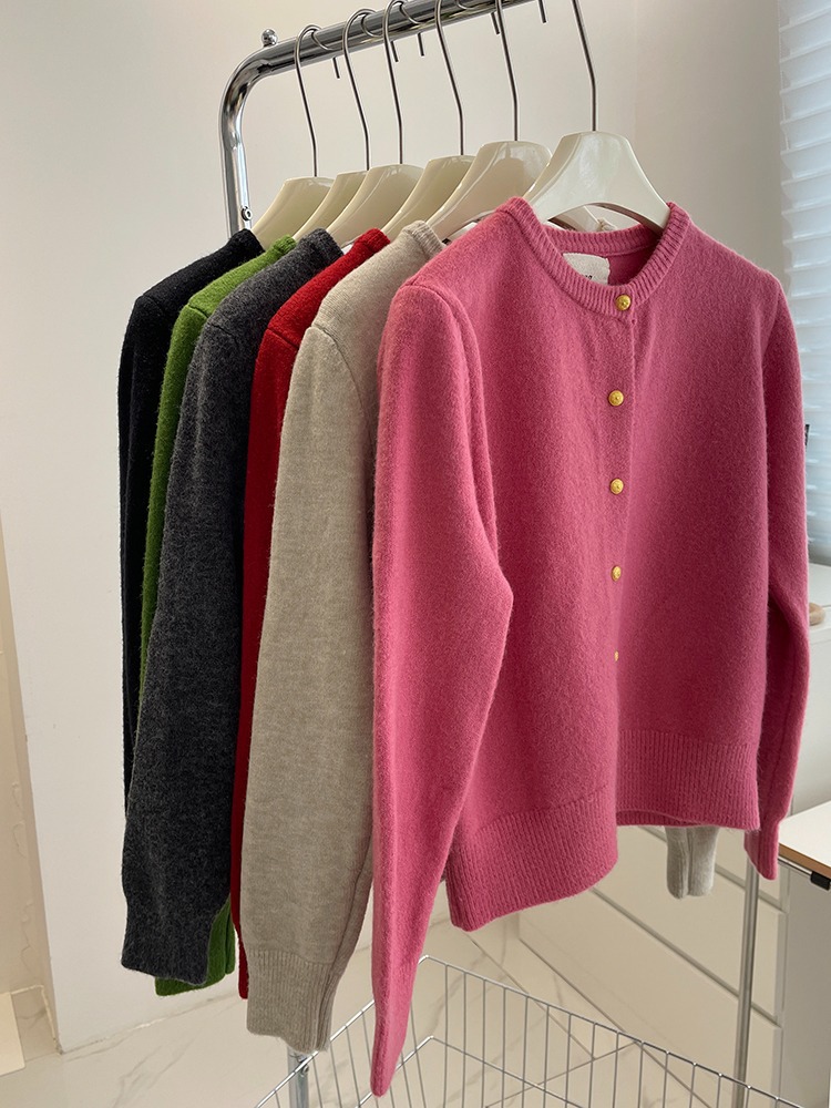 화이트 라즈베리 파우더 작은 골드 버튼 니트 카디건 여성을 보여주세요! 가을과 겨울 한국 소프트 왁스 두꺼운 따뜻한 크루 넥 스웨터 재킷