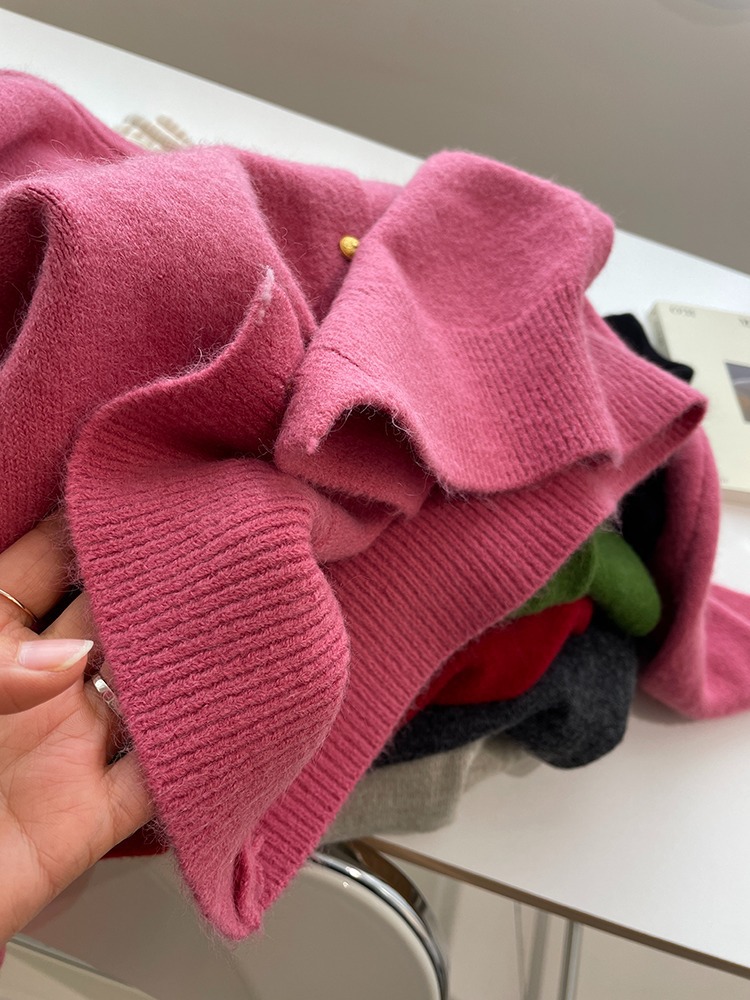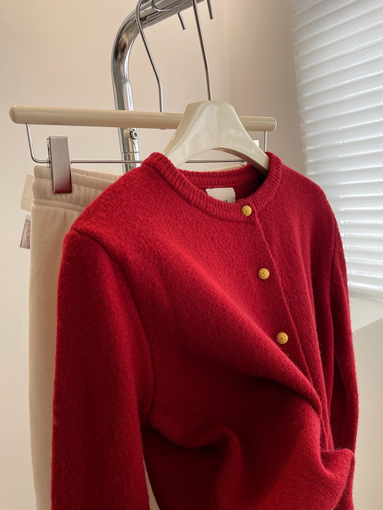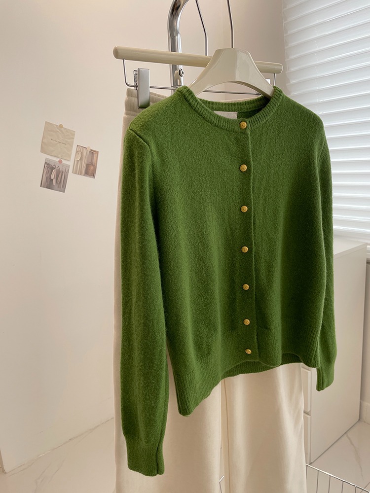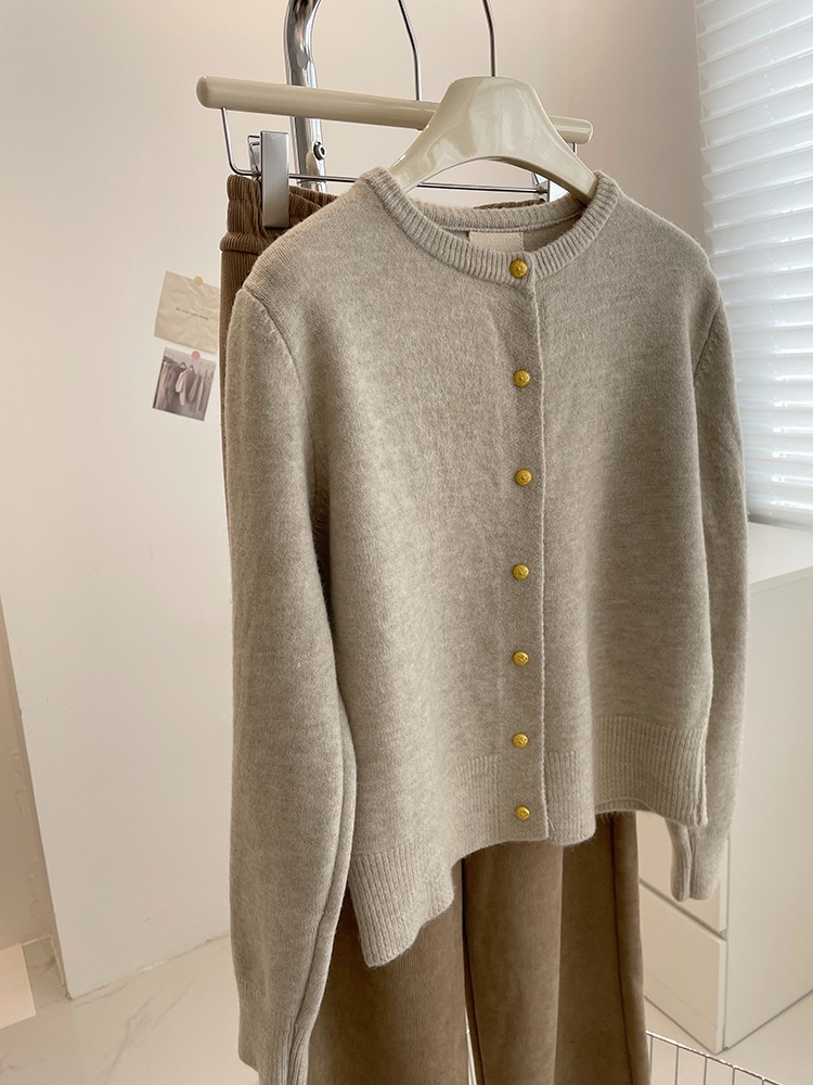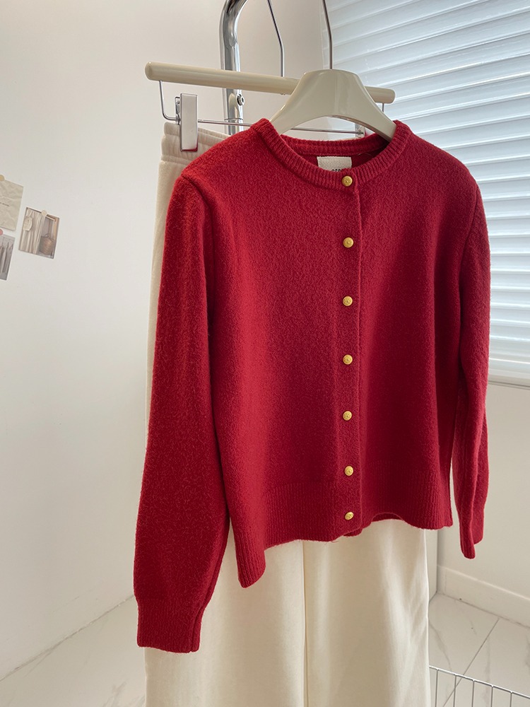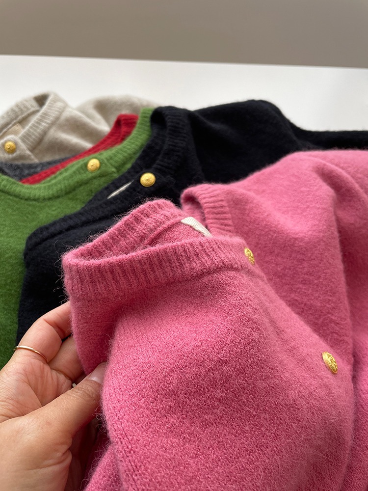 화이트 라즈베리 파우더 작은 골드 버튼 니트 카디건 여성을 보여주세요! 가을과 겨울 한국 소프트 왁스 두꺼운 따뜻한 크루 넥 스웨터 재킷