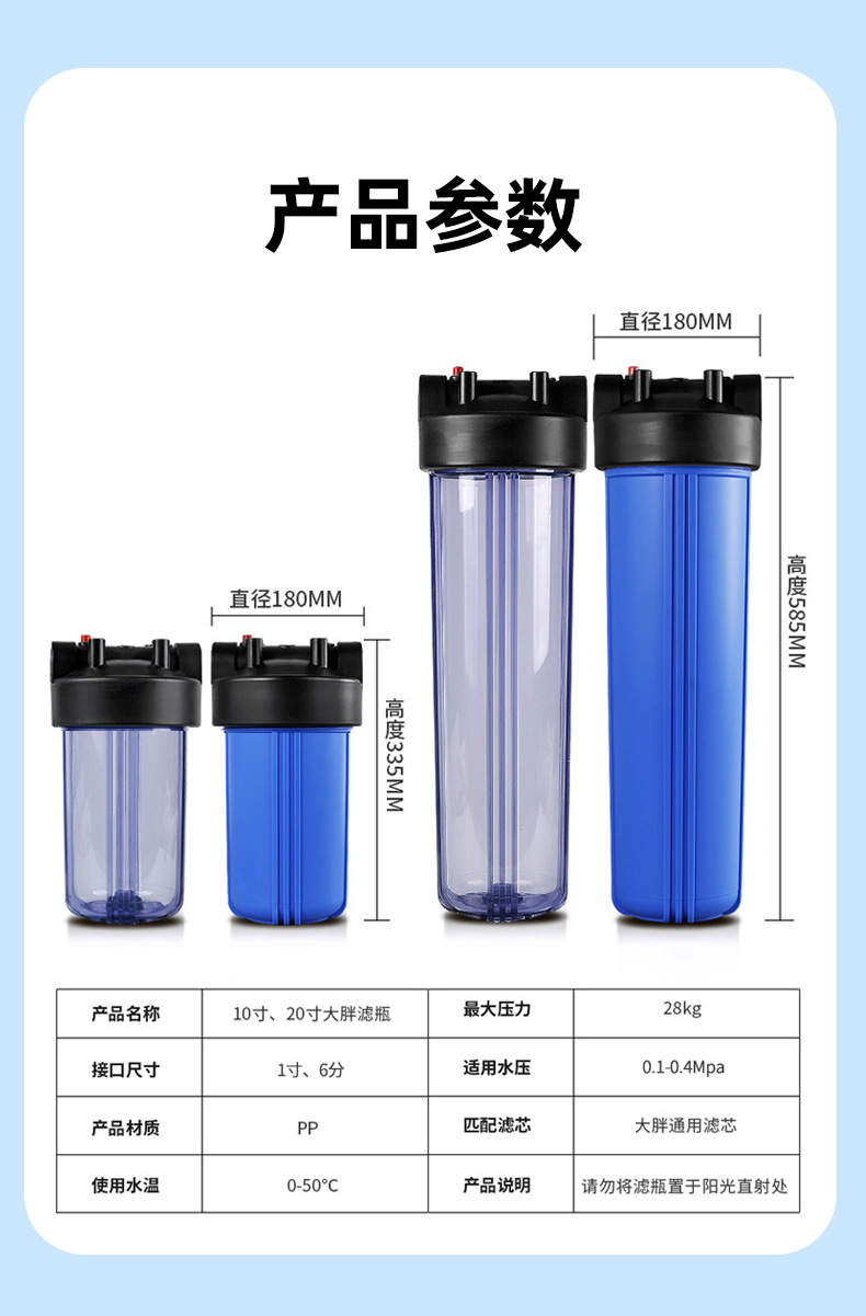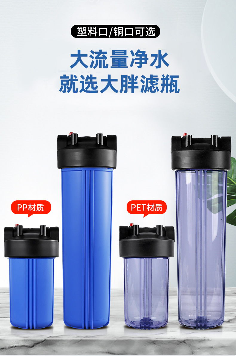 10 인치/20 인치 큰 지방 필터 병 전체 집 수돗물 정화 프론트 블루 병 큰 흐름 정수기 필터 병