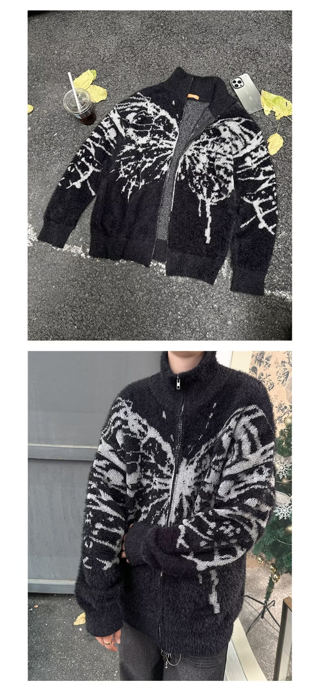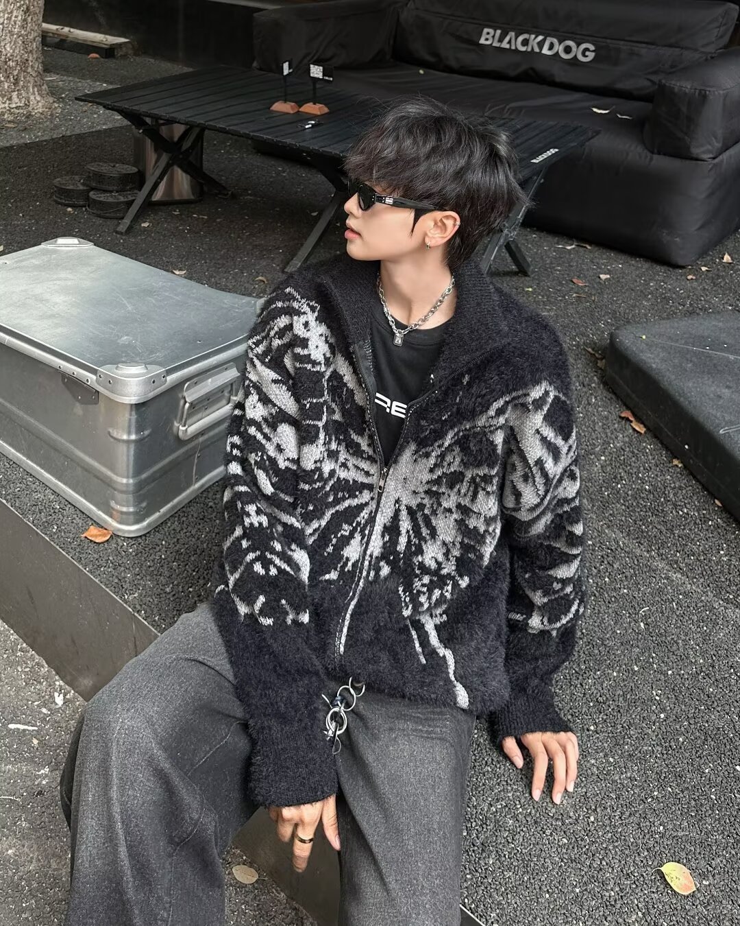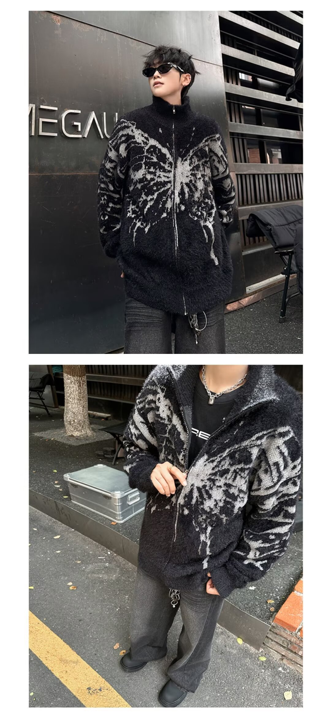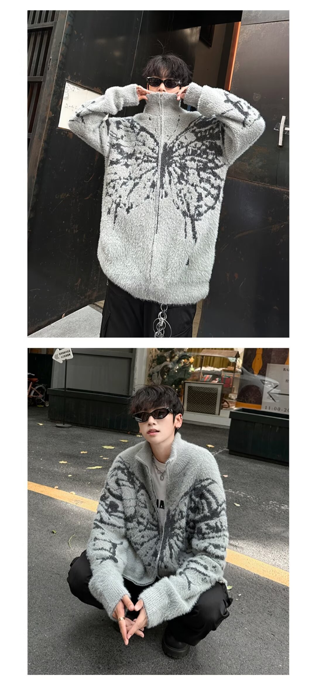 가을과 겨울 미국 스타일 레트로 나비 자카드 수직 칼라 카디건 스웨터 남성 트렌디 브랜드 틈새 게으른 느슨한 니트 자켓