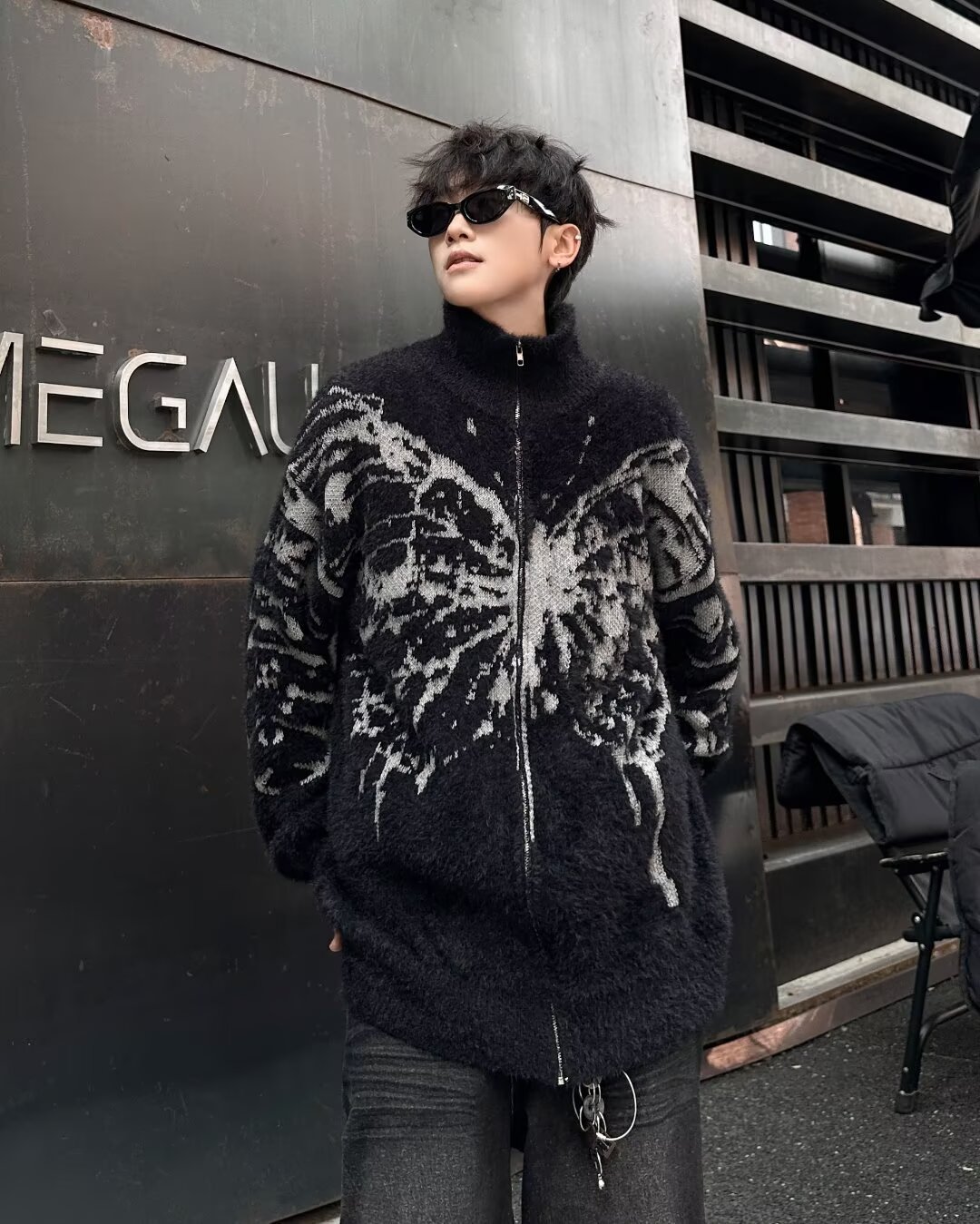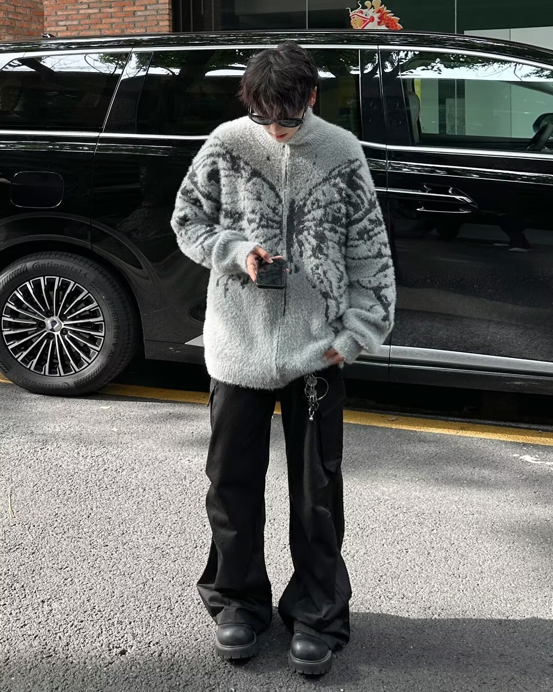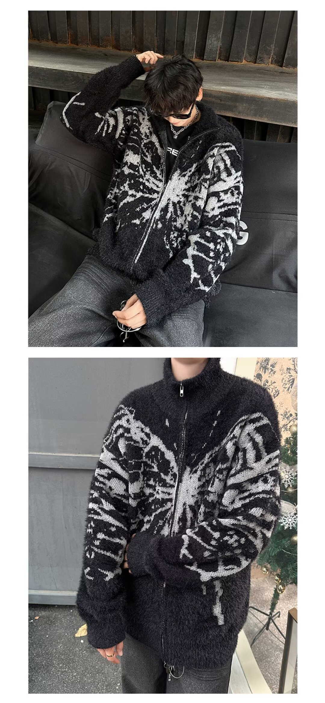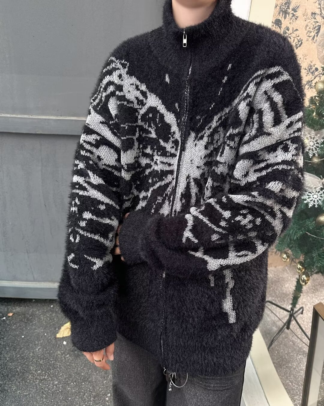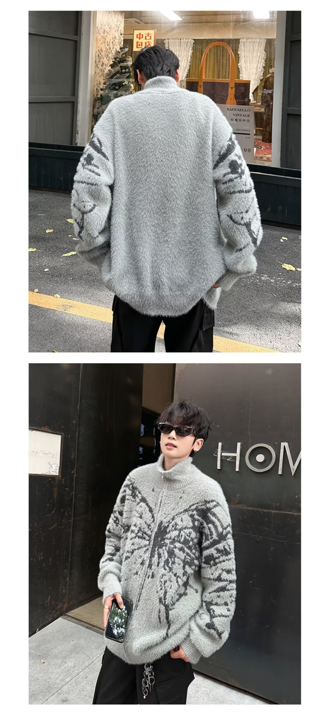 가을과 겨울 미국 스타일 레트로 나비 자카드 수직 칼라 카디건 스웨터 남성 트렌디 브랜드 틈새 게으른 느슨한 니트 자켓