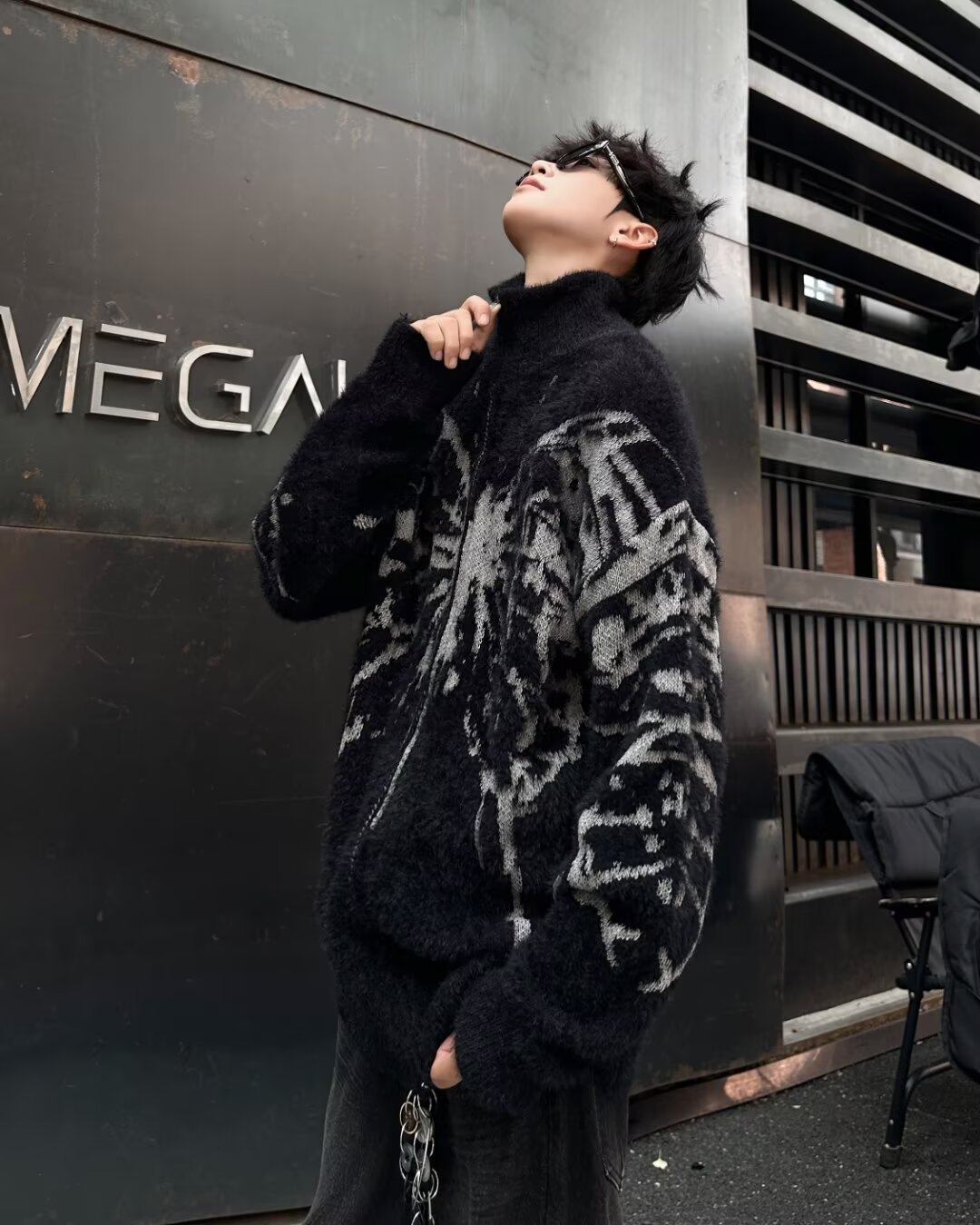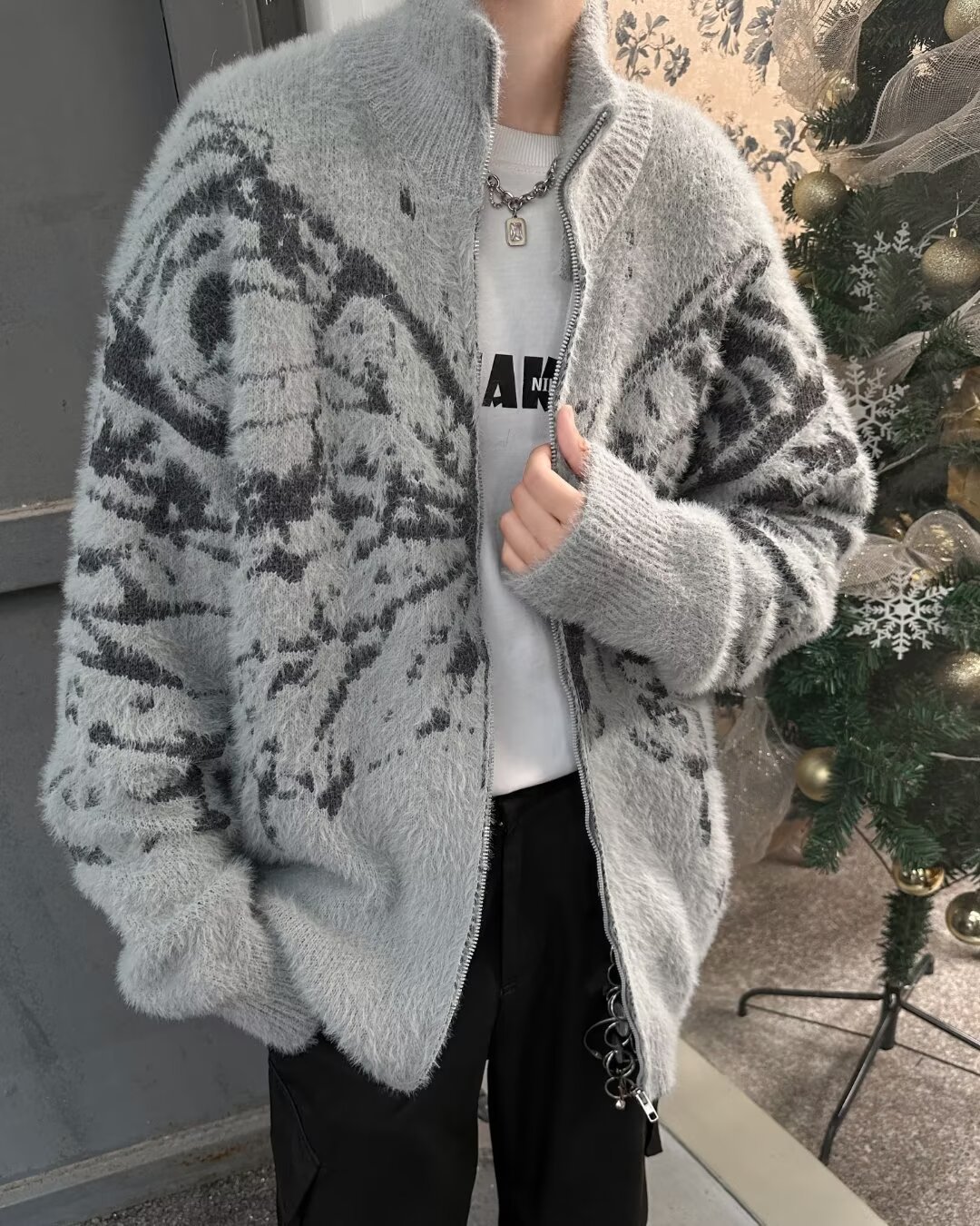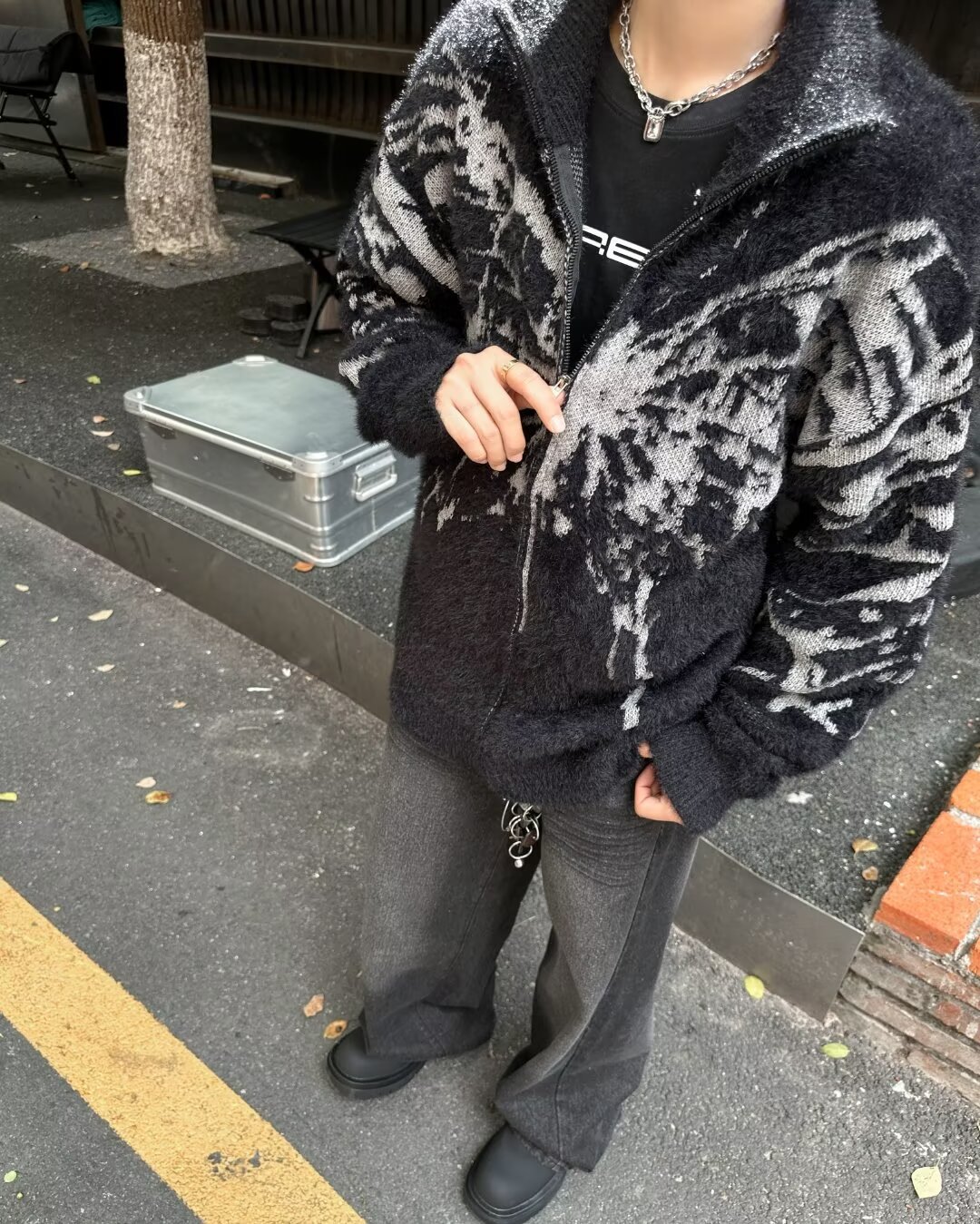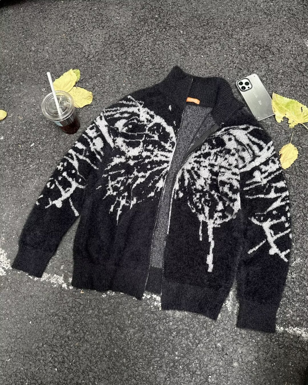 가을과 겨울 미국 스타일 레트로 나비 자카드 수직 칼라 카디건 스웨터 남성 트렌디 브랜드 틈새 게으른 느슨한 니트 자켓