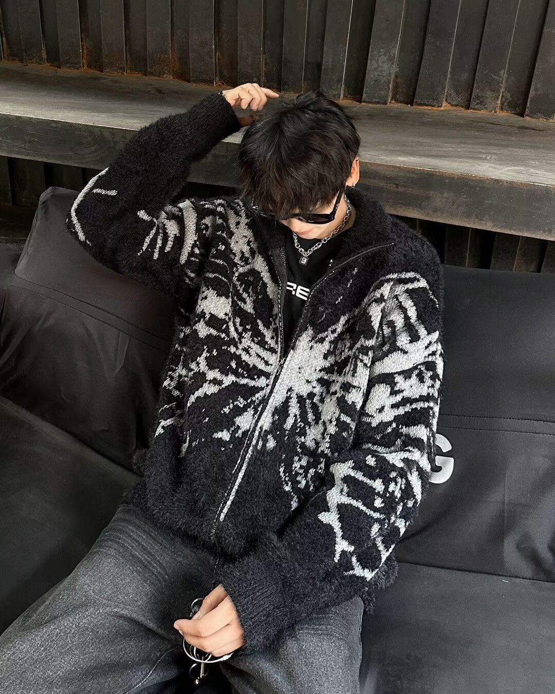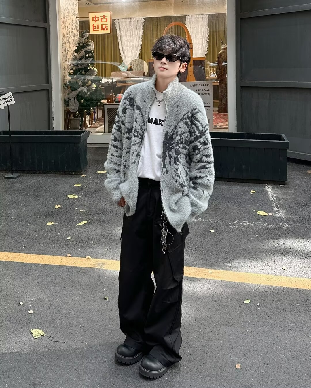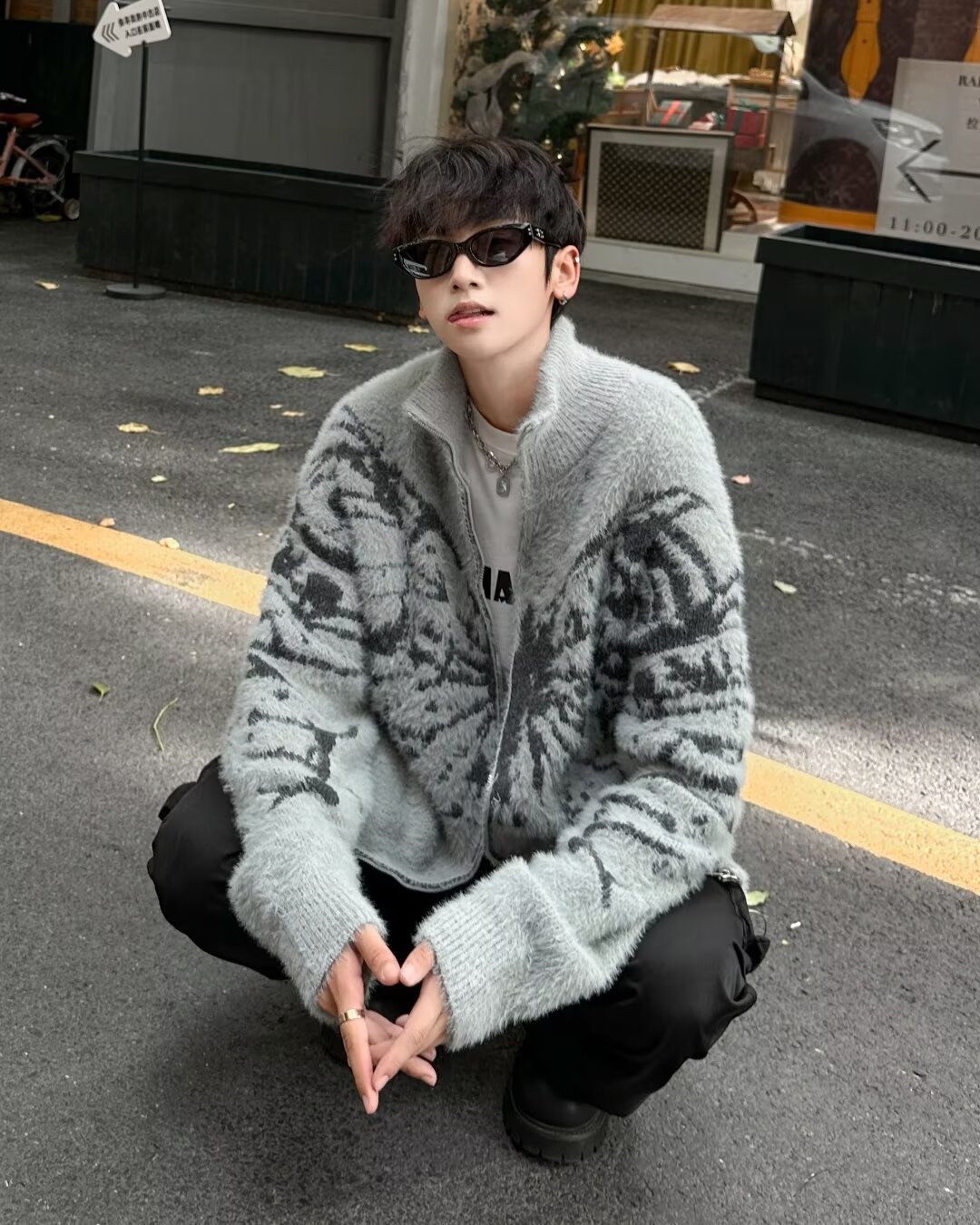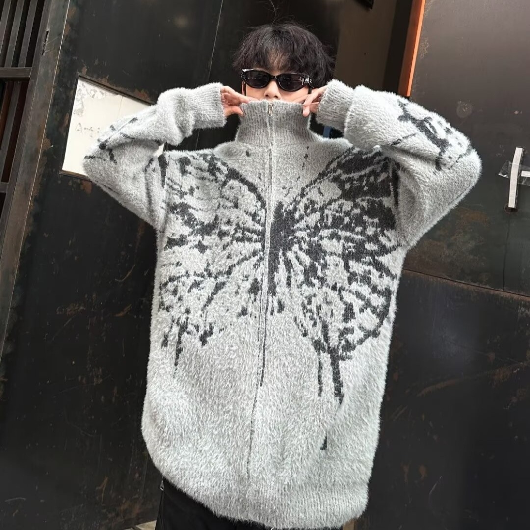 가을과 겨울 미국 스타일 레트로 나비 자카드 수직 칼라 카디건 스웨터 남성 트렌디 브랜드 틈새 게으른 느슨한 니트 자켓스토어 가기