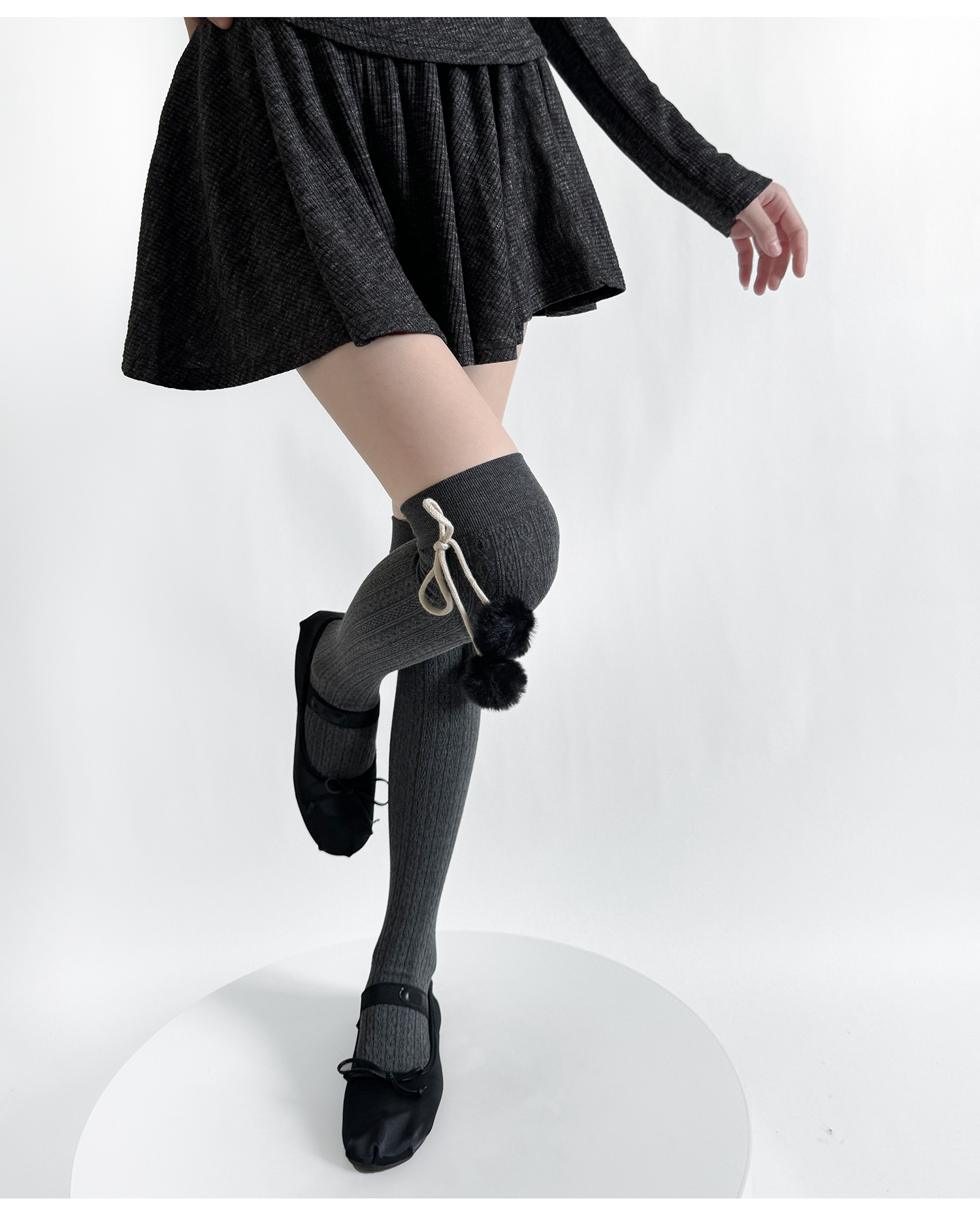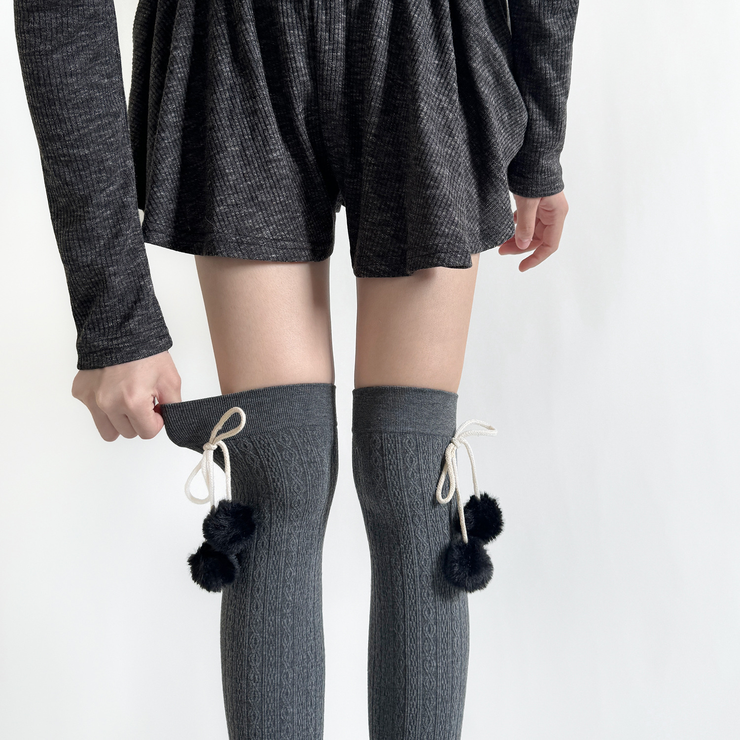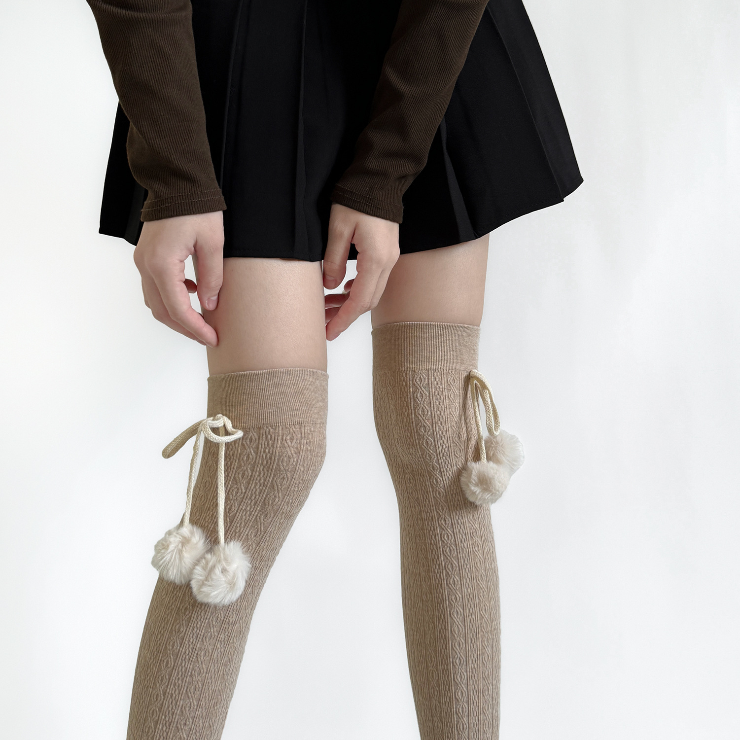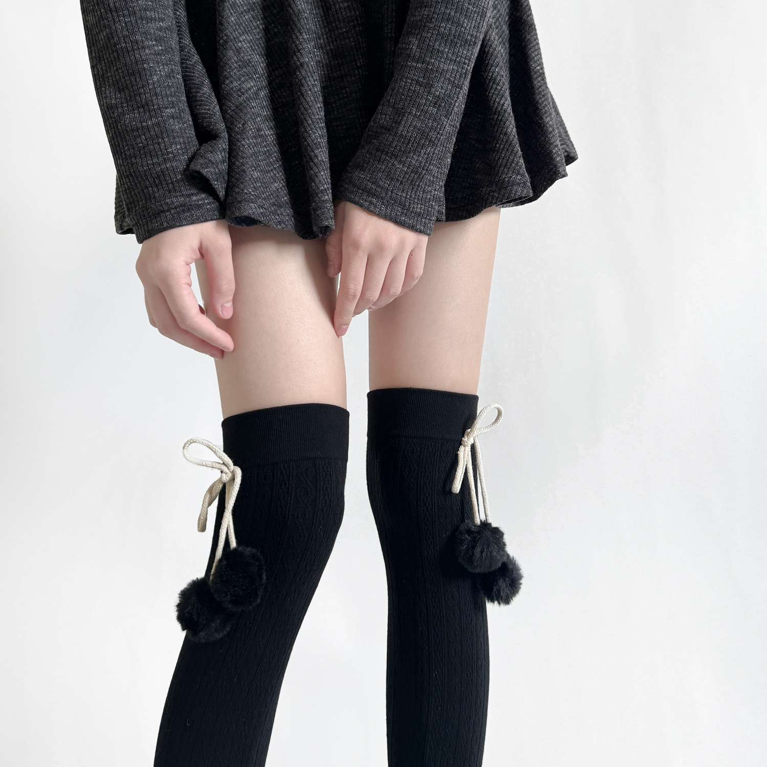 가을과 겨울 새로운 마이크로 압력 트위스트 무릎 높은 양말 일본 귀여운 모피 공 스타킹 단색 달콤한 양말 봄과 가을스토어 가기