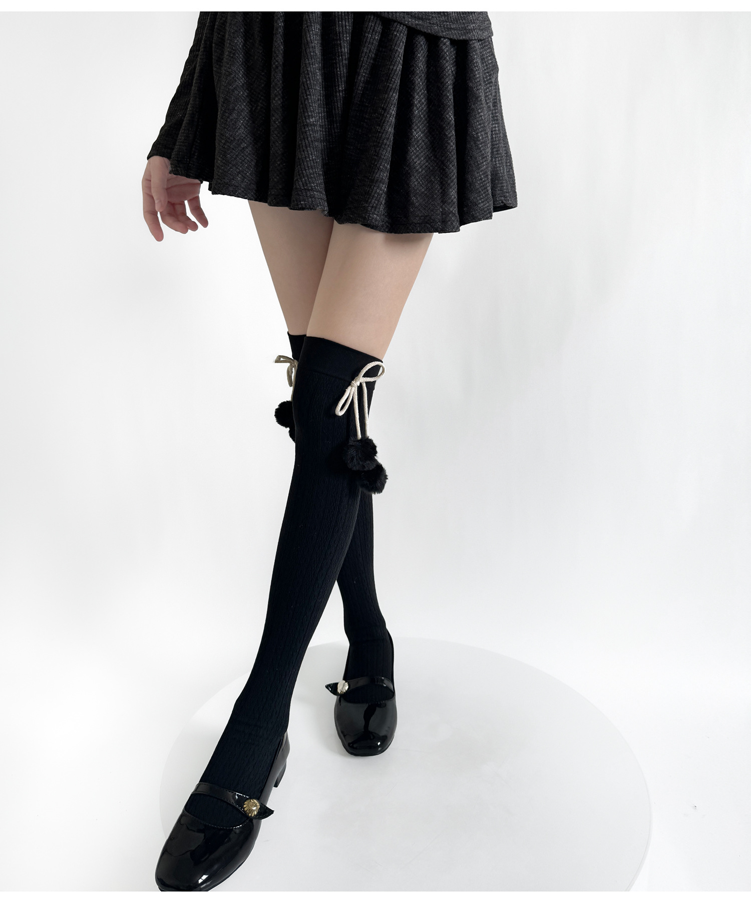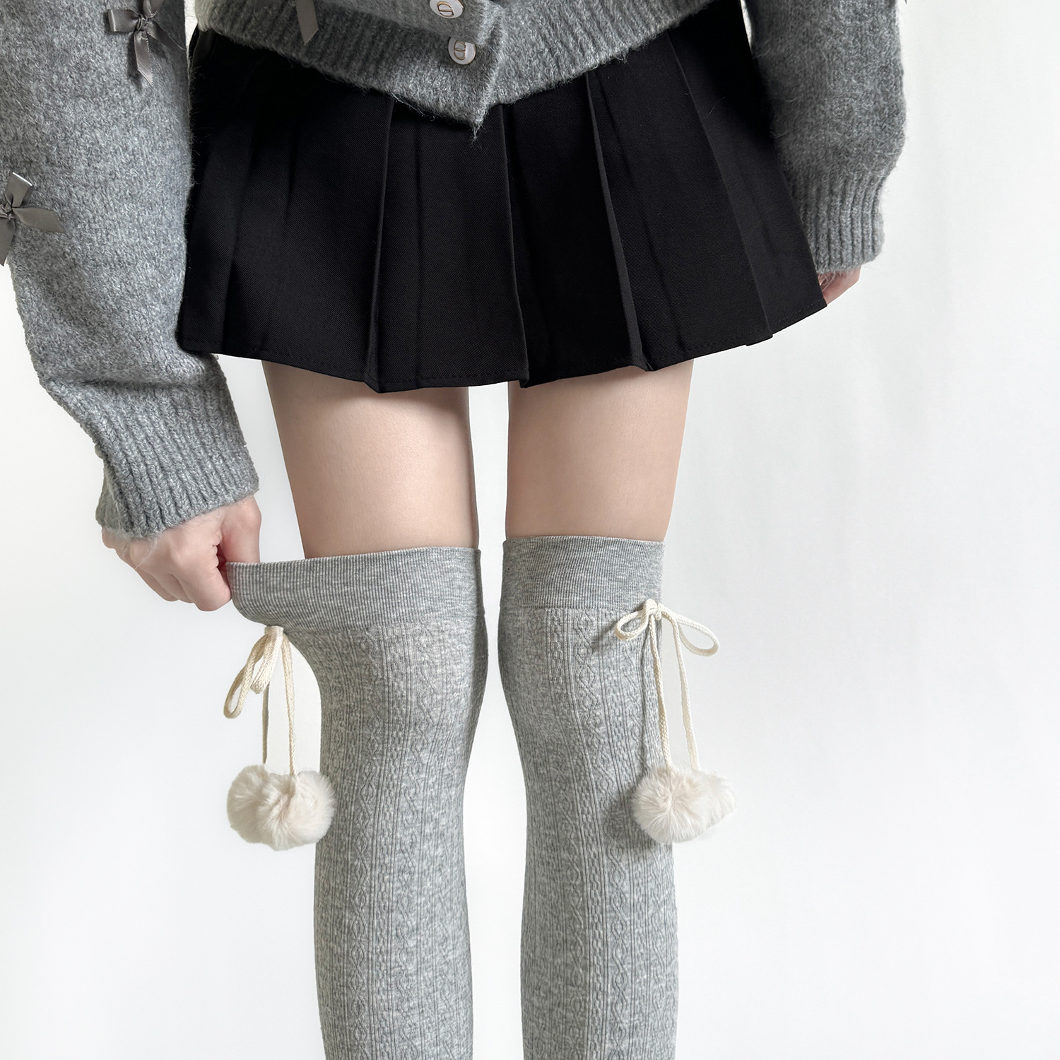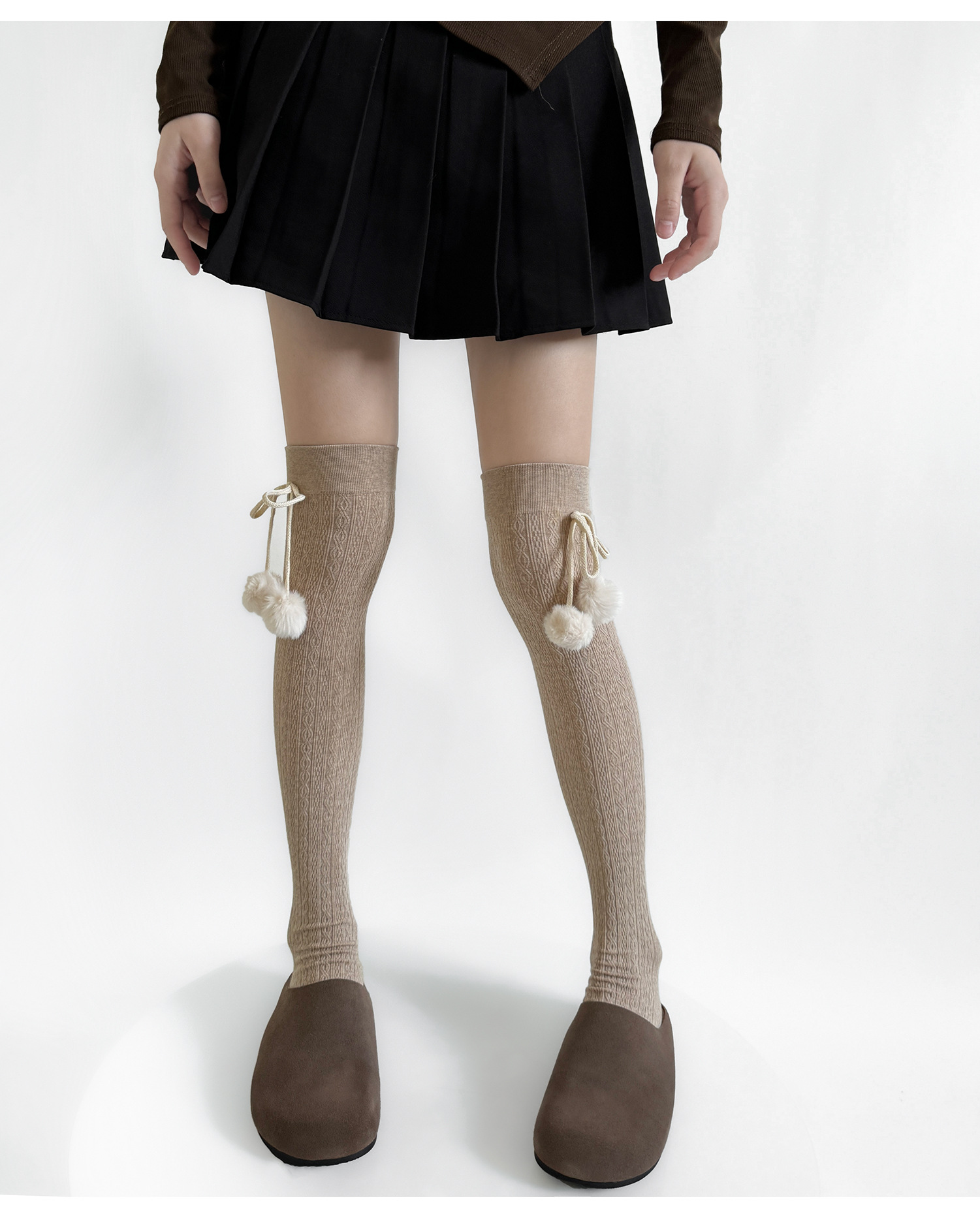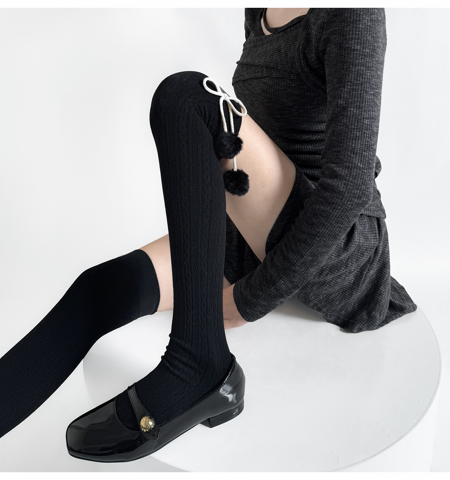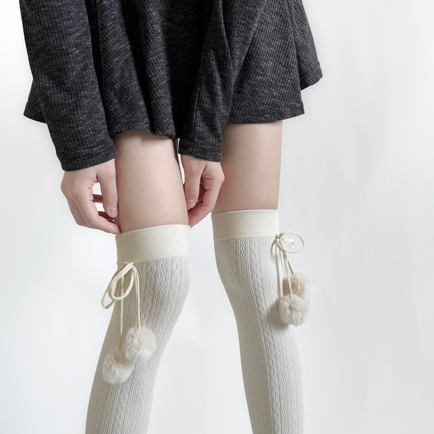 가을과 겨울 새로운 마이크로 압력 트위스트 무릎 높은 양말 일본 귀여운 모피 공 스타킹 단색 달콤한 양말 봄과 가을스토어 가기