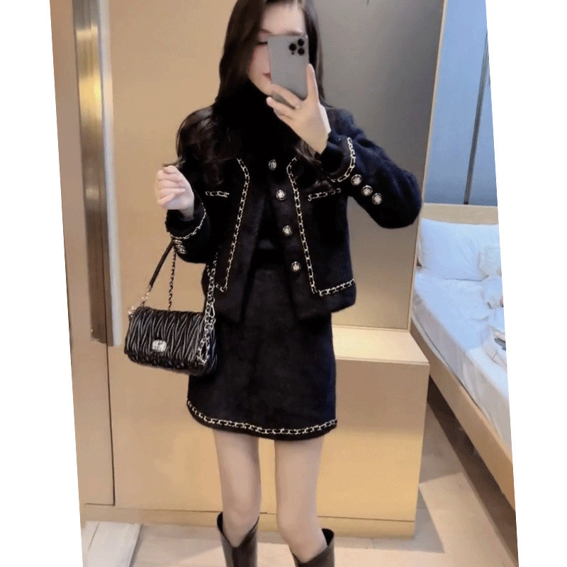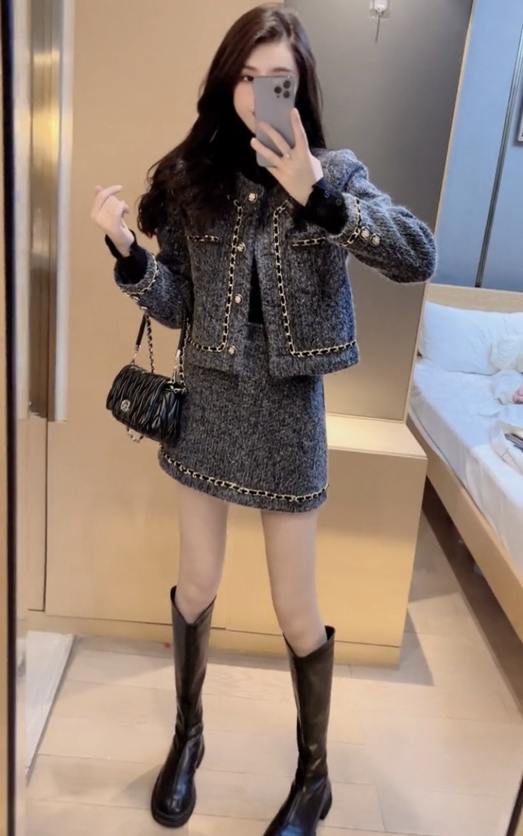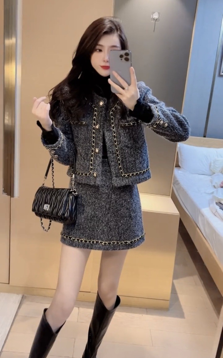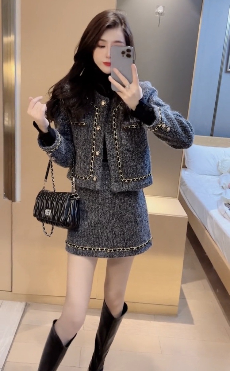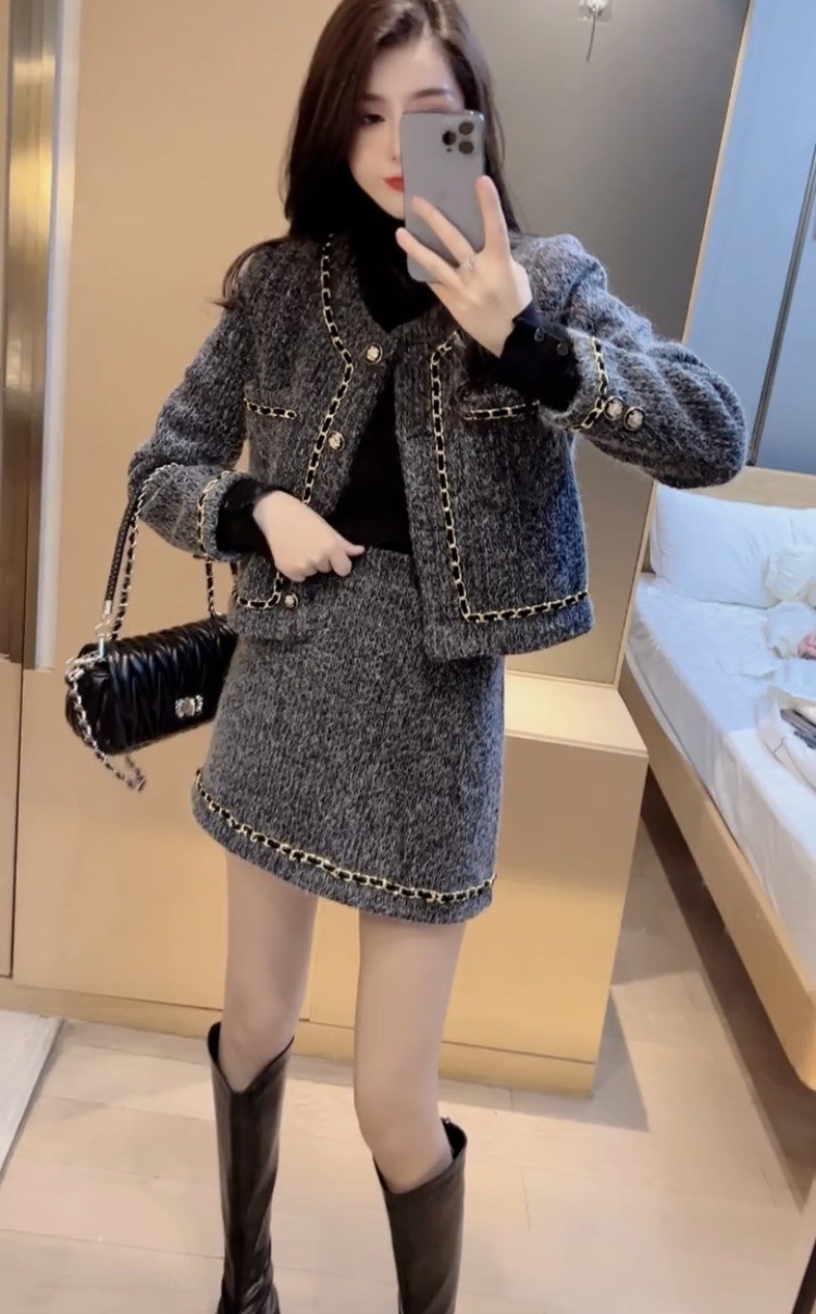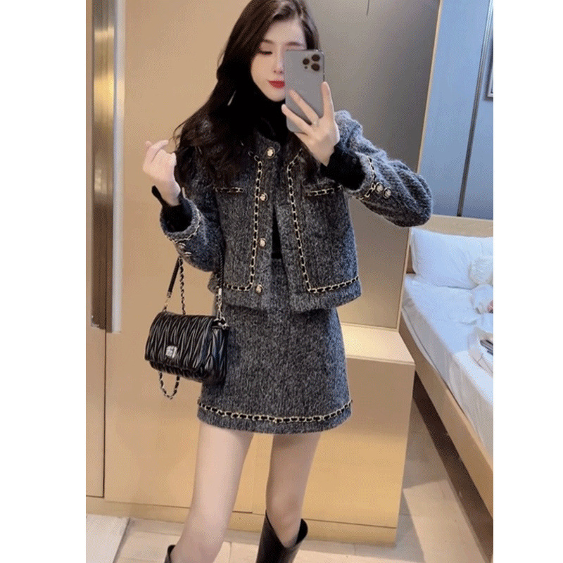 유럽의 새로운 스타일 얇은 코튼 울 작은 샤넬 스타일 패션 세트 여성 서양식 폭발 짧은 세트 재킷 스커트 투피스 세트스토어 가기