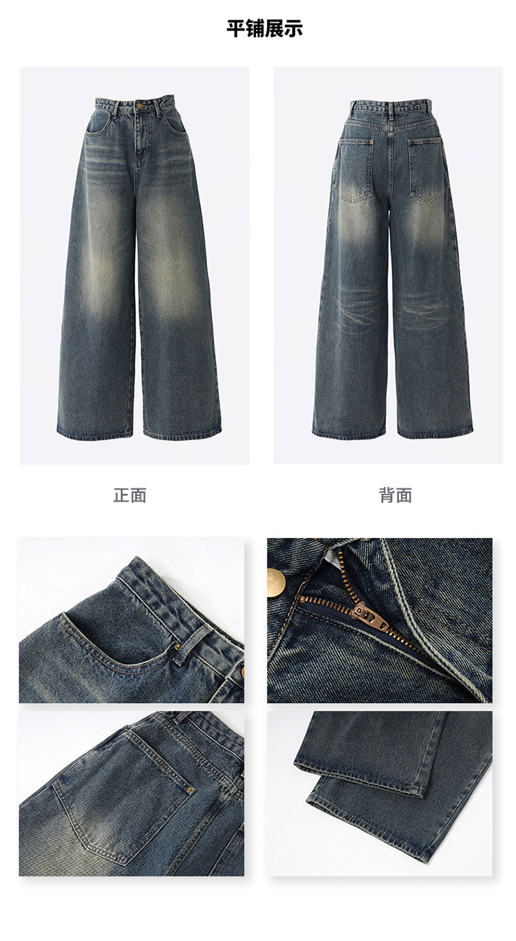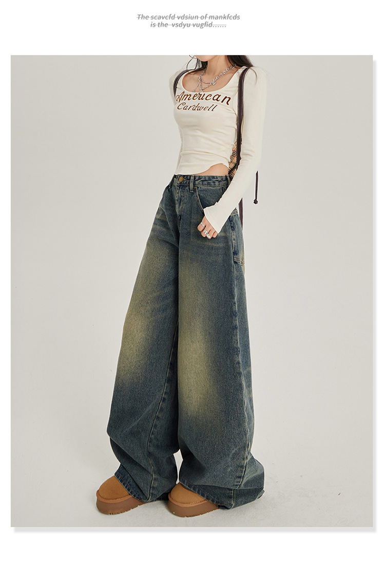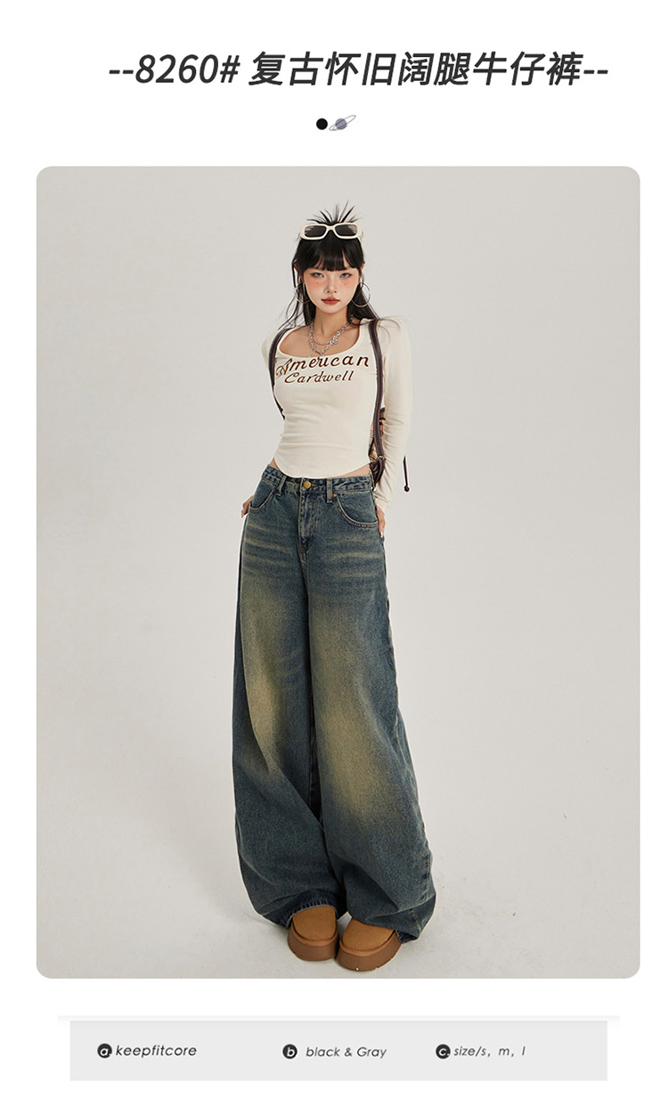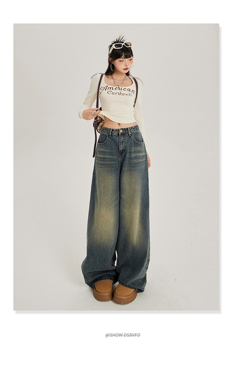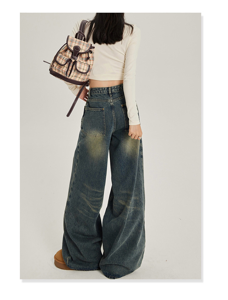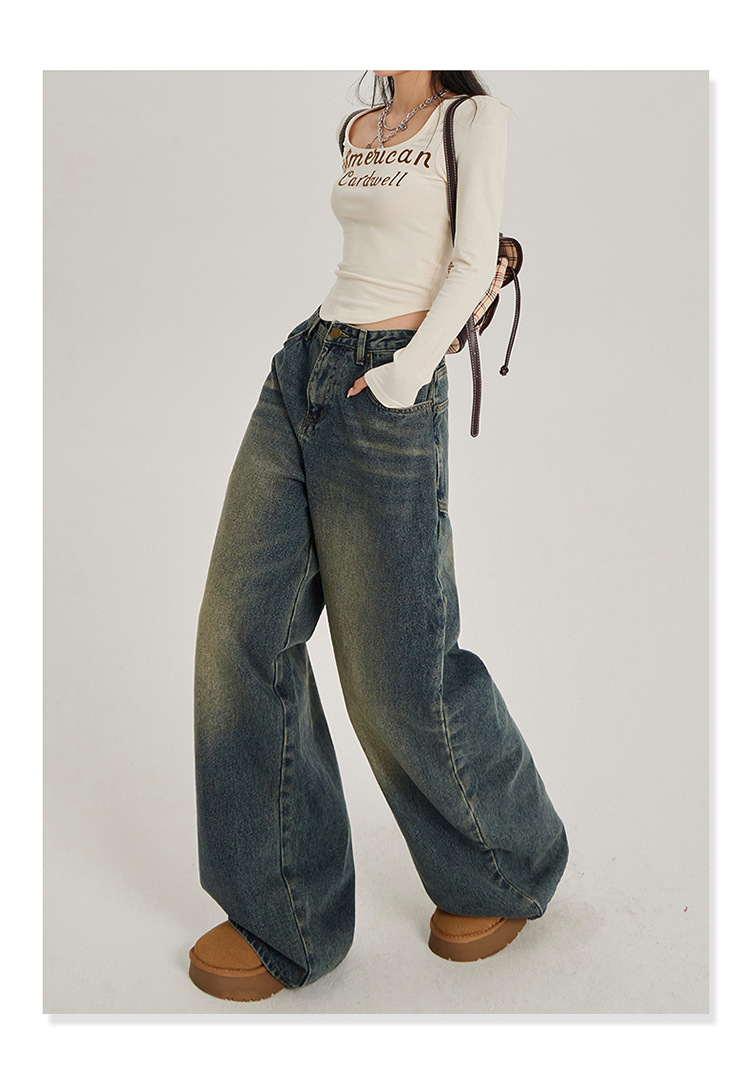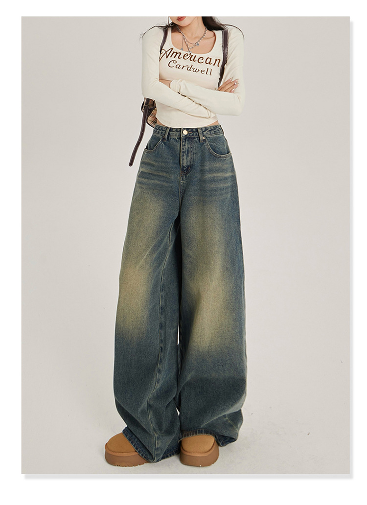[진인] 미국 레트로 향수 높은 허리 느슨한 넓은 다리 바지 올매치 가을과 겨울 스트레이트 데님 여성용 트렌디 바지스토어 가기
