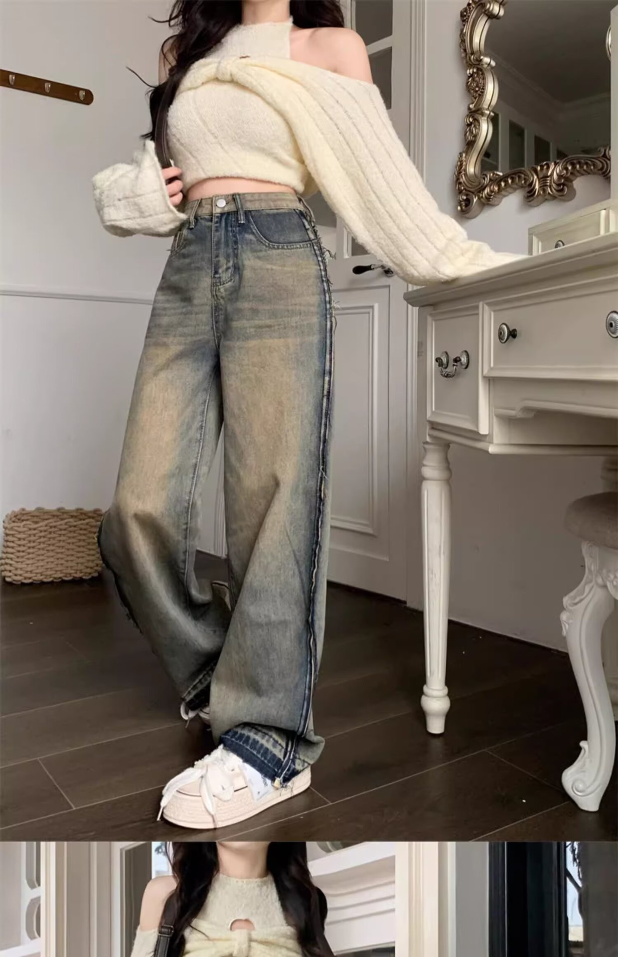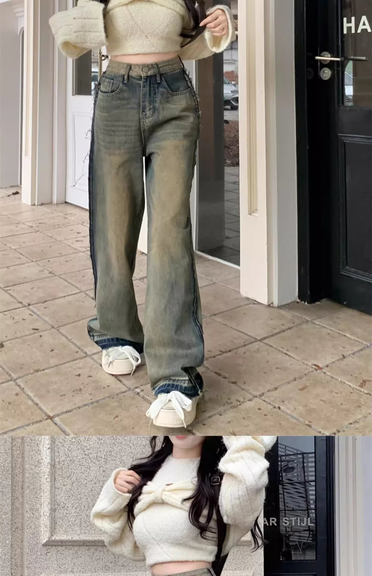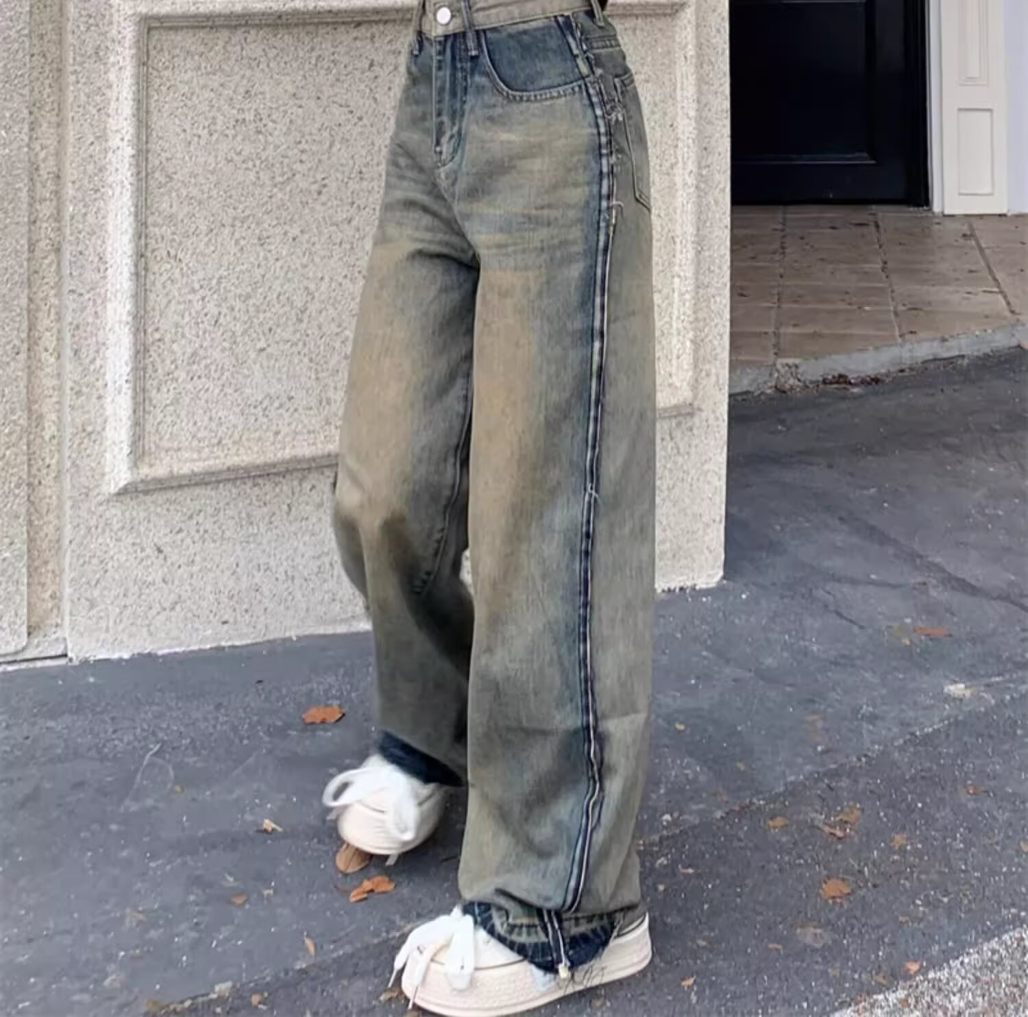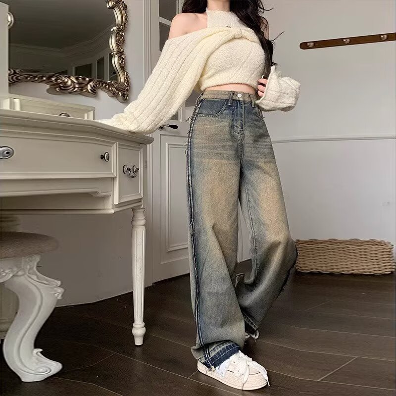 노란색 진흙 염색 거친 가장자리 넓은 다리 대외 무역 청바지 2024 새로운 여성 의류 디자인 느낌 유럽과 미국 스타일의 복고풍 하이 스트리트스토어 가기