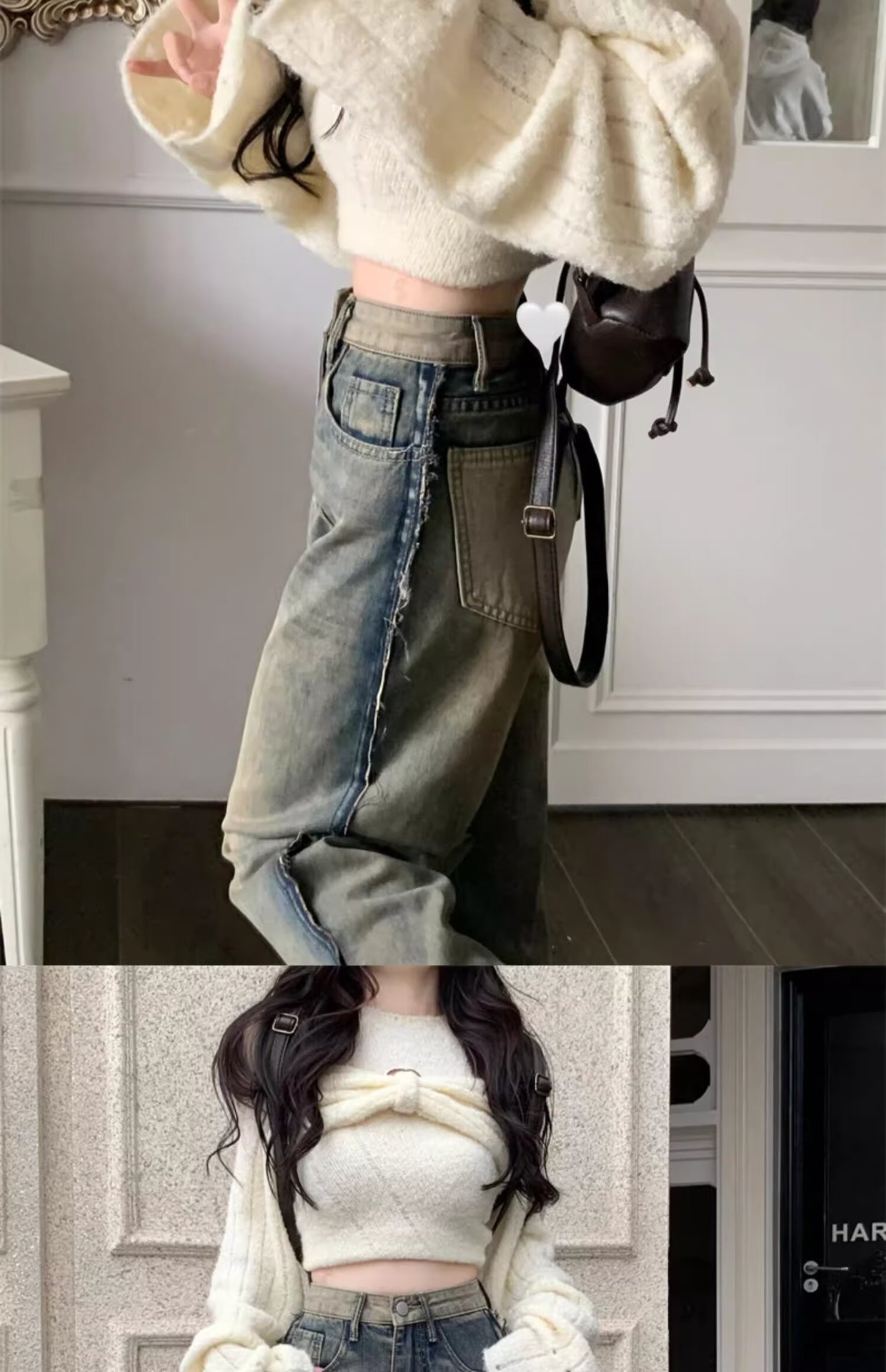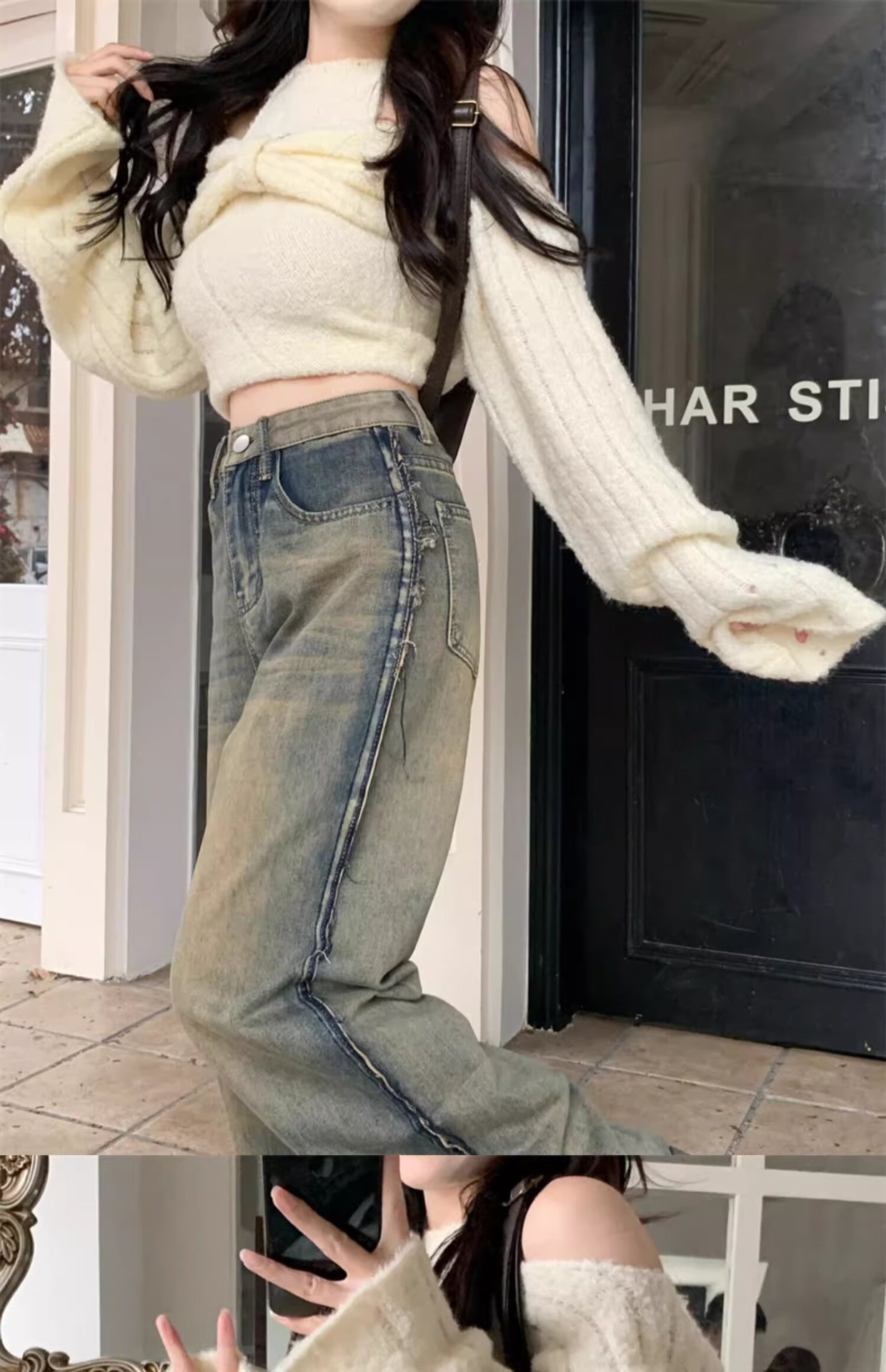 노란색 진흙 염색 거친 가장자리 넓은 다리 대외 무역 청바지 2024 새로운 여성 의류 디자인 느낌 유럽과 미국 스타일의 복고풍 하이 스트리트
