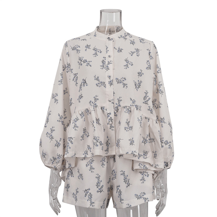 2024 새로운 프랑스 스타일 샤넬 스타일 원피스 퍼프 슬리브 하이 넥 러플 푹신한 셔츠 프린트 반바지 세트