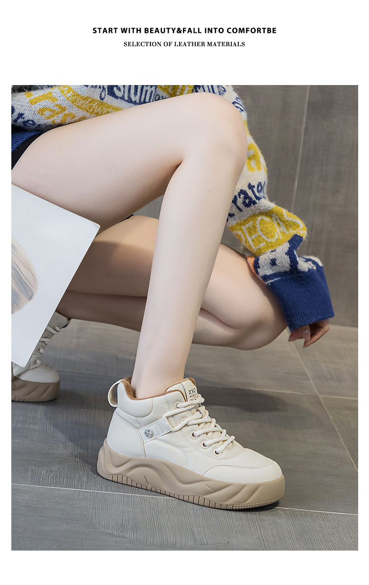 두꺼운 밑창 가죽 하이 탑 스케이트 신발 여성의 2024 겨울 온라인 핫 기모 패션 조커 빵 캐주얼 신발