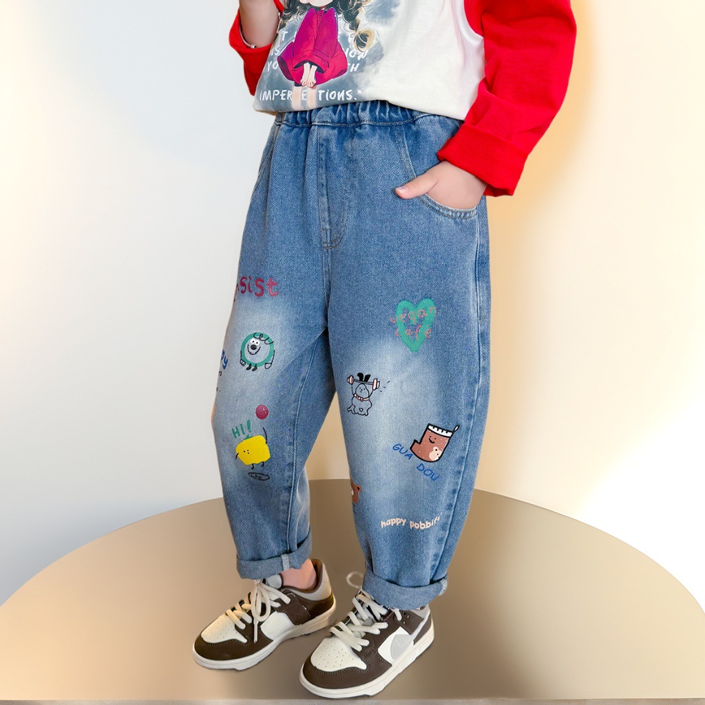 소녀 청바지 2024 년 봄과 가을 새로운 어린이 만화 인쇄 패션 바지 아기 소녀 가을 바지스토어 가기