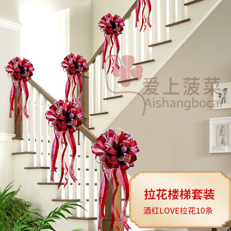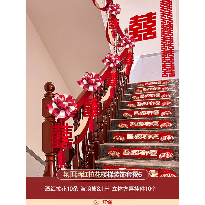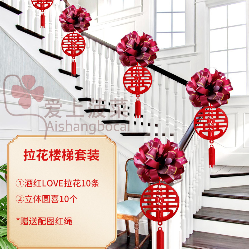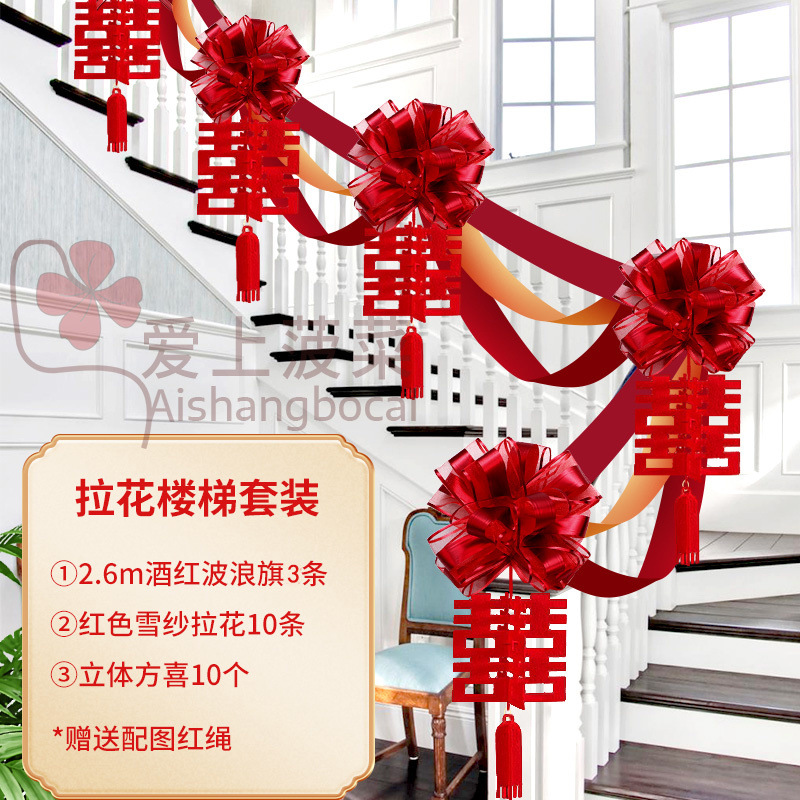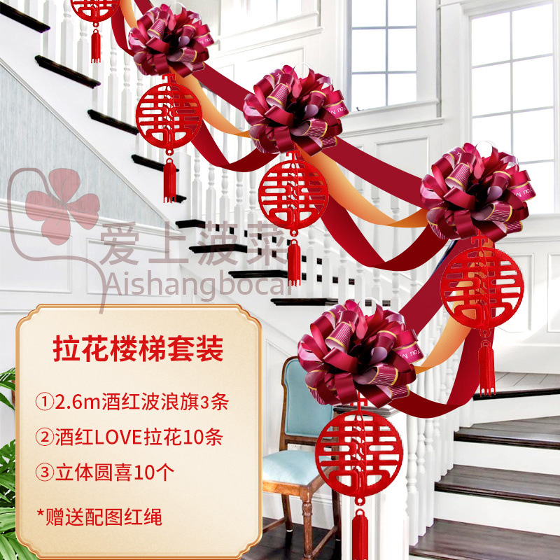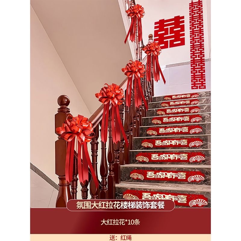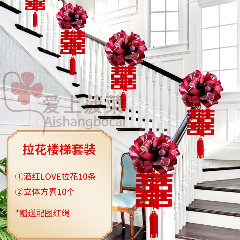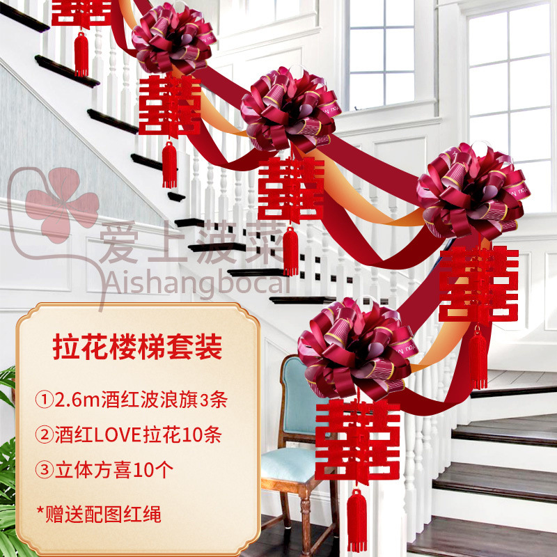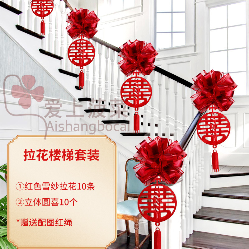 웨딩 계단 난간 꽃 장식 웨딩 룸 레이아웃 야드 리본 웨딩 카 꽃 뒷모습 거울 리본