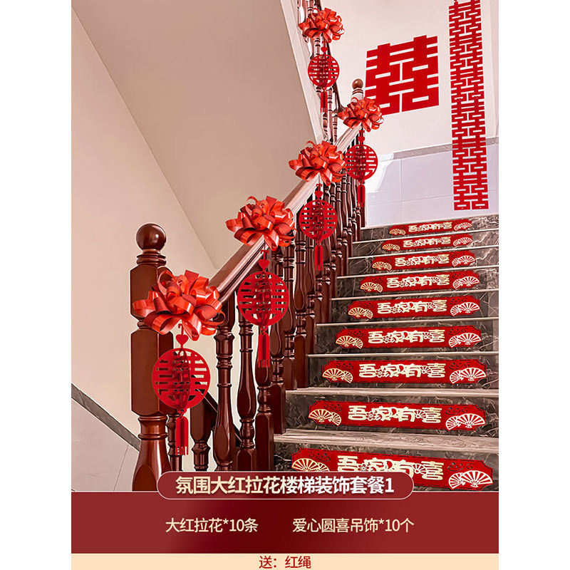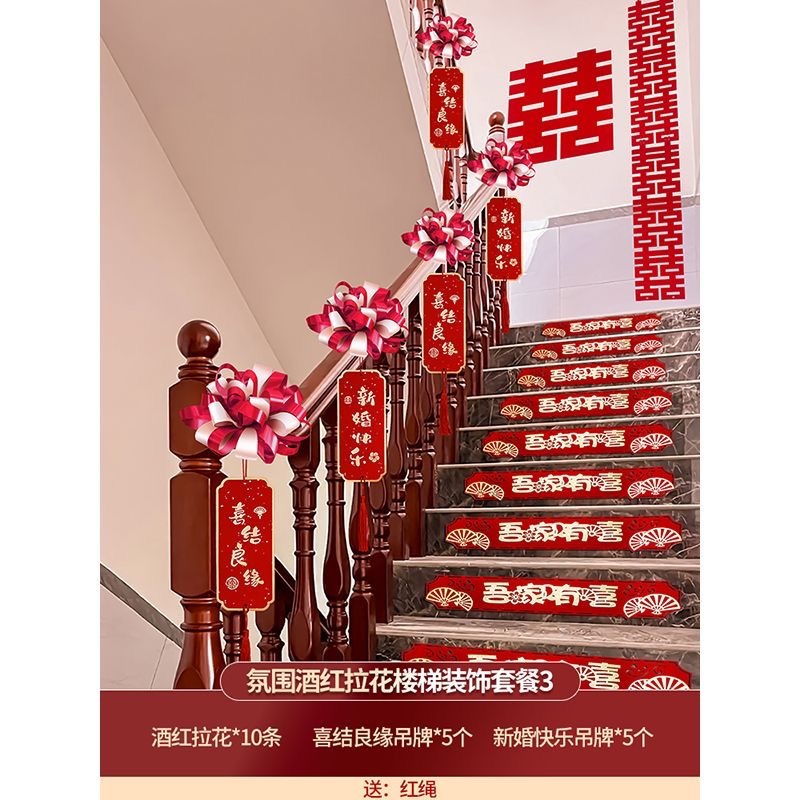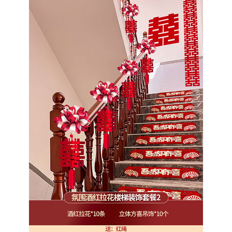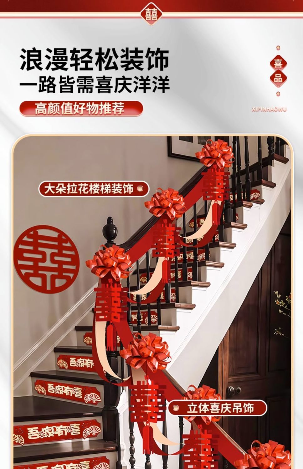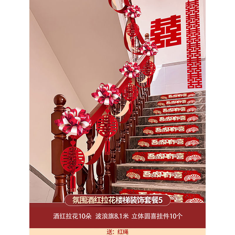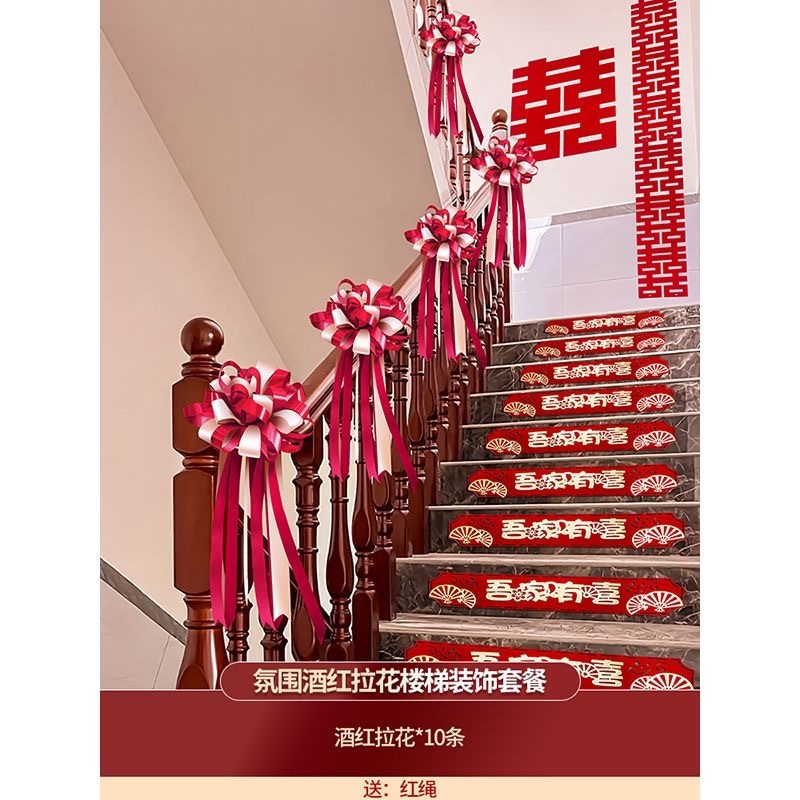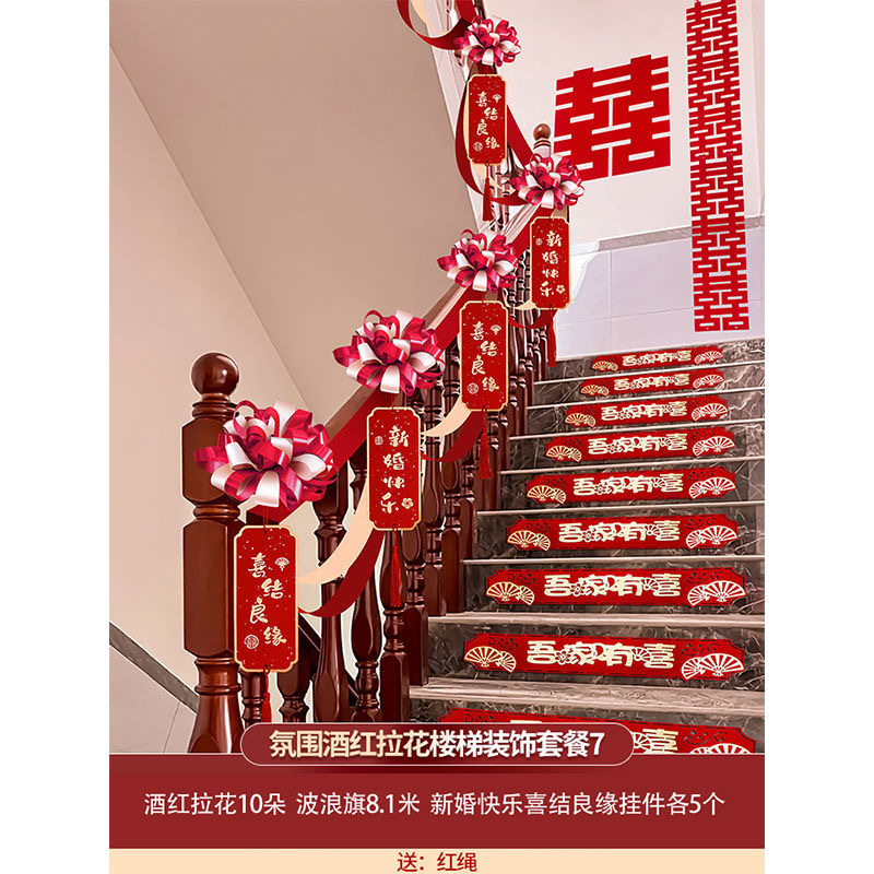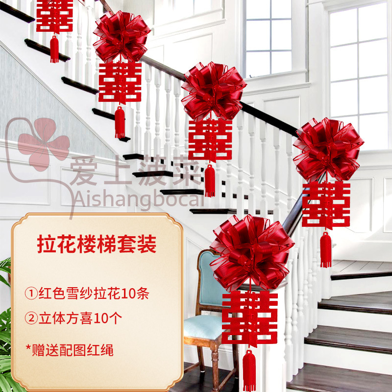 웨딩 계단 난간 꽃 장식 웨딩 룸 레이아웃 야드 리본 웨딩 카 꽃 뒷모습 거울 리본