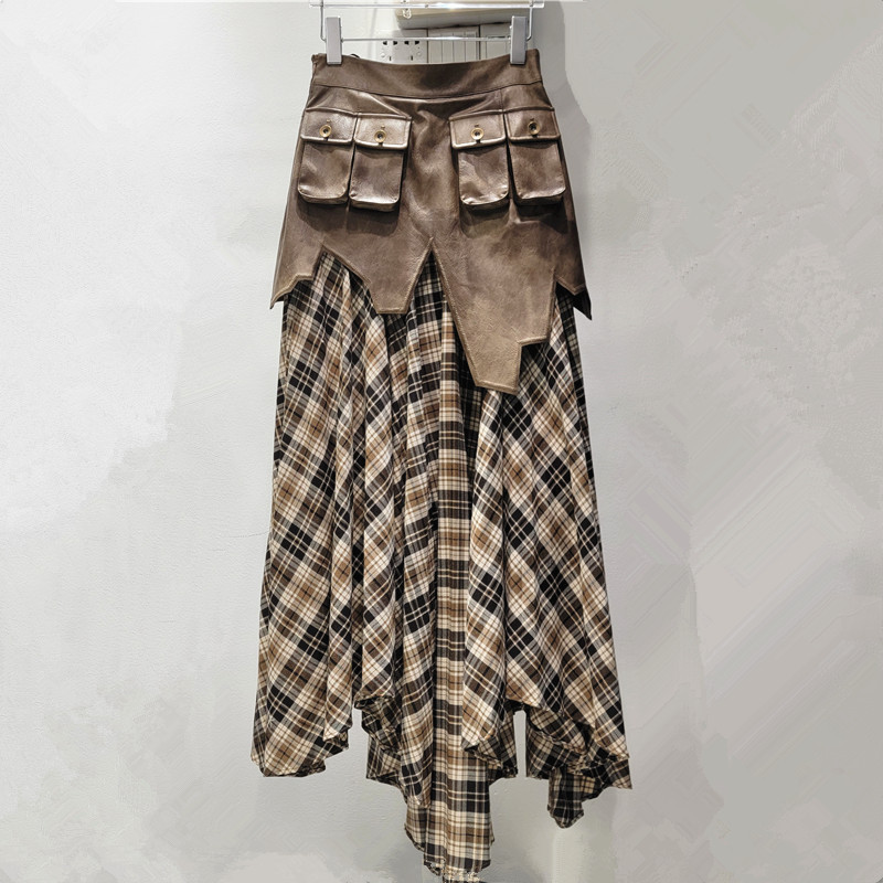 미국 스트리트 레트로 디자인 PU 가죽 크록 포켓 스티칭 격자 무늬 불규칙한 스커트 니트 탑 여성