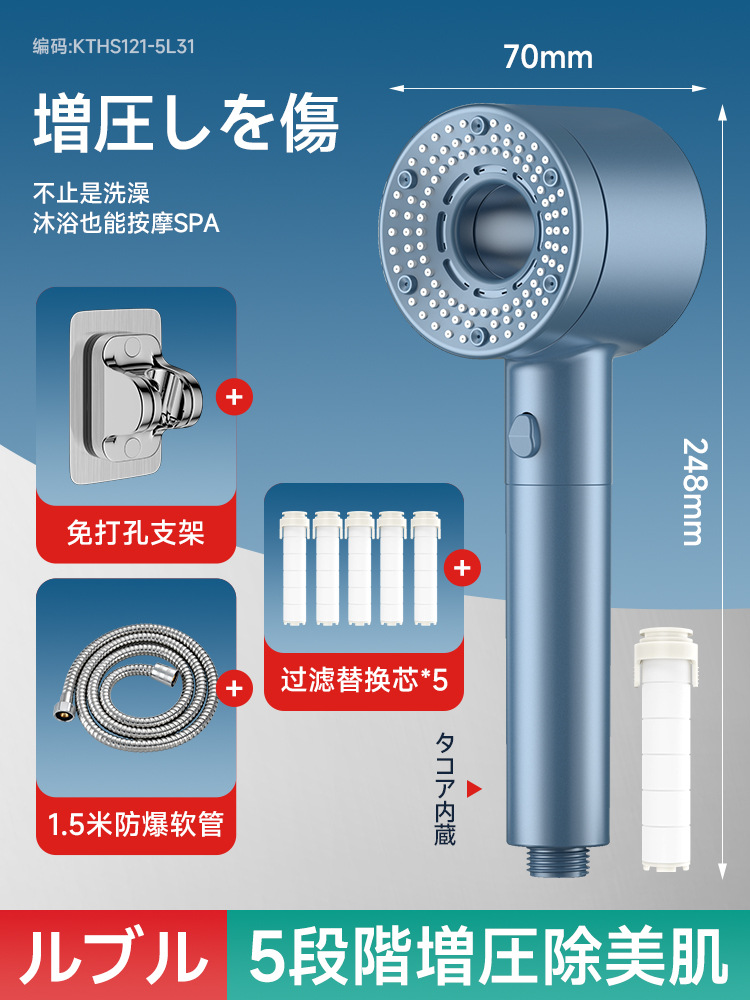 • "사파이어 블루 세트 3" 터보차저 샤워 + 호스 + 브래킷 + 교체 필터 5개