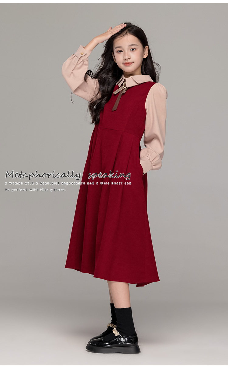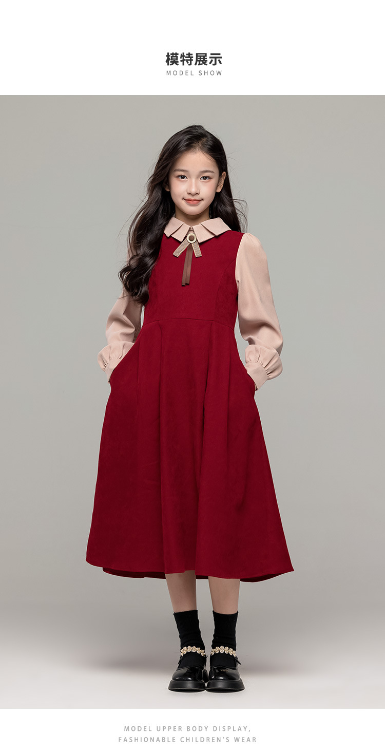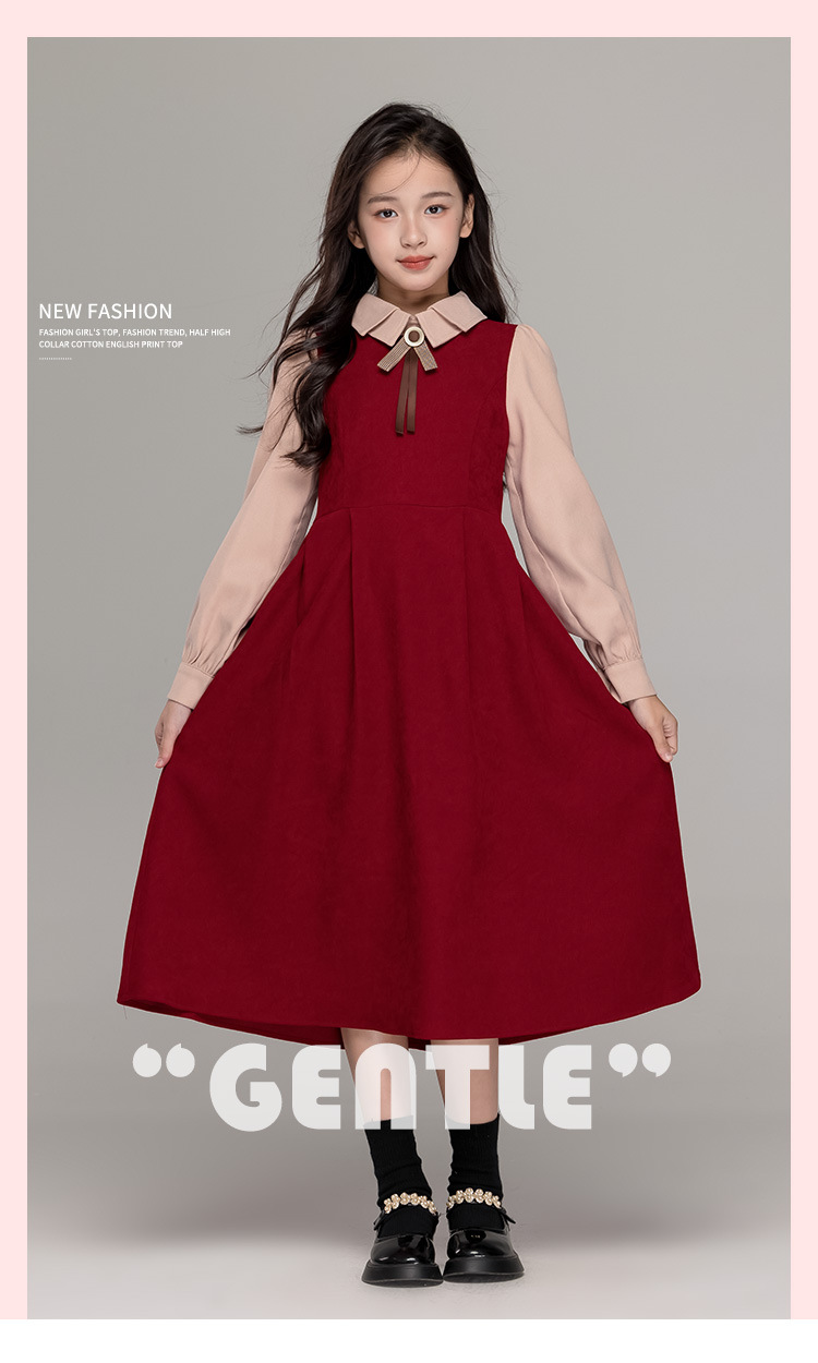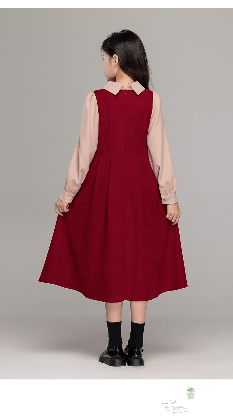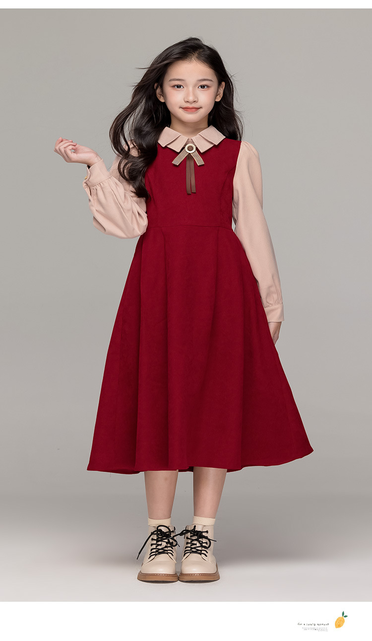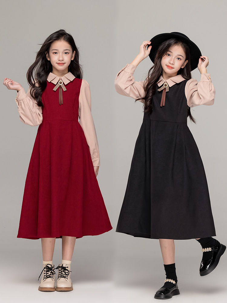 소녀 레트로 레드 원피스 2024 가을/겨울 새로운 더블 칼라 컬러 매칭 허리 페이크 투피스 대학 스타일 롱 원피스스토어 가기