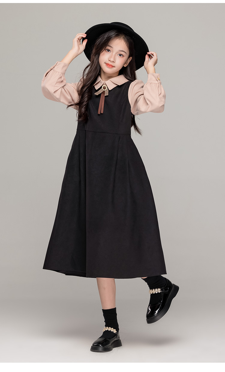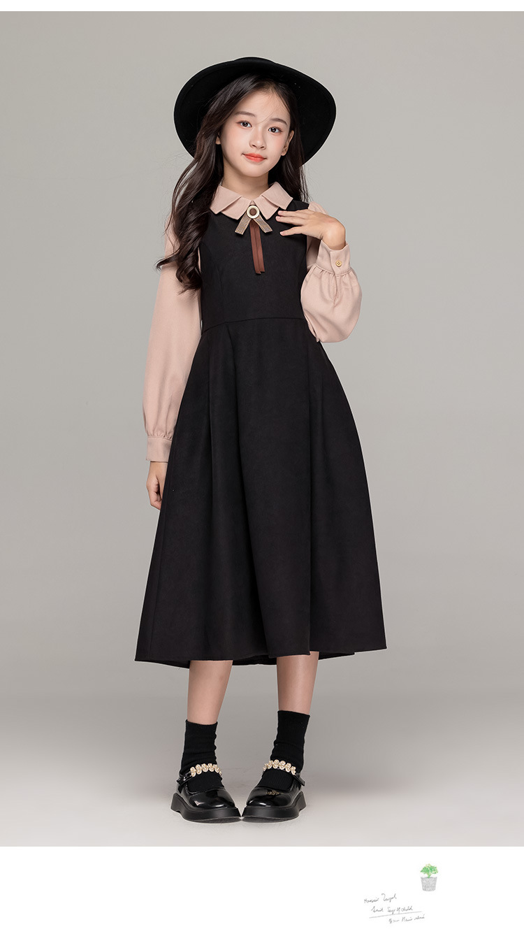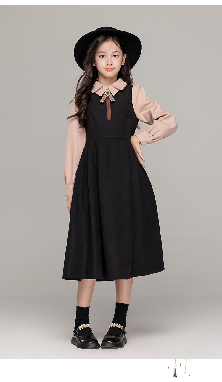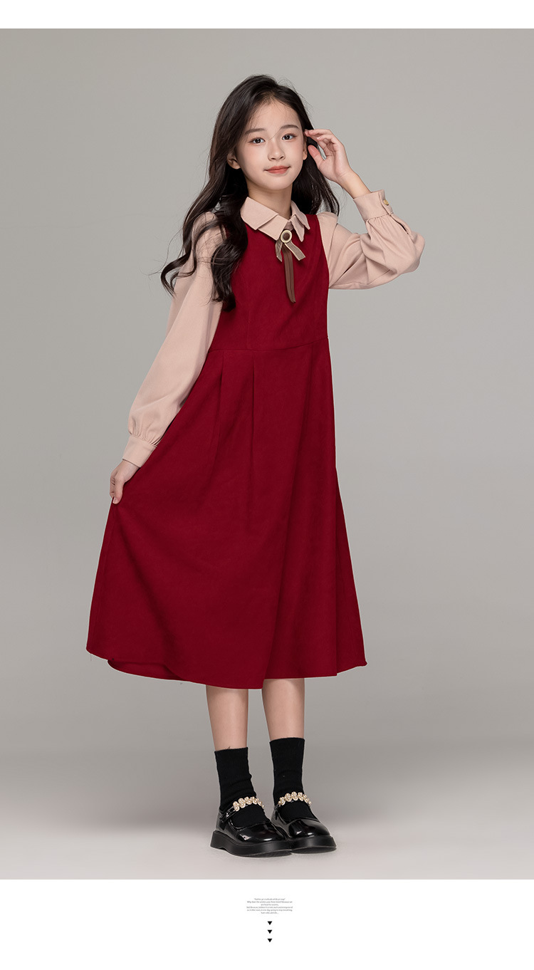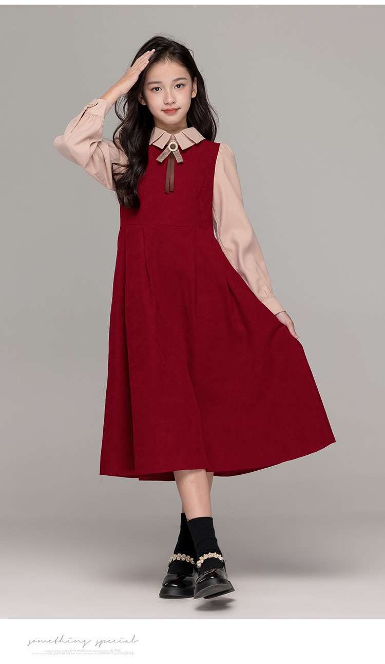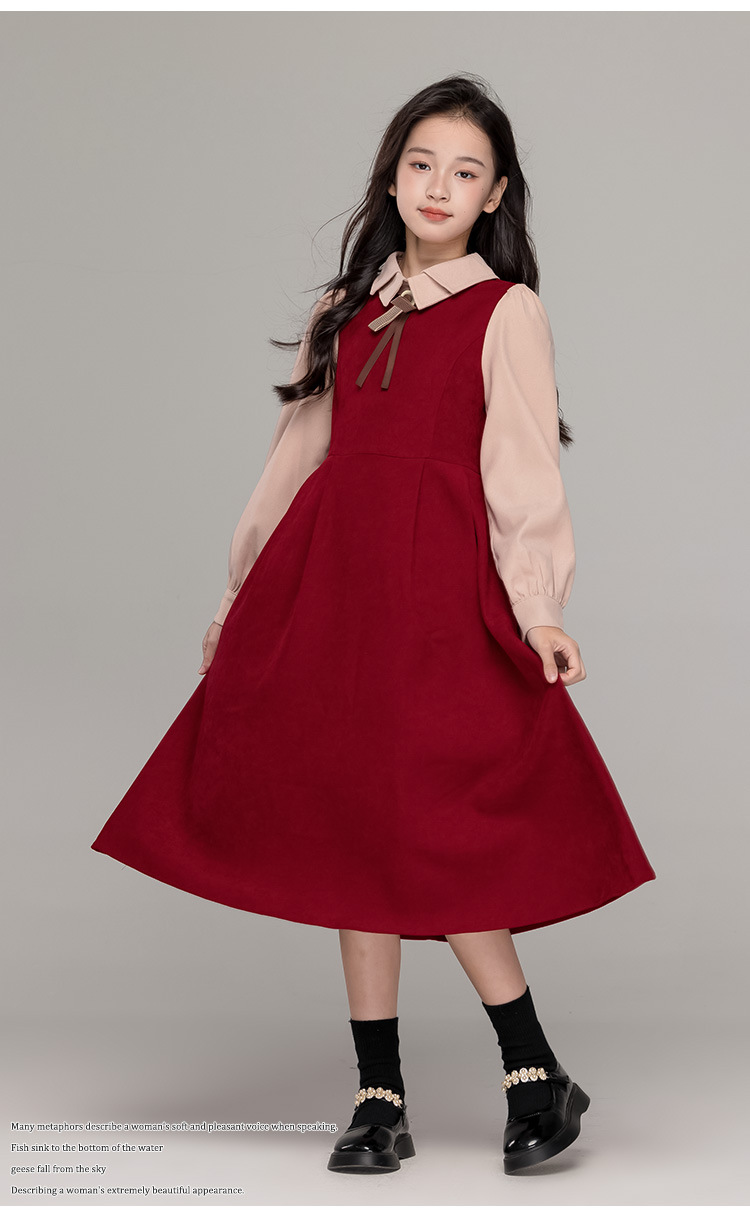 소녀 레트로 레드 원피스 2024 가을/겨울 새로운 더블 칼라 컬러 매칭 허리 페이크 투피스 대학 스타일 롱 원피스스토어 가기