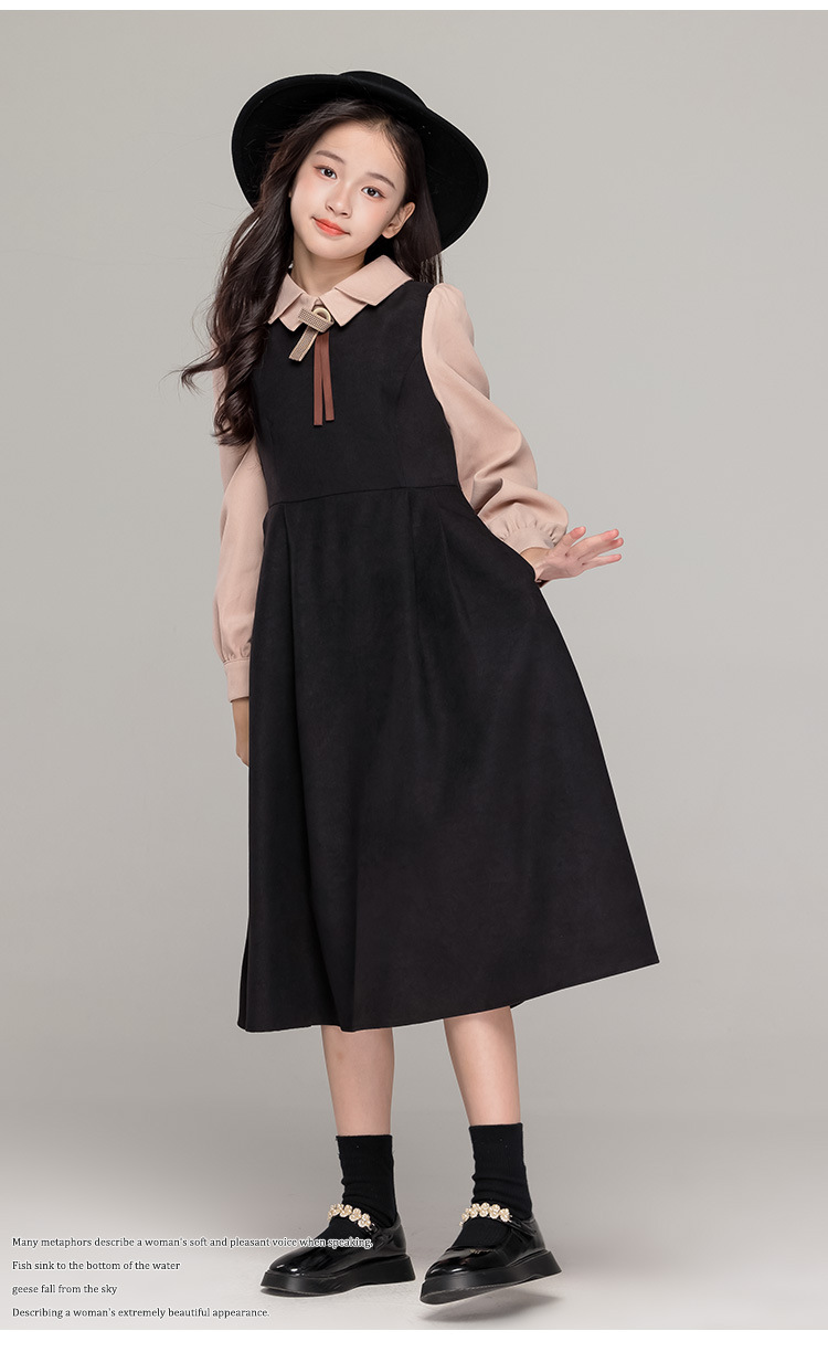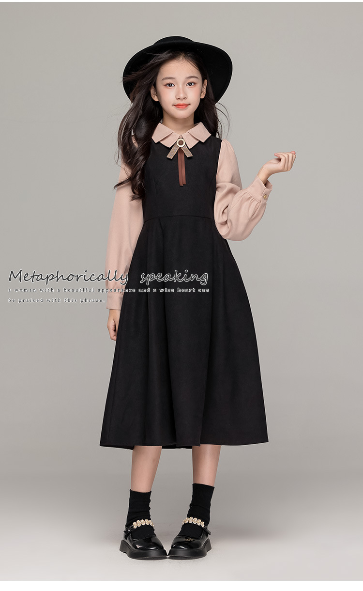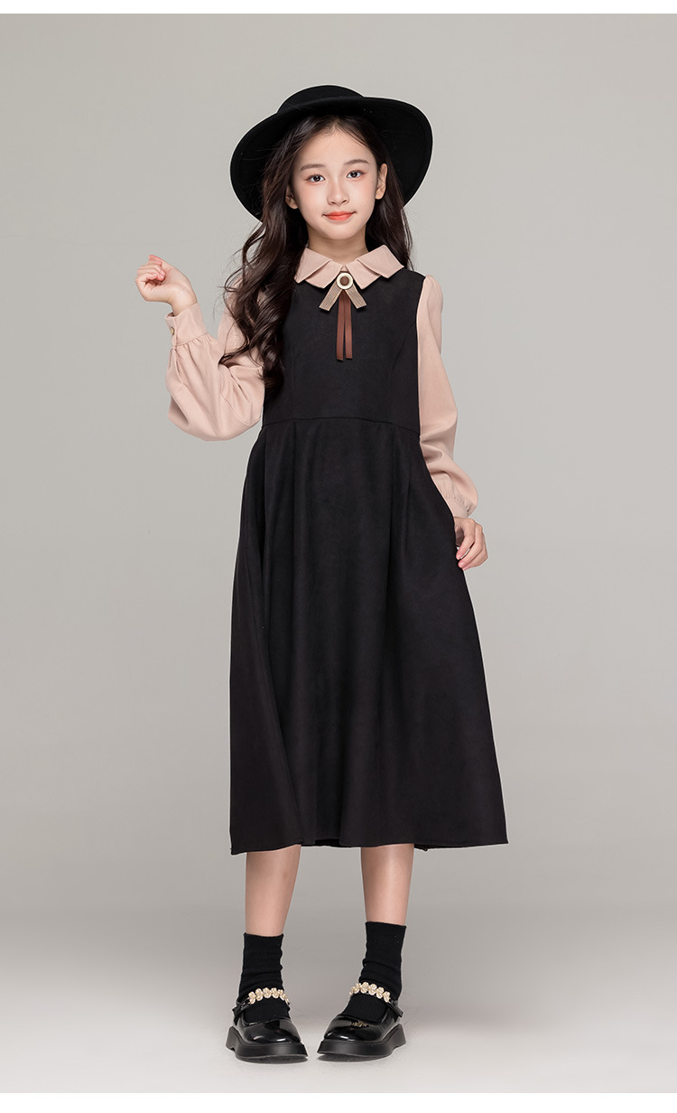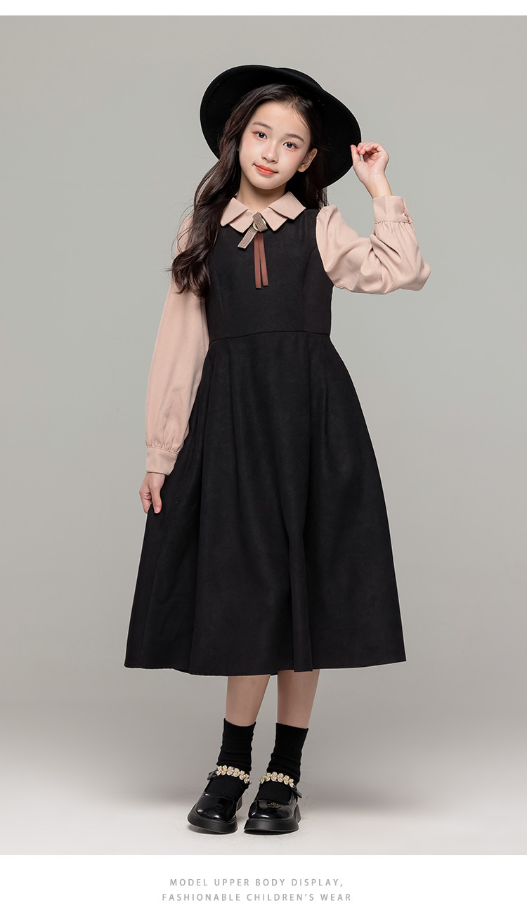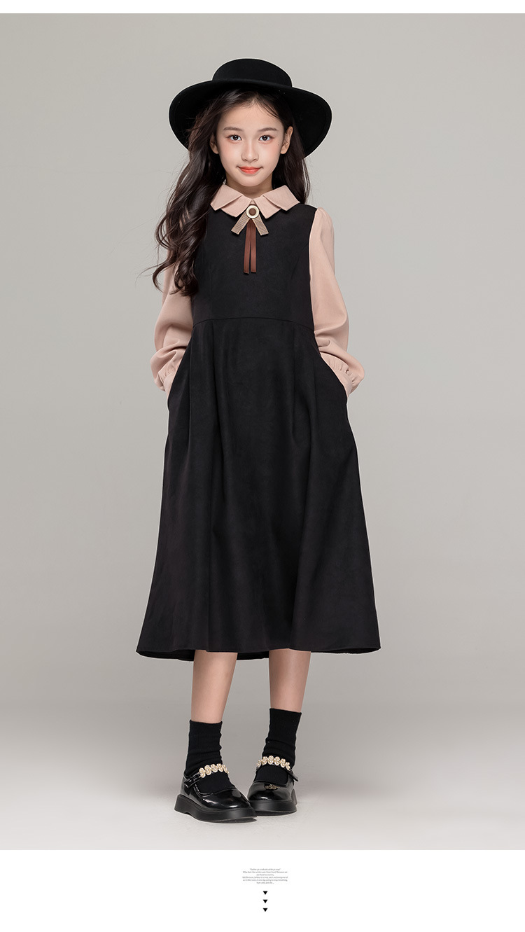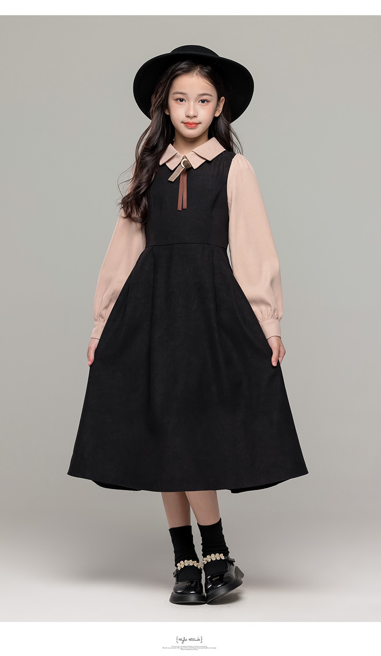 소녀 레트로 레드 원피스 2024 가을/겨울 새로운 더블 칼라 컬러 매칭 허리 페이크 투피스 대학 스타일 롱 원피스스토어 가기