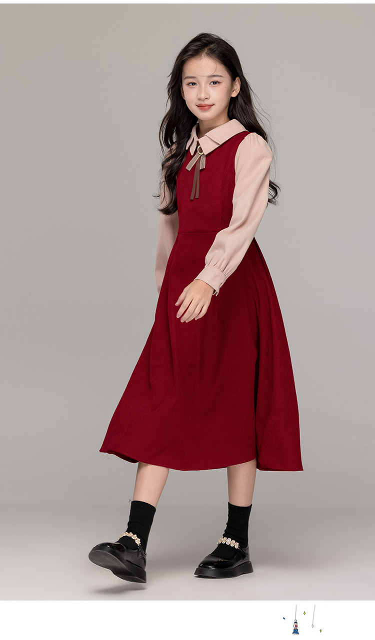 소녀 레트로 레드 원피스 2024 가을/겨울 새로운 더블 칼라 컬러 매칭 허리 페이크 투피스 대학 스타일 롱 원피스