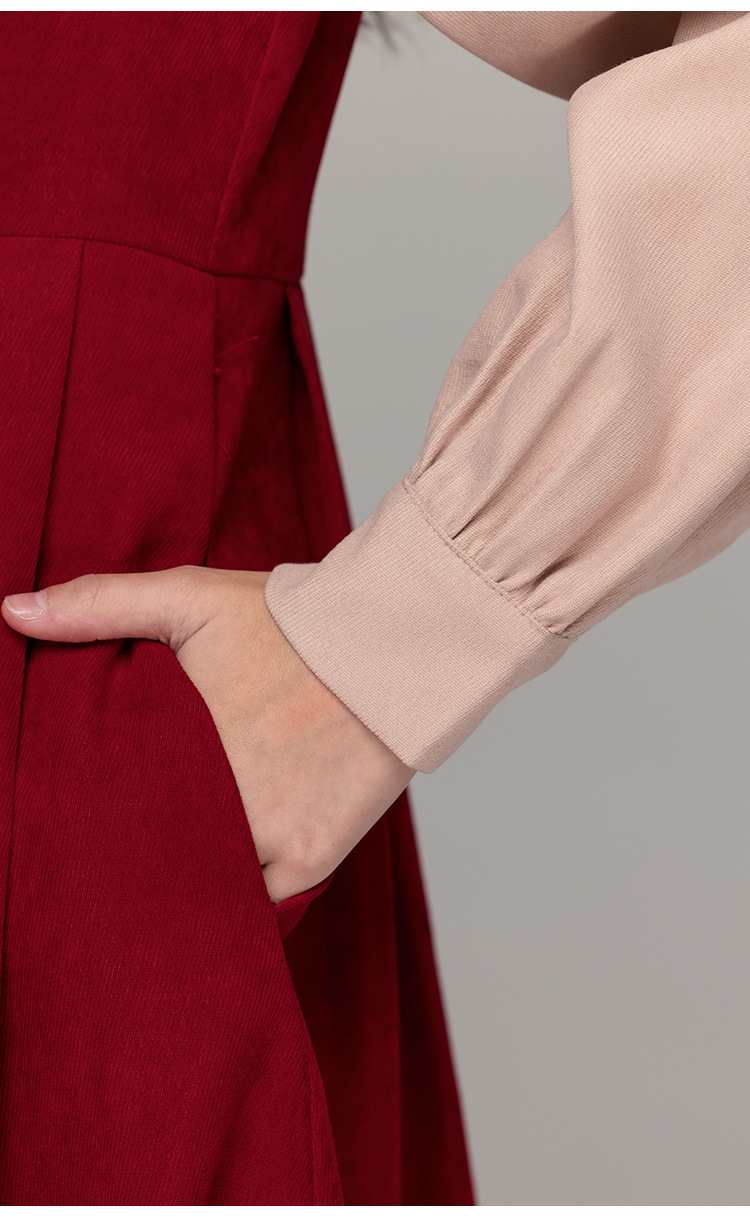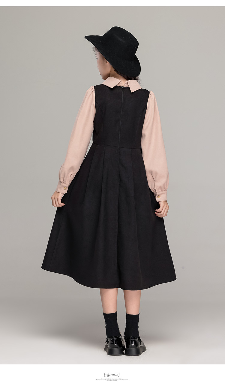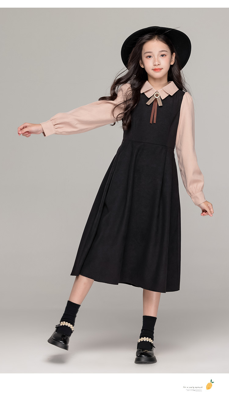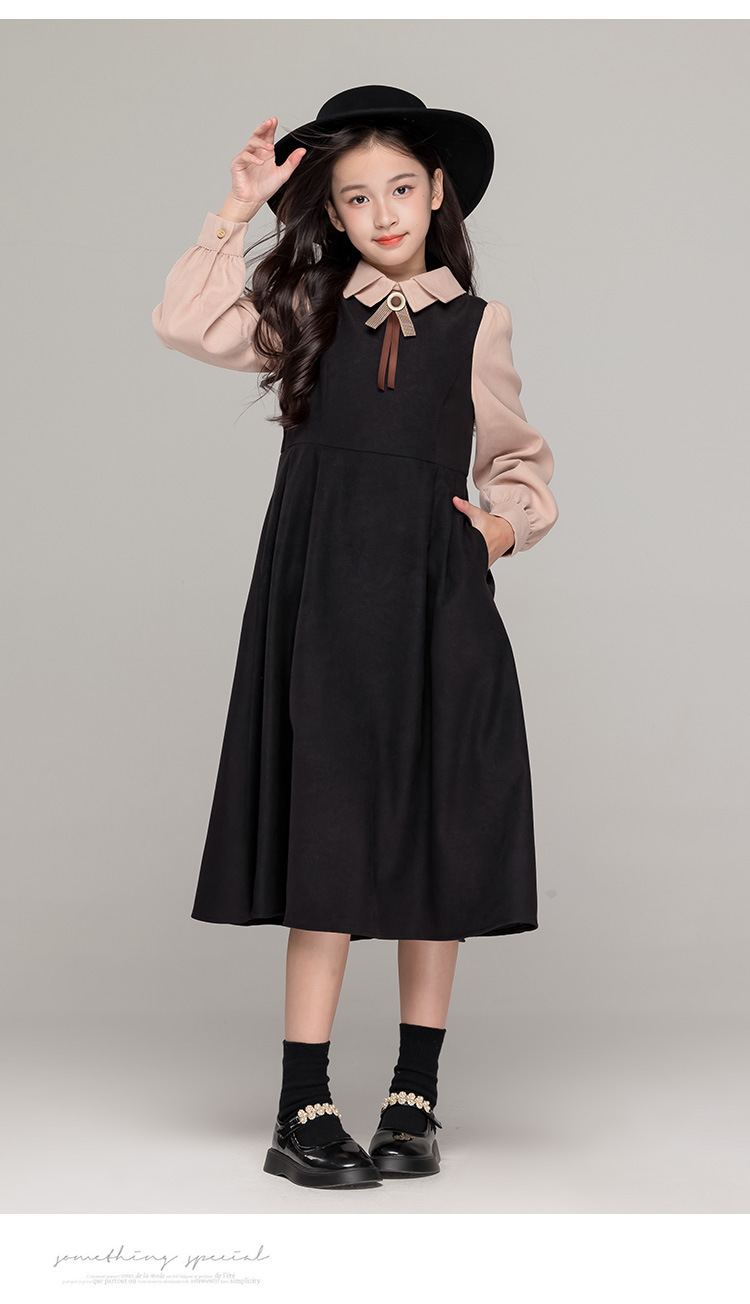 领口、袖子和裙子拼色,假两件的设计,上身收腰显瘦又显气质,建议穿亲子装