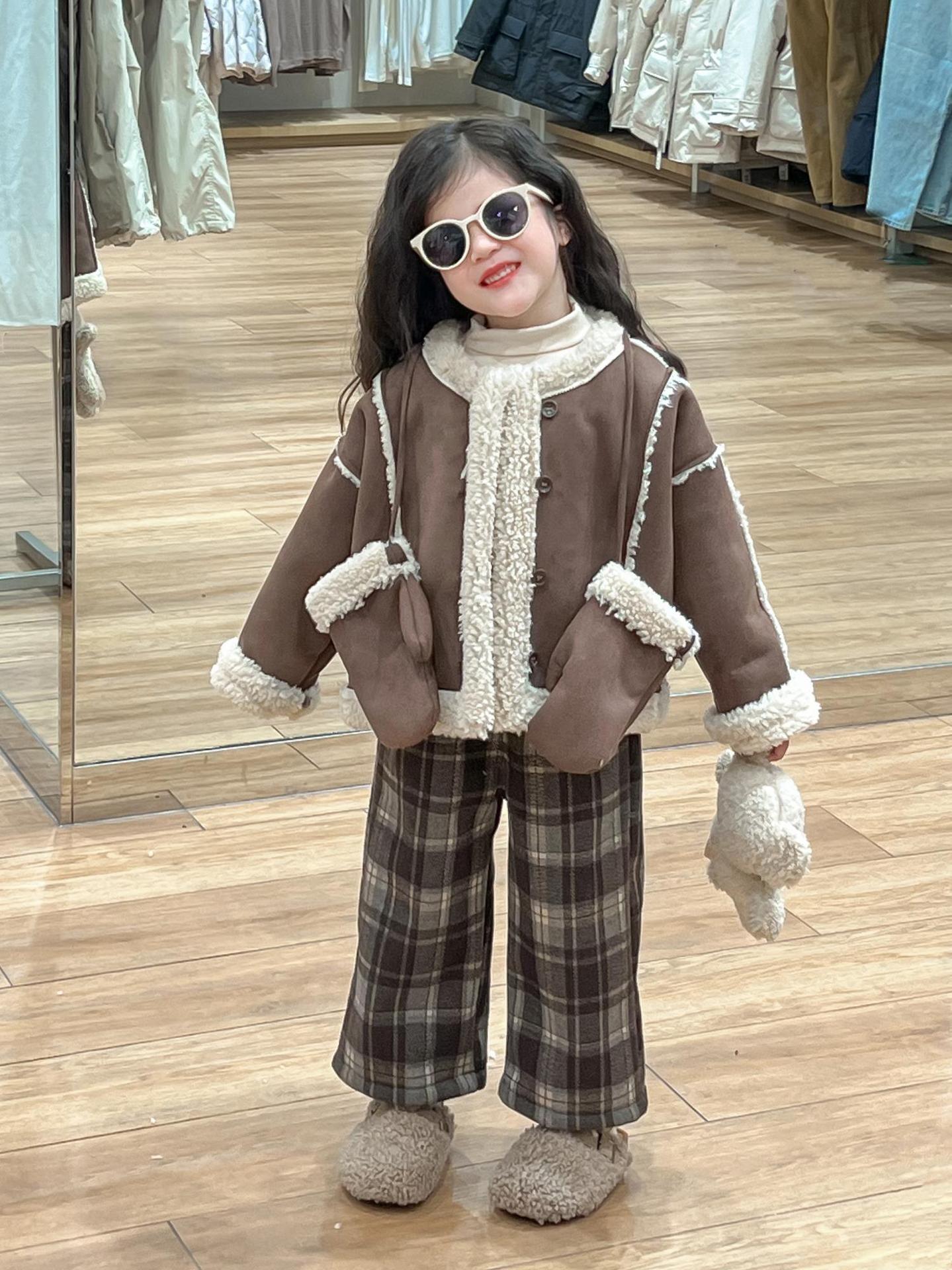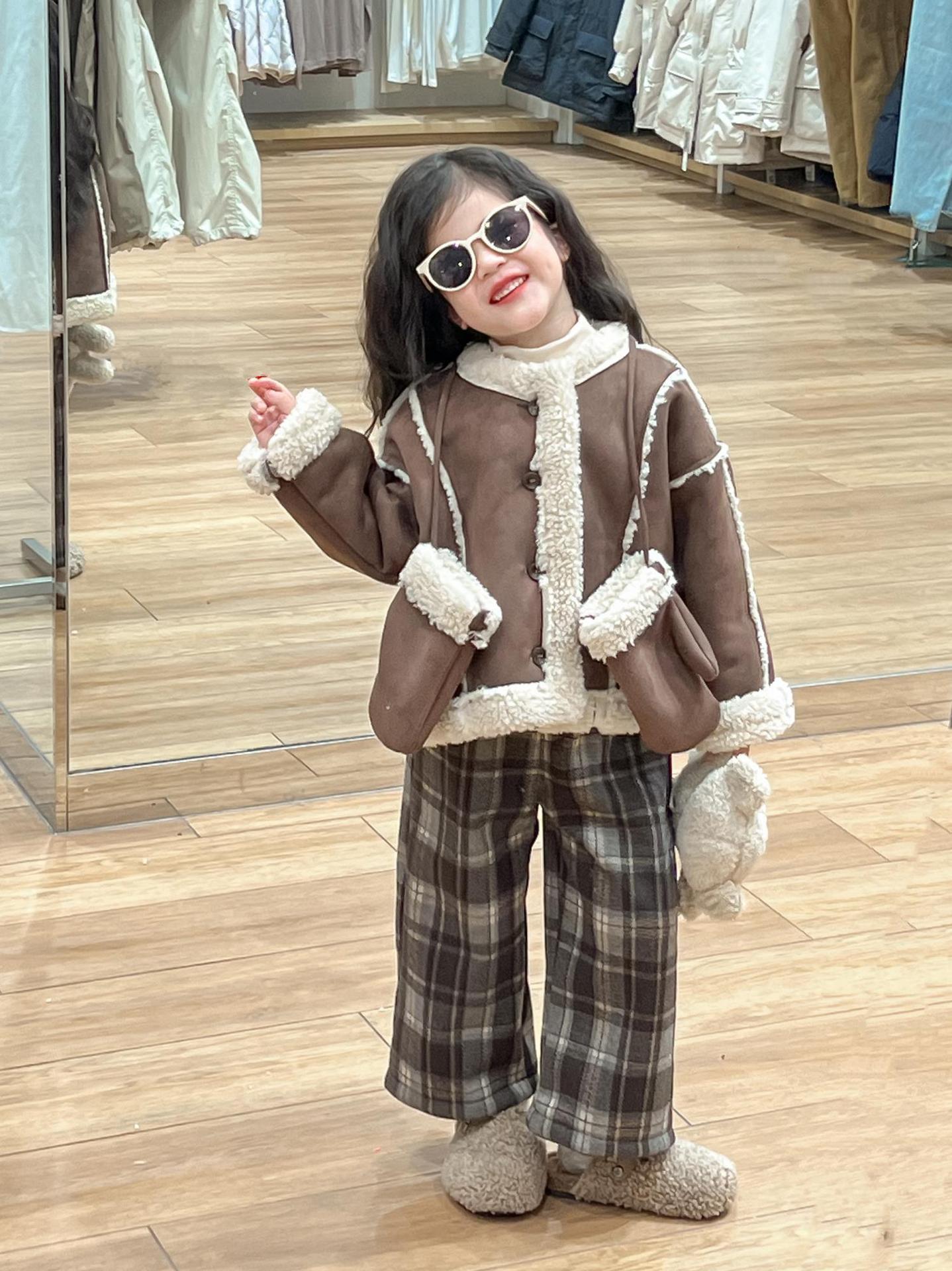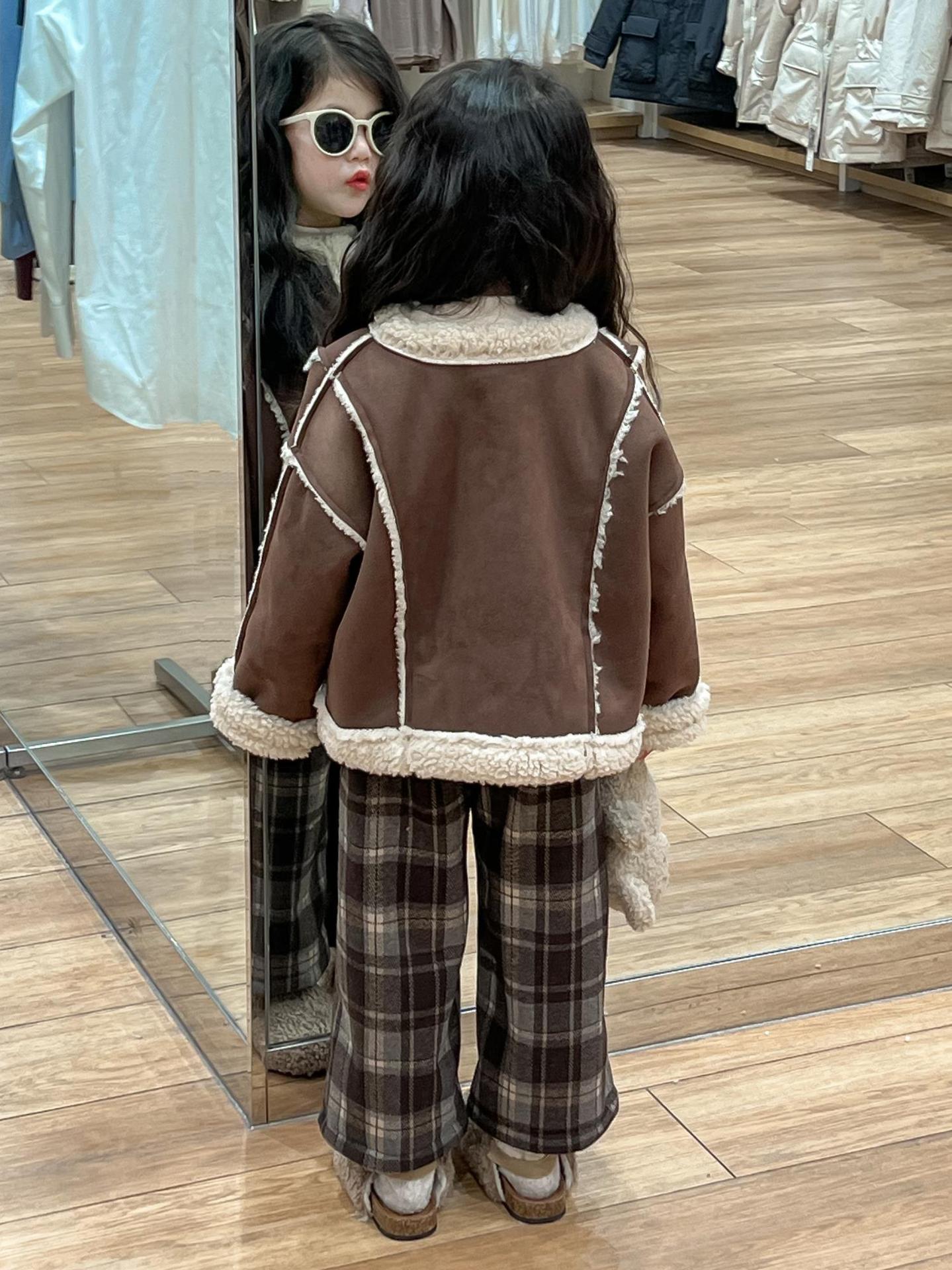 여자 겨울 두꺼운 따뜻한 다크 브라운 스웨이드 모피 원피스 재킷 장갑과 격자 무늬 바지 싱글 비트스토어 가기