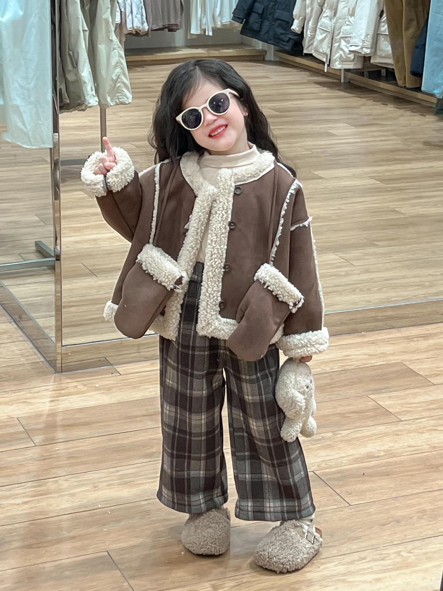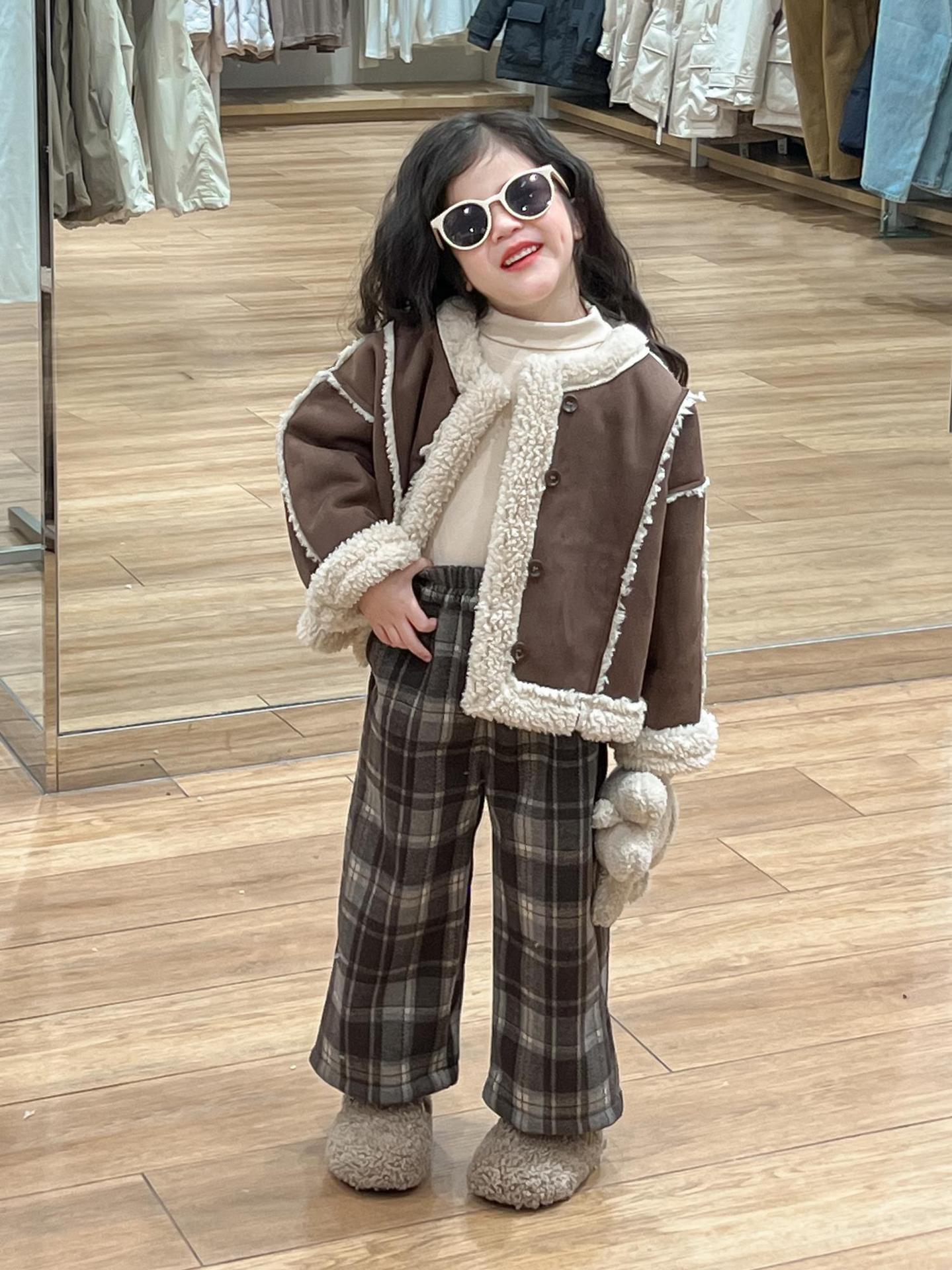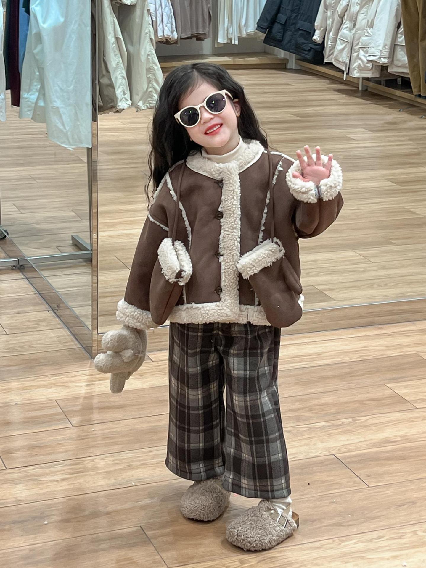 여자 겨울 두꺼운 따뜻한 다크 브라운 스웨이드 모피 원피스 재킷 장갑과 격자 무늬 바지 싱글 비트스토어 가기