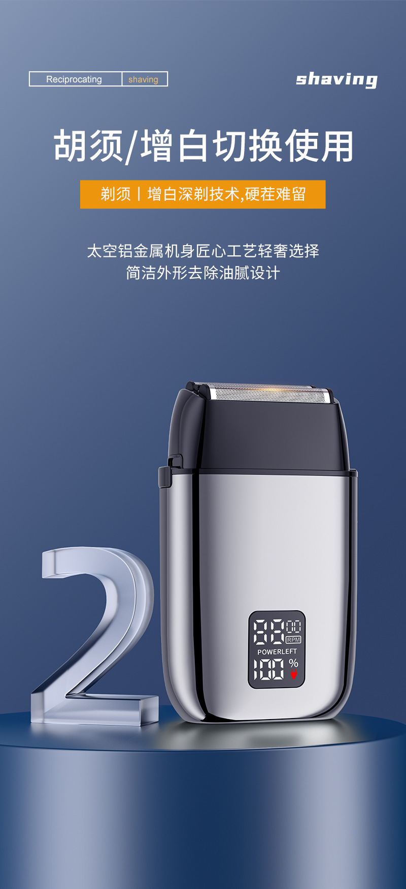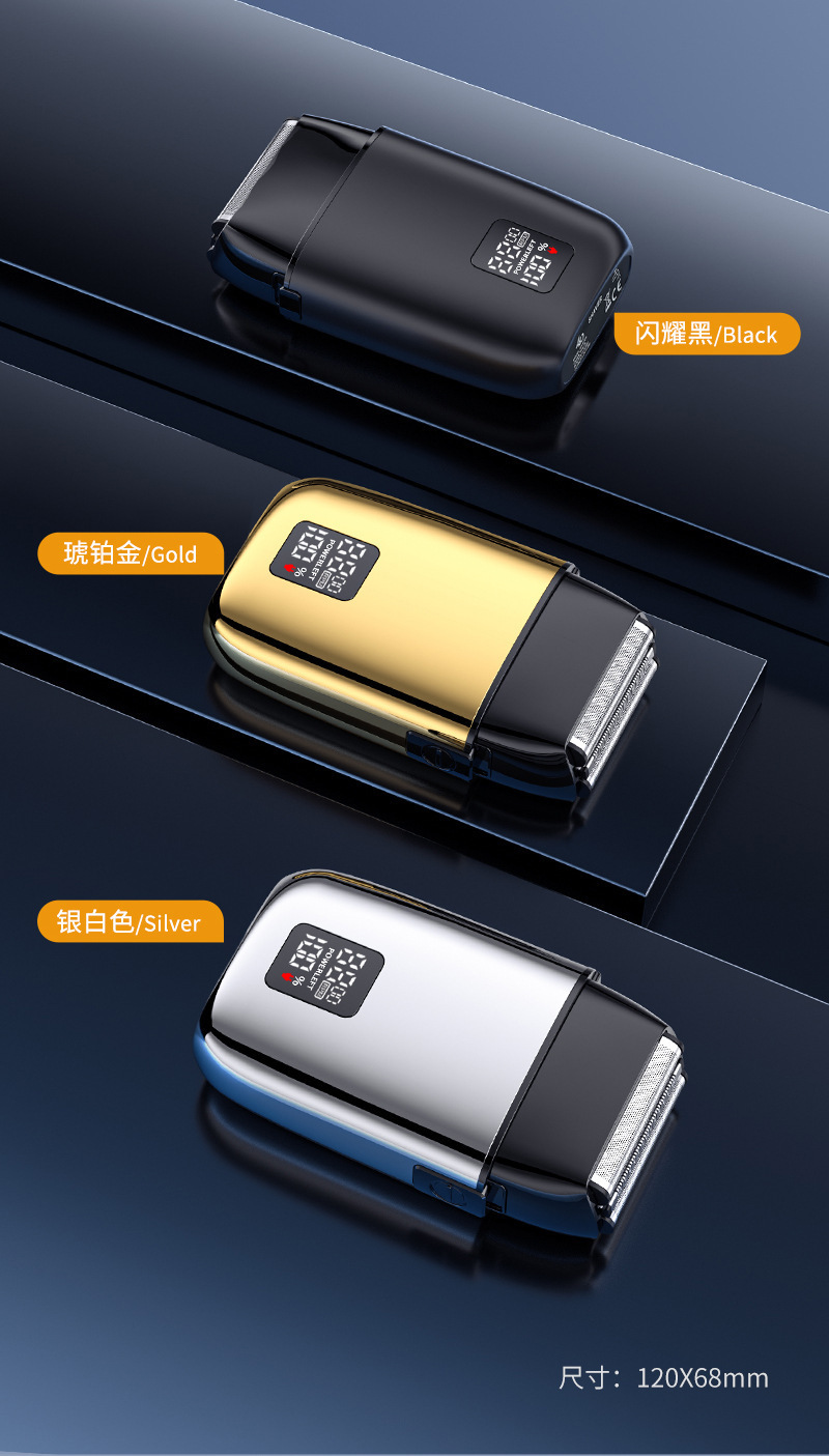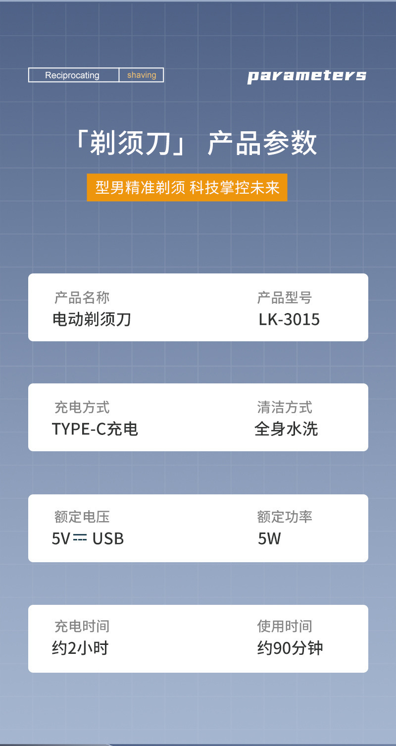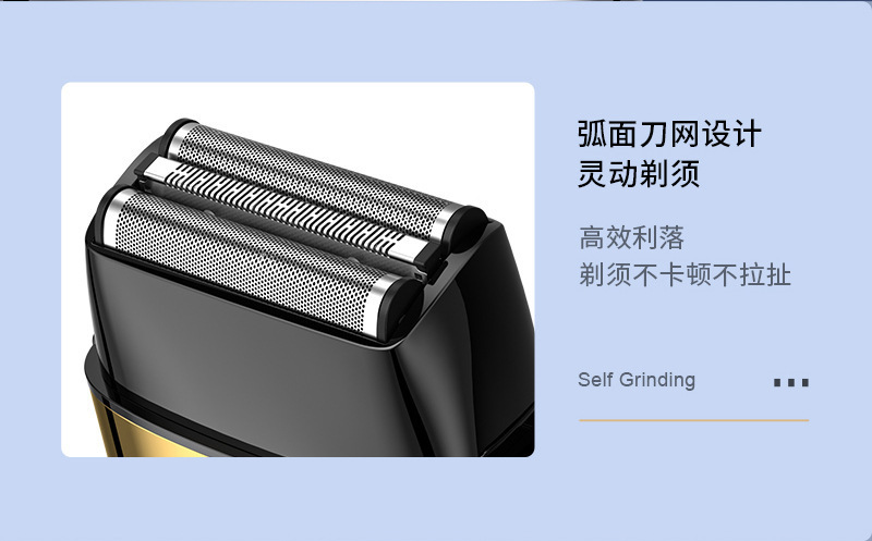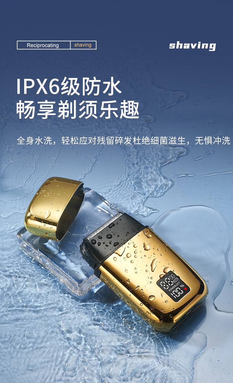 产品卖点:全身水洗 全金属机身 液晶电量显示 双往复式刀头 可替换刀头