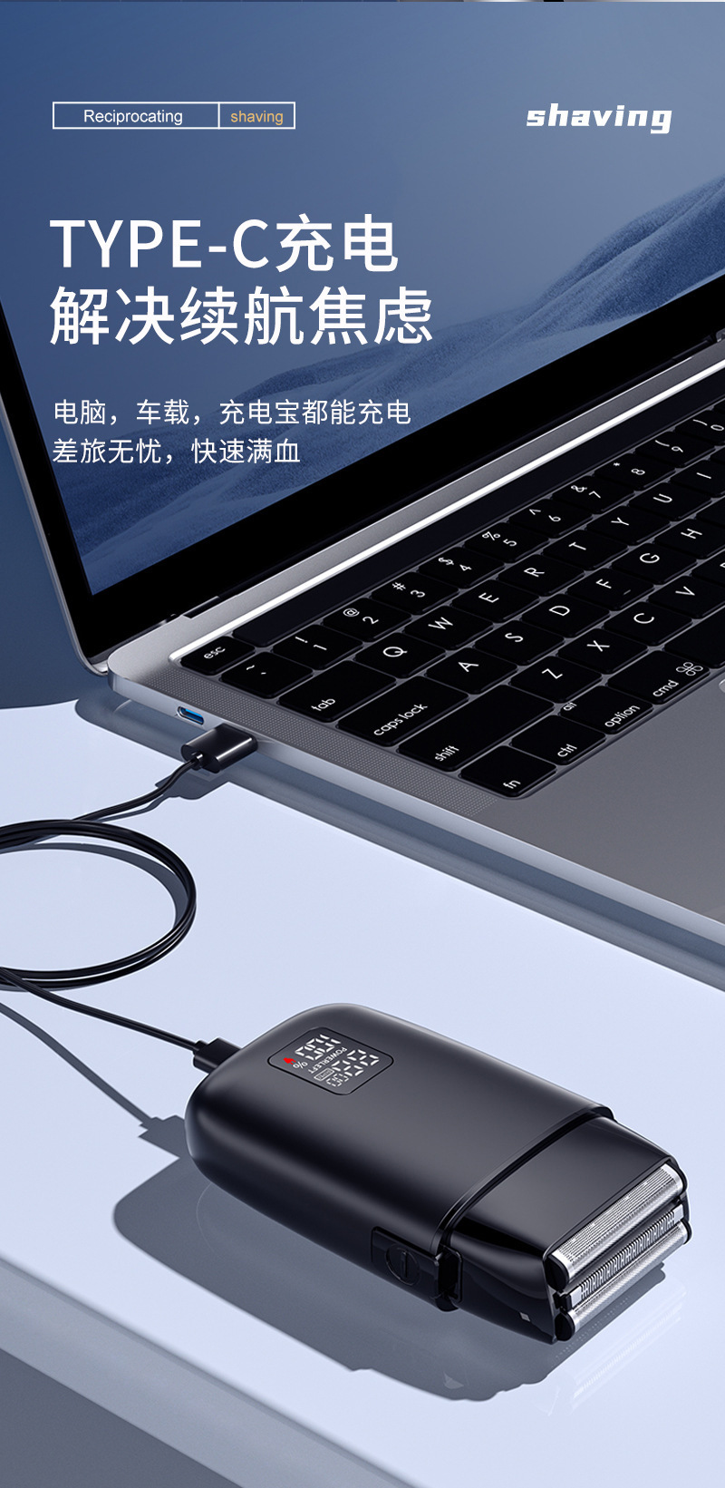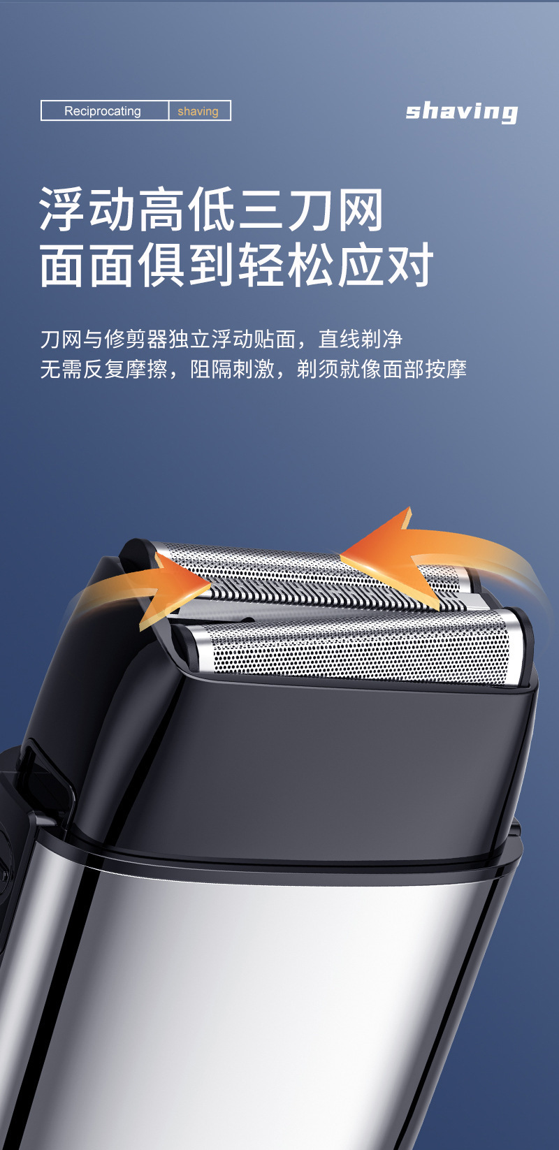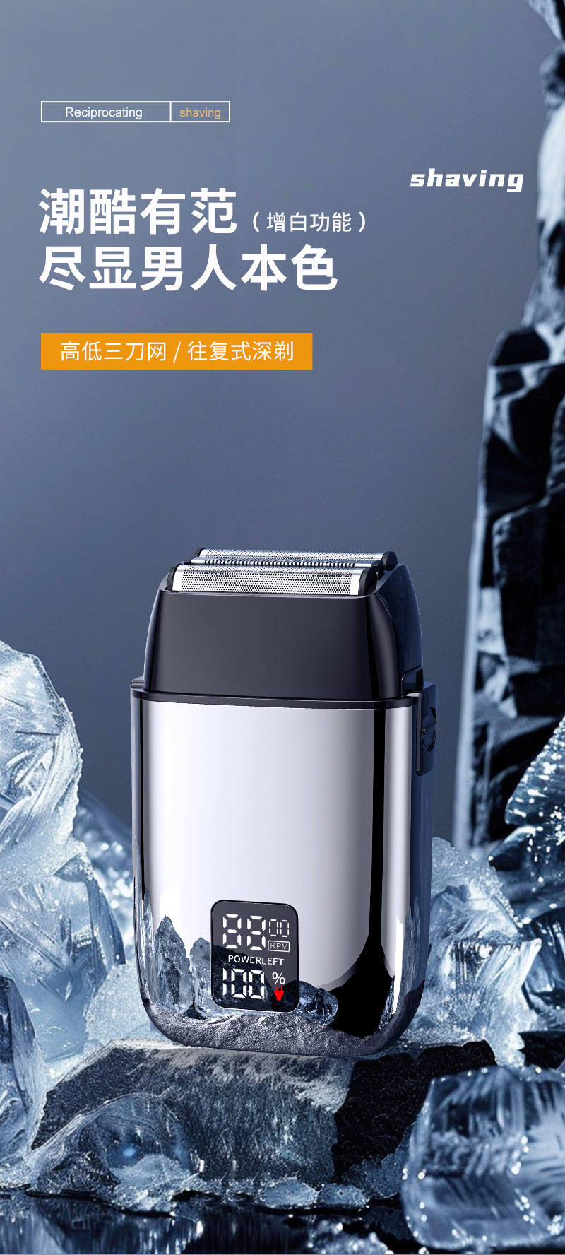 产品卖点:全身水洗 全金属机身 液晶电量显示 双往复式刀头 可替换刀头