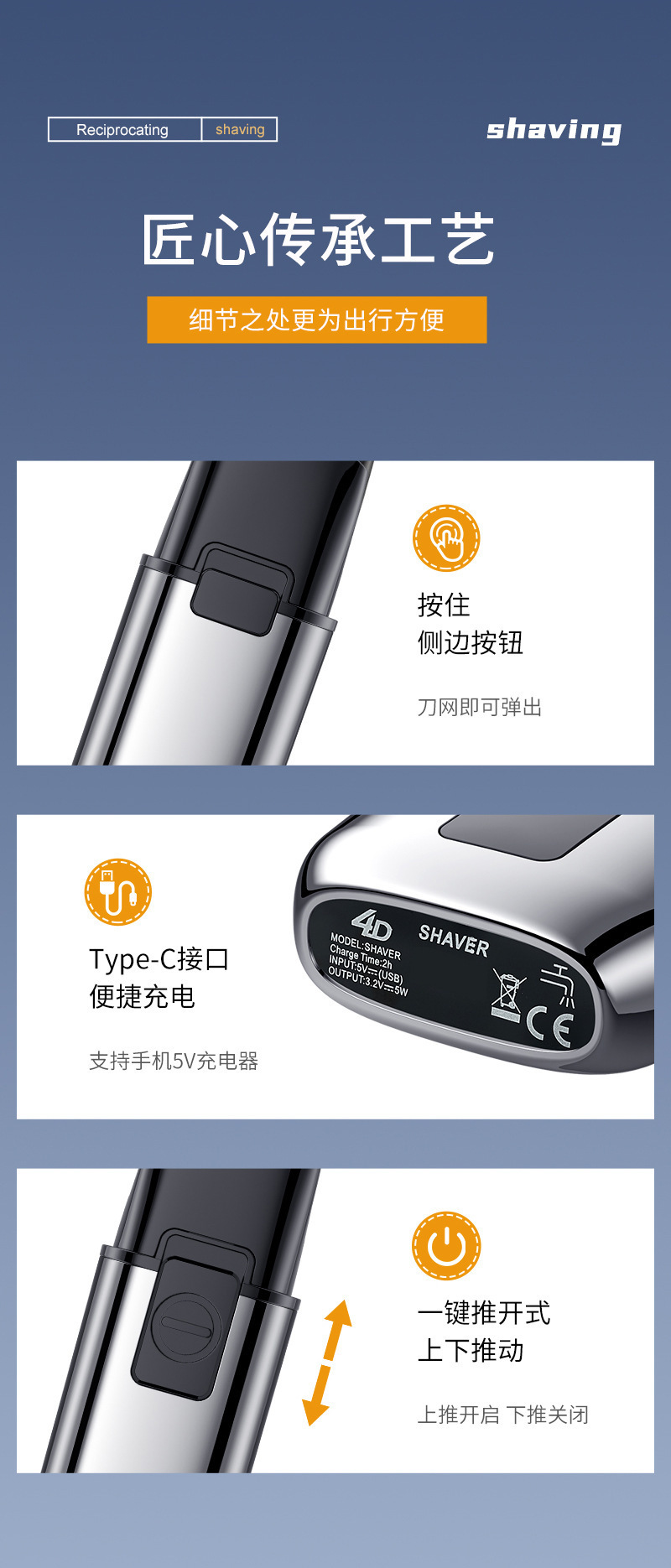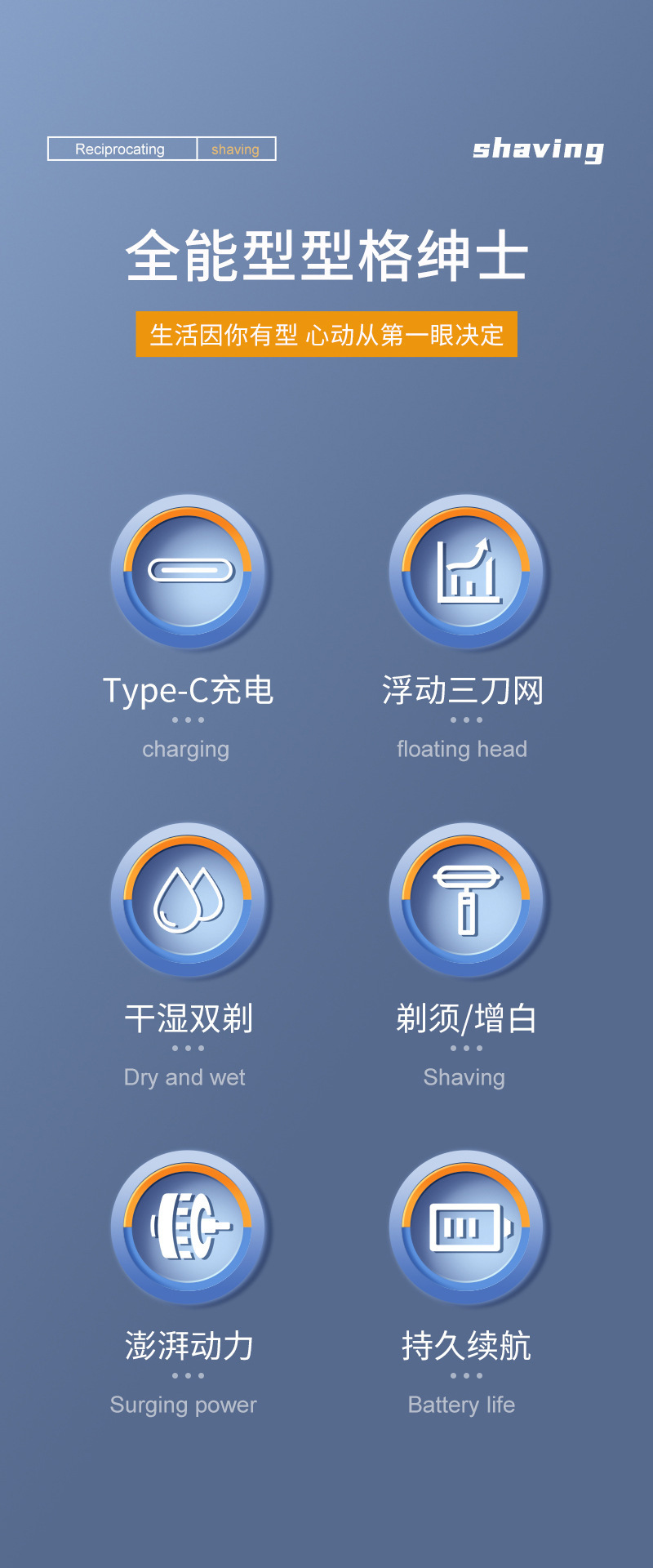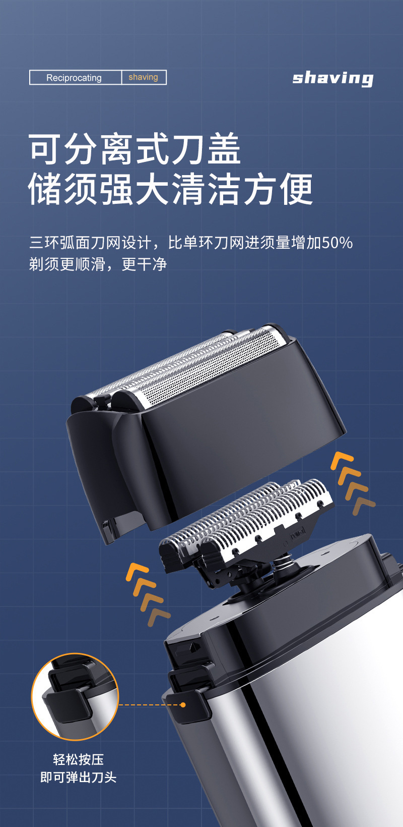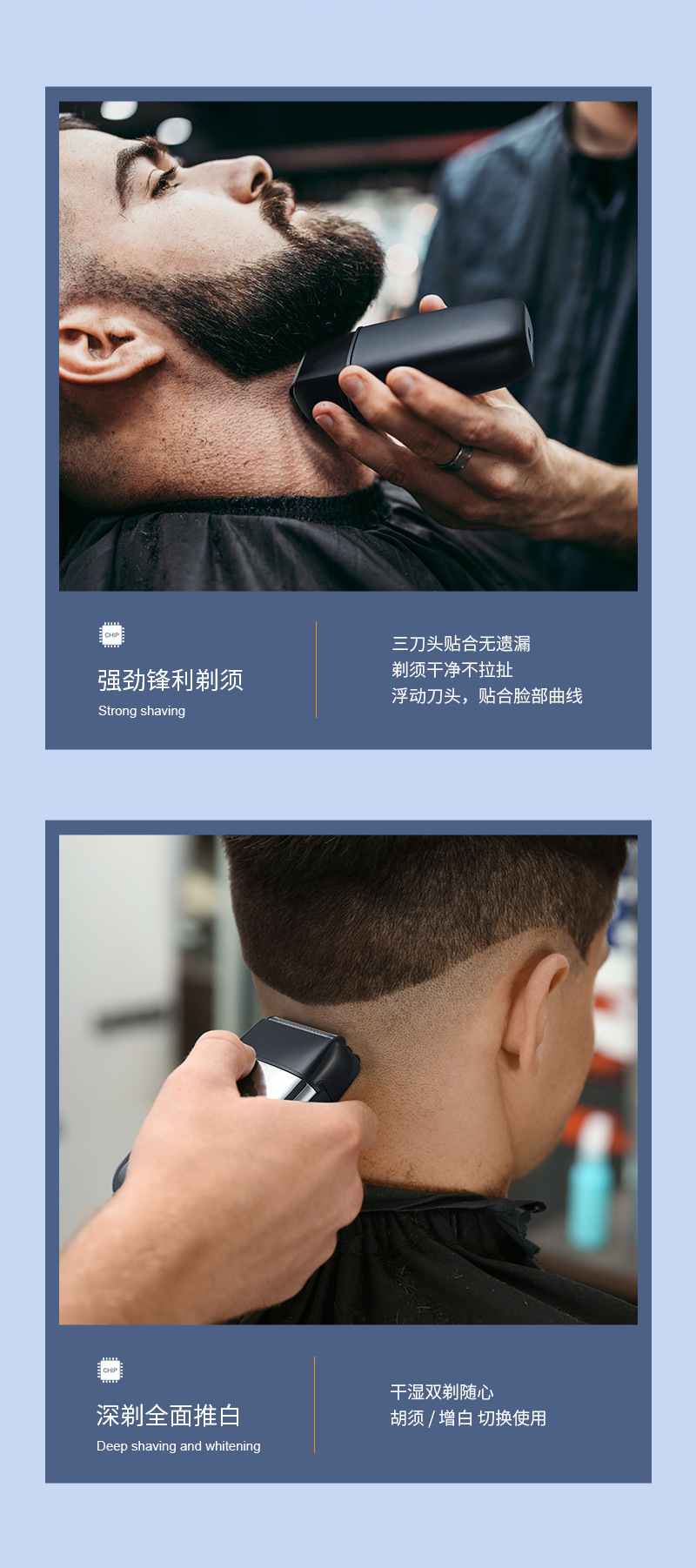 产品卖点:全身水洗 全金属机身 液晶电量显示 双往复式刀头 可替换刀头
