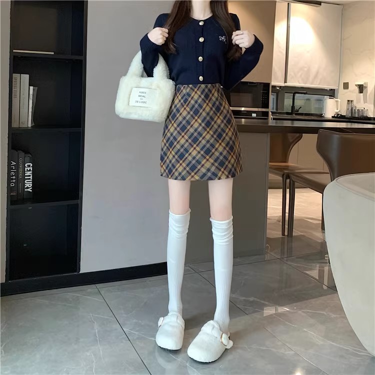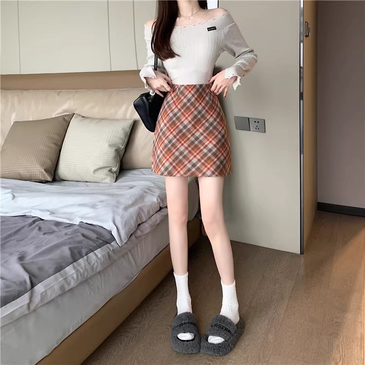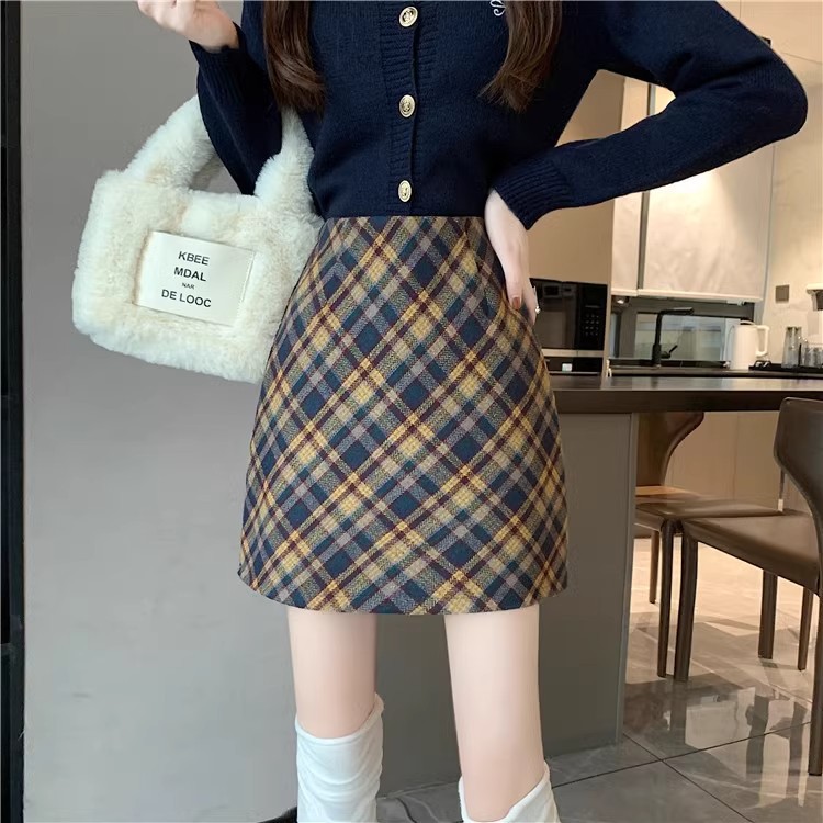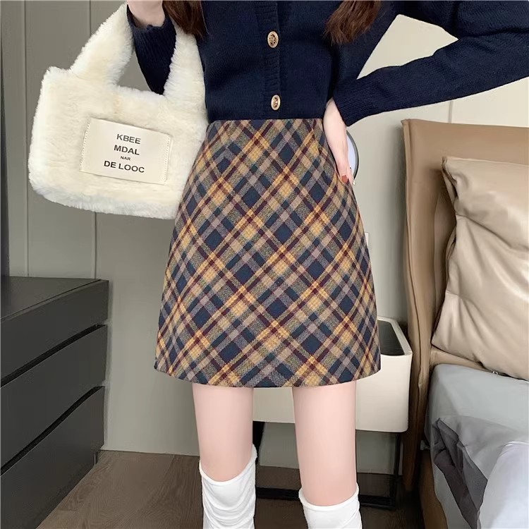 Longfengni | 2 색 가을과 겨울 양모 새로운 스타일의 체크 무늬 스커트 빈티지 짧은 스커트 하이 웨이스트 슬림 스커트스토어 가기