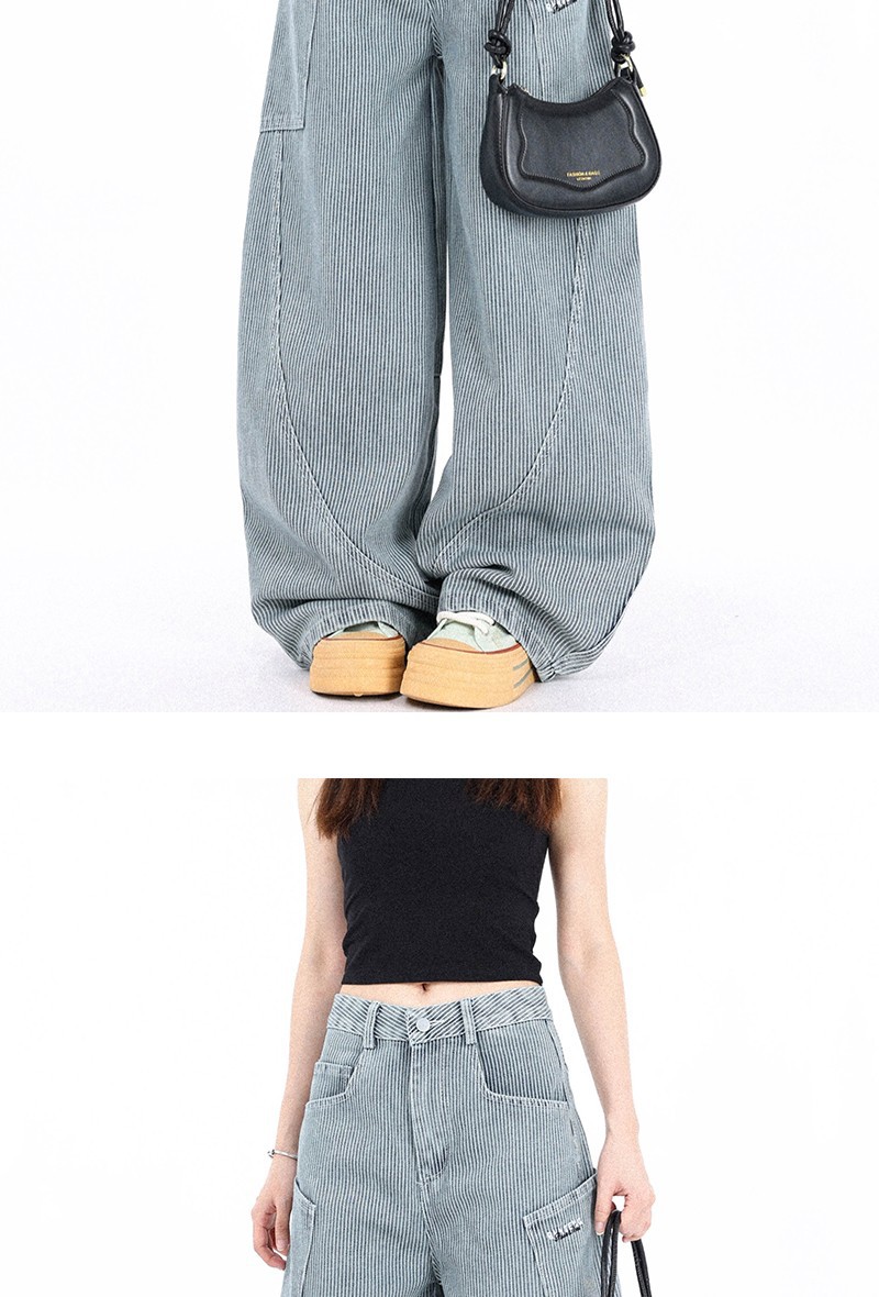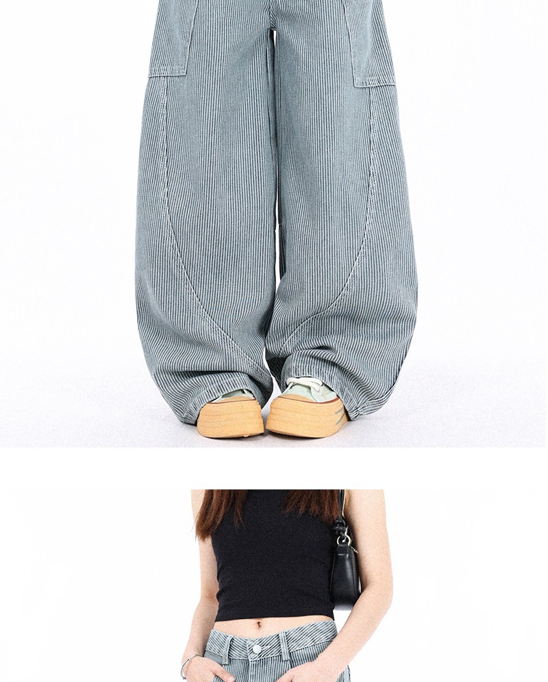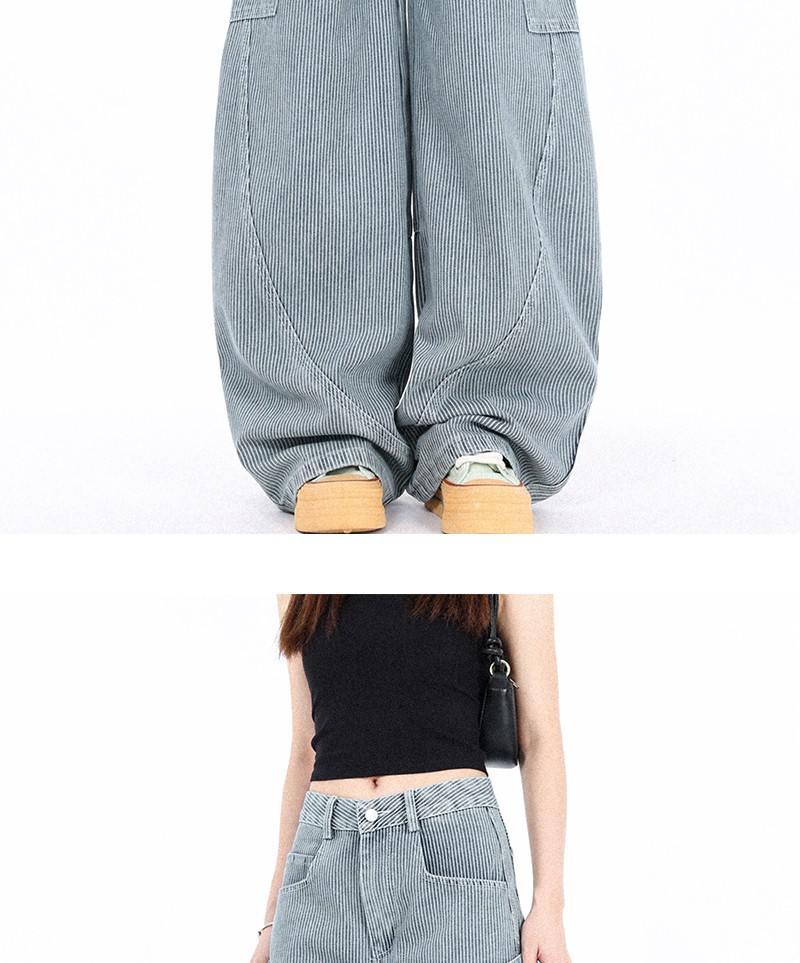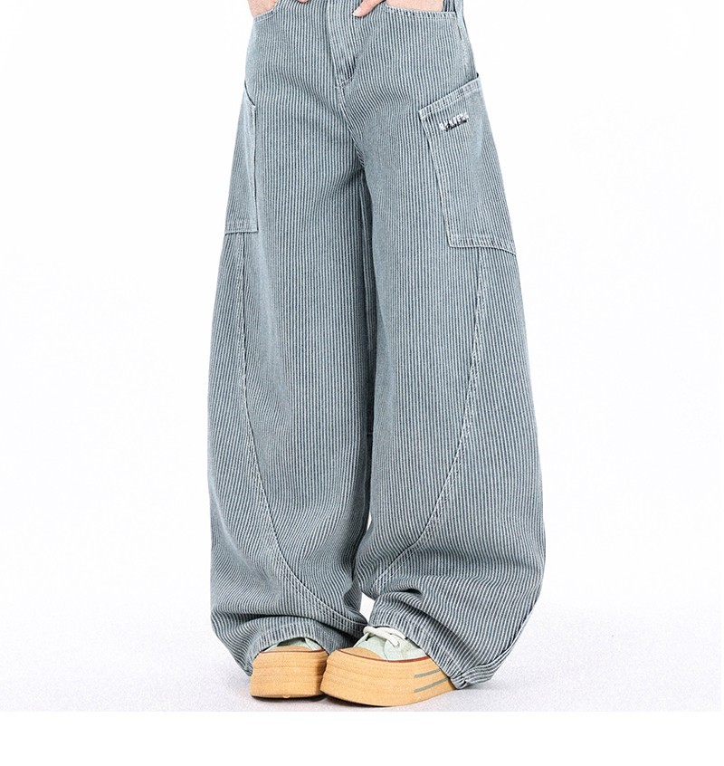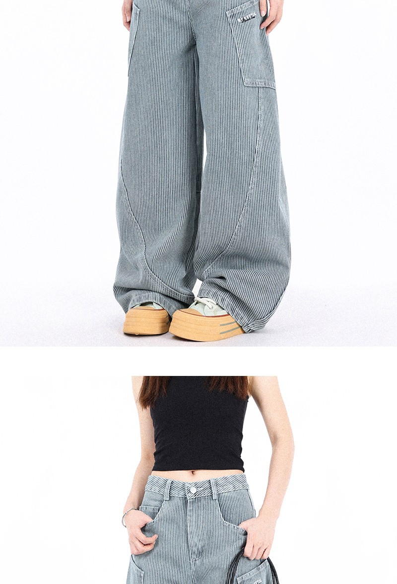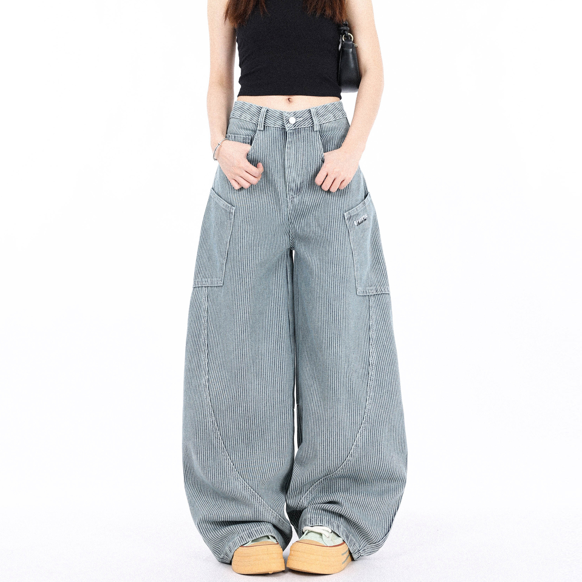 여자를위한 큰 주머니를 가진 줄무늬 Machete 바지 느슨한 캐주얼 펜던트 넓은 다리 바지 미국 스타일 레트로 올 매치 청바지