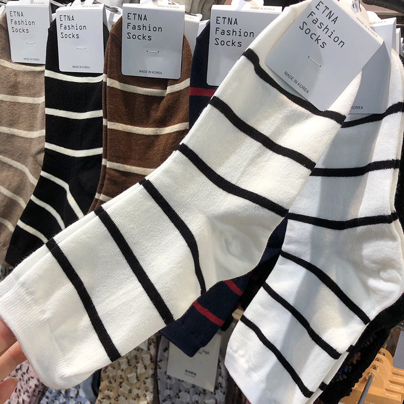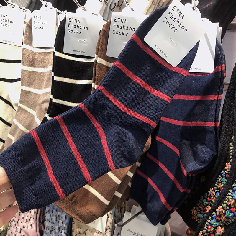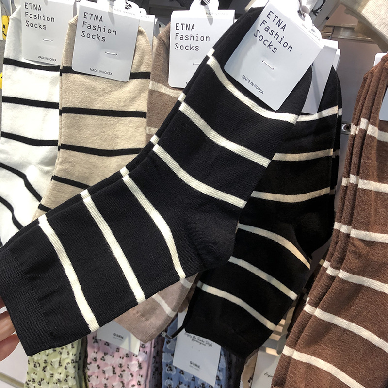한국 가을과 겨울 새로운 양말 ETNA 핀스트라이프 미우 소녀 튜브 양말 Maillard 다크 브라운 기질면 양말스토어 가기