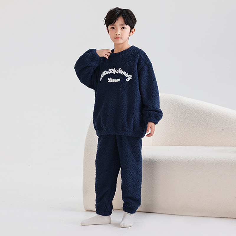 큰 아이들을위한 두꺼운 따뜻한 산호 양털 파자마 기모 가을과 겨울 둥근 목 세트 소년 소녀 플란넬 홈 옷