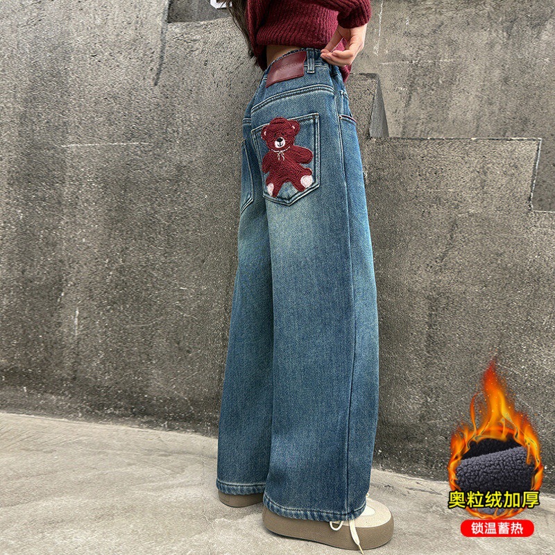 여아용 데님 팬츠 가을옷 2025 신상 중대형 아동용 세련된 가을 겨울 기모 루즈핏 스트레이트 와이드 팬츠